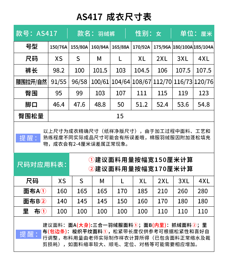 裁缝学苑AS417三防工装羽绒裤纸样女装外穿新款防寒阔腿棉裤样板