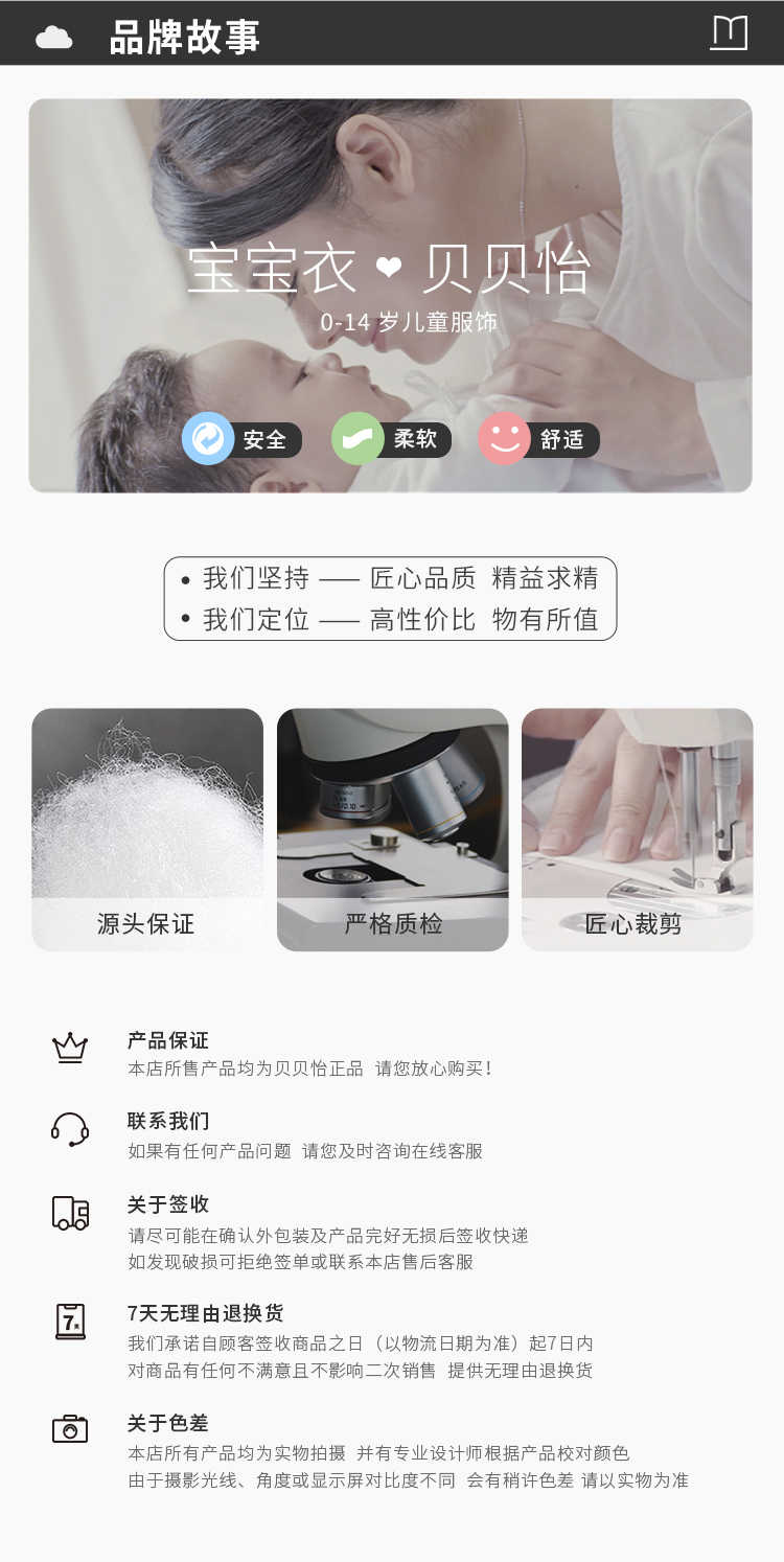 - 贝贝怡专注0-6岁婴幼儿服饰,坚持安全、柔软、舒适的产品理念,为千万中国家庭提供超高品质、安全可靠的婴幼儿服饰产品,妈妈放心,宝宝开心!