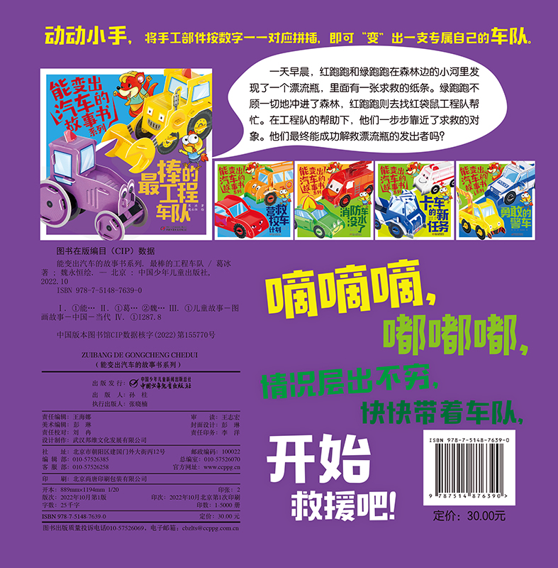 《能变出汽车的故事书系列·最棒的工程车队》适读年龄3-6岁,嘀嘀嘀,嘟嘟嘟,情况层出不穷,带着压路机鸭鸭和挖土机挖挖出发救援吧!