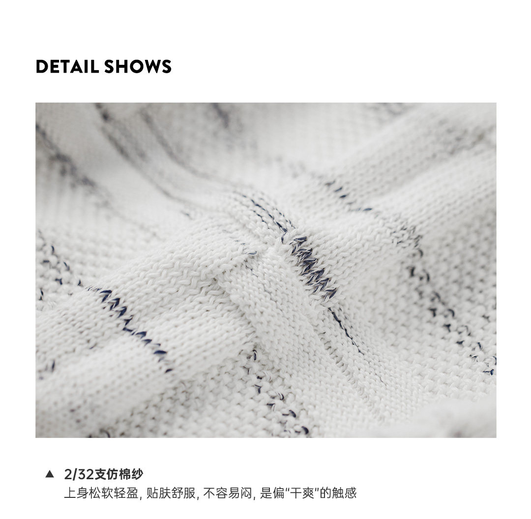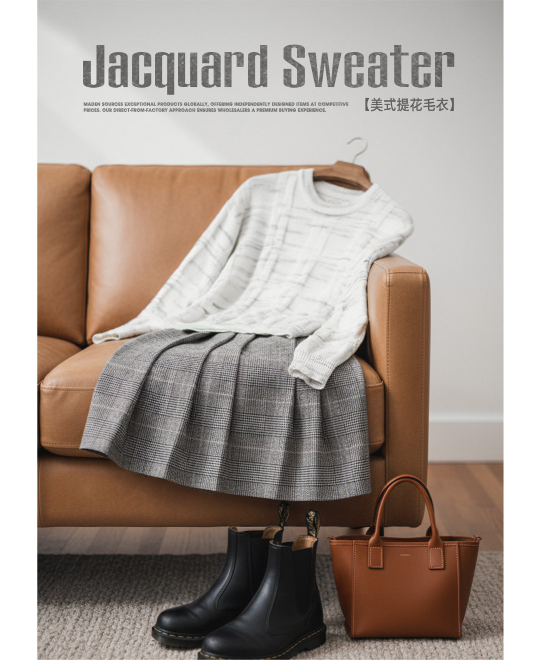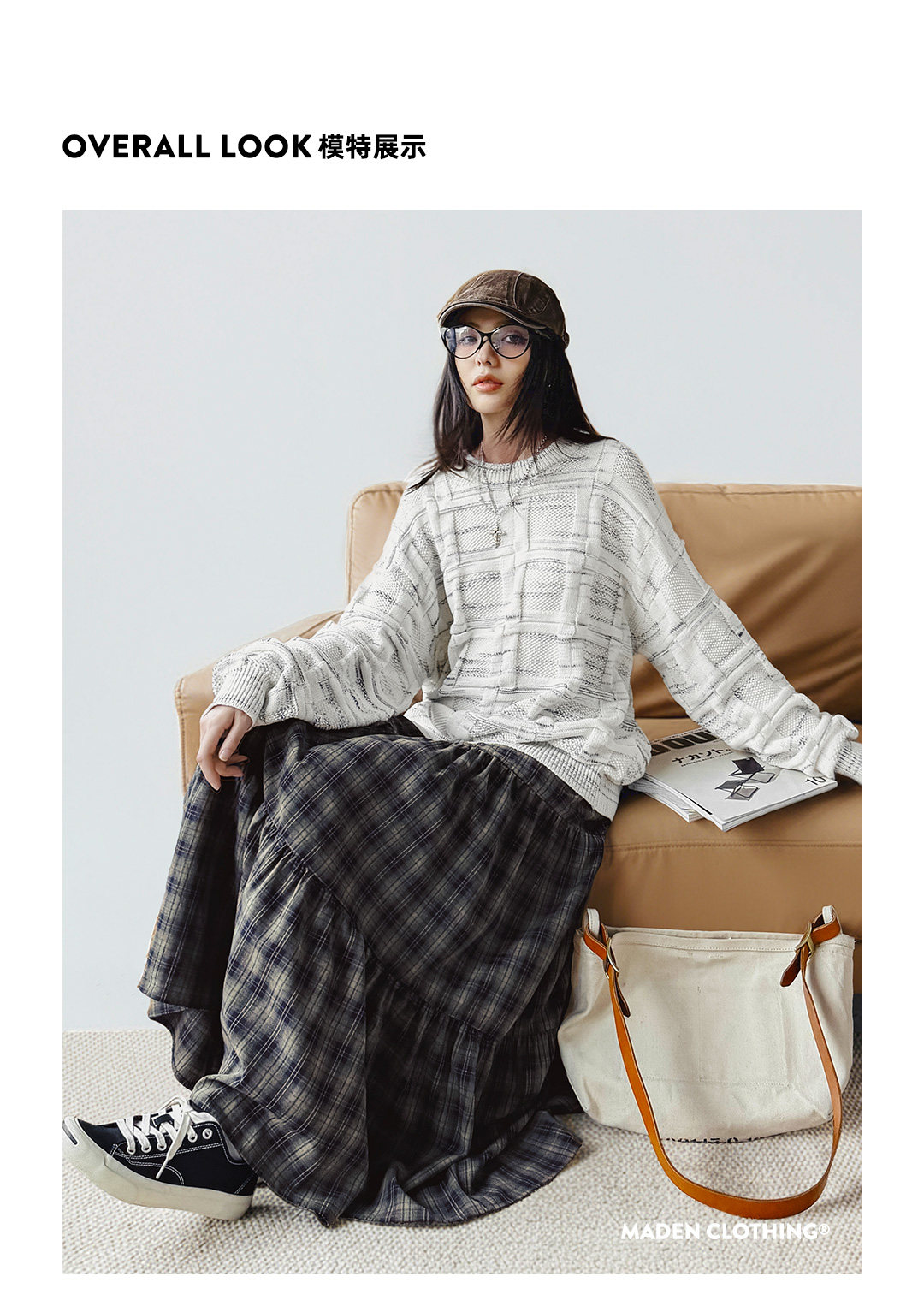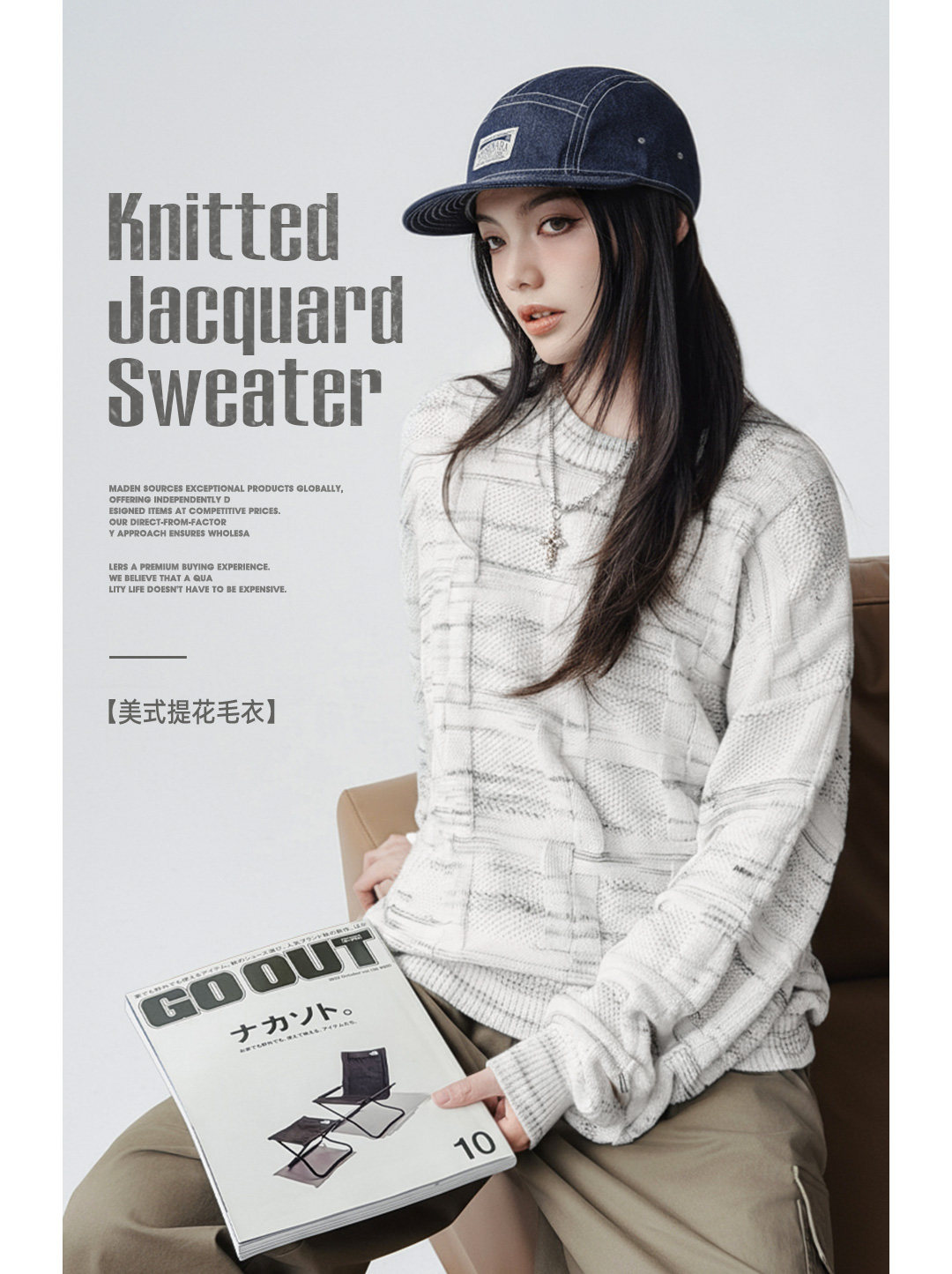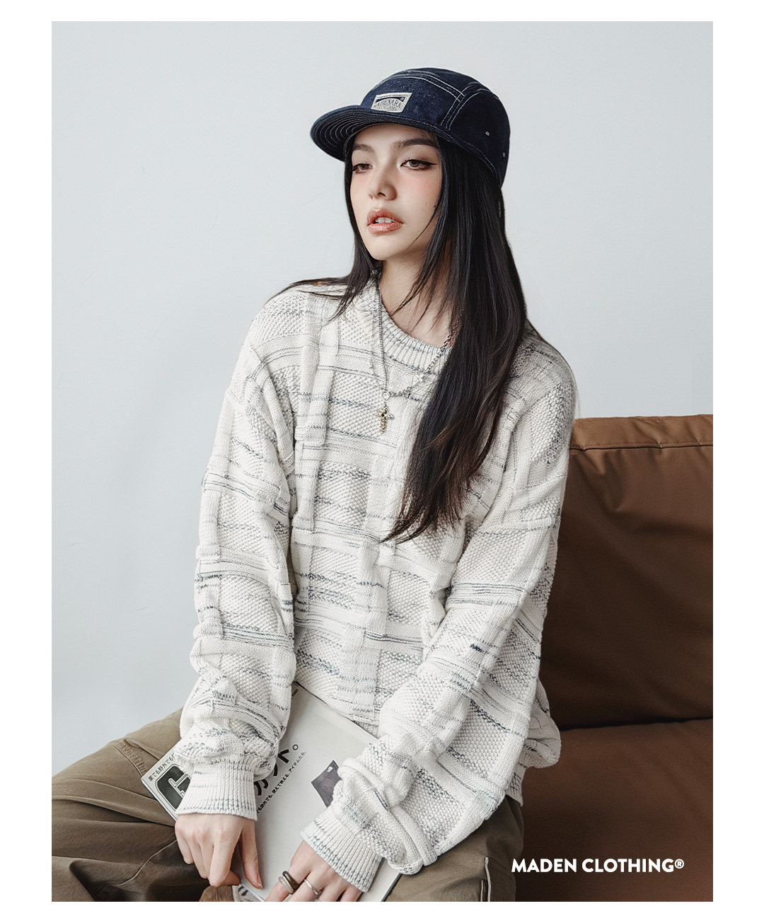 马登美式复古宽松肌理感圆领套头撞色针织条纹提花内搭毛衣女士春