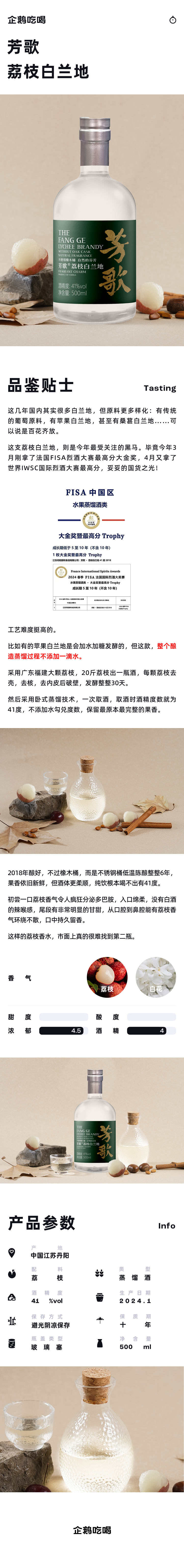 企鹅市集|国际金奖高分 芳歌 荔枝白兰地500ml 不加水不加糖 20斤荔枝酿造