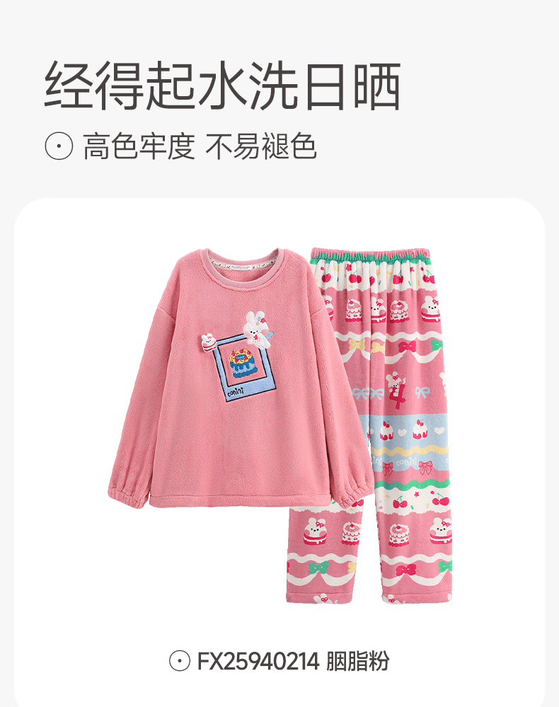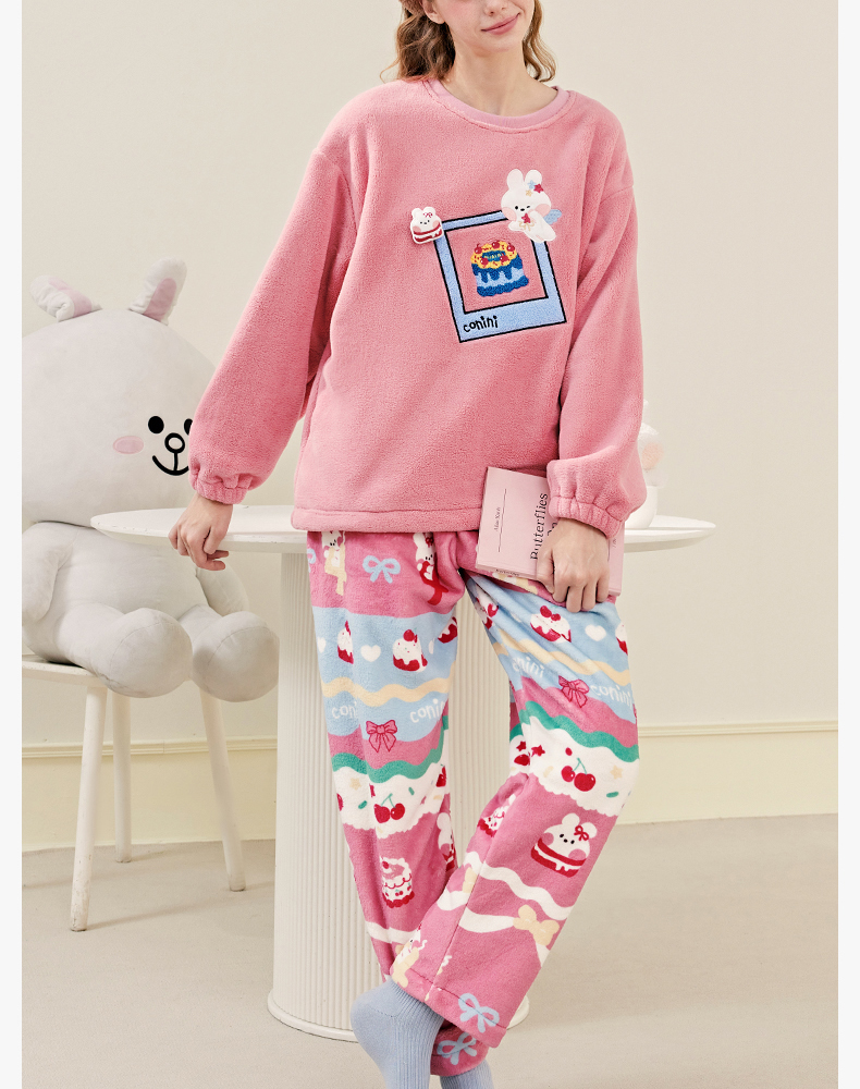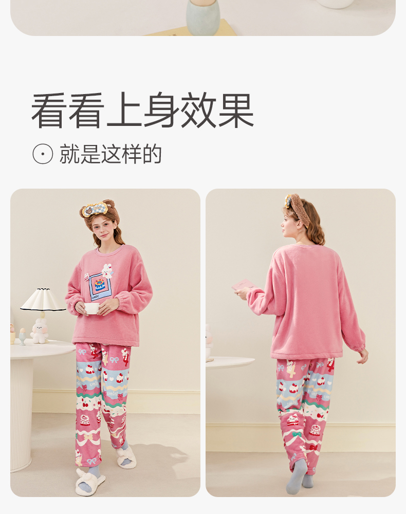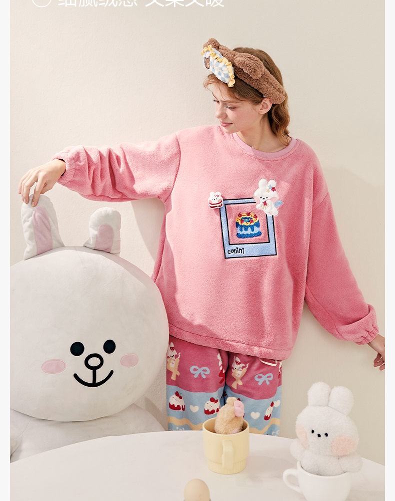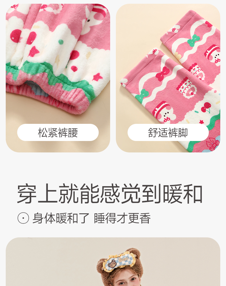 芬腾珊瑚绒女士睡衣秋冬加绒加厚保暖布朗熊套装法兰绒大码家居服