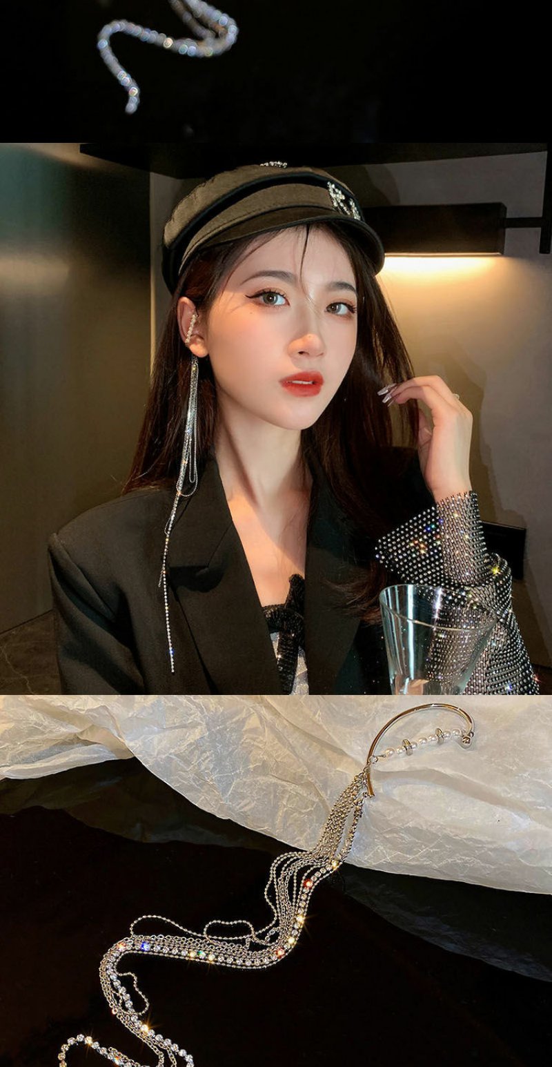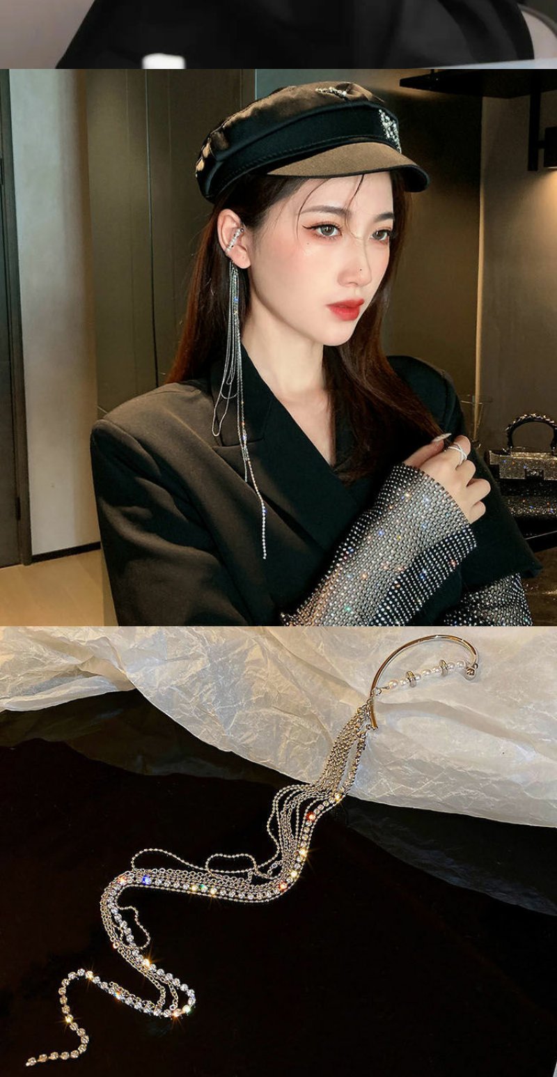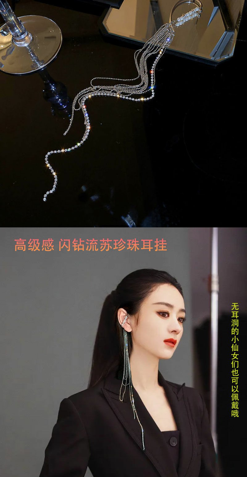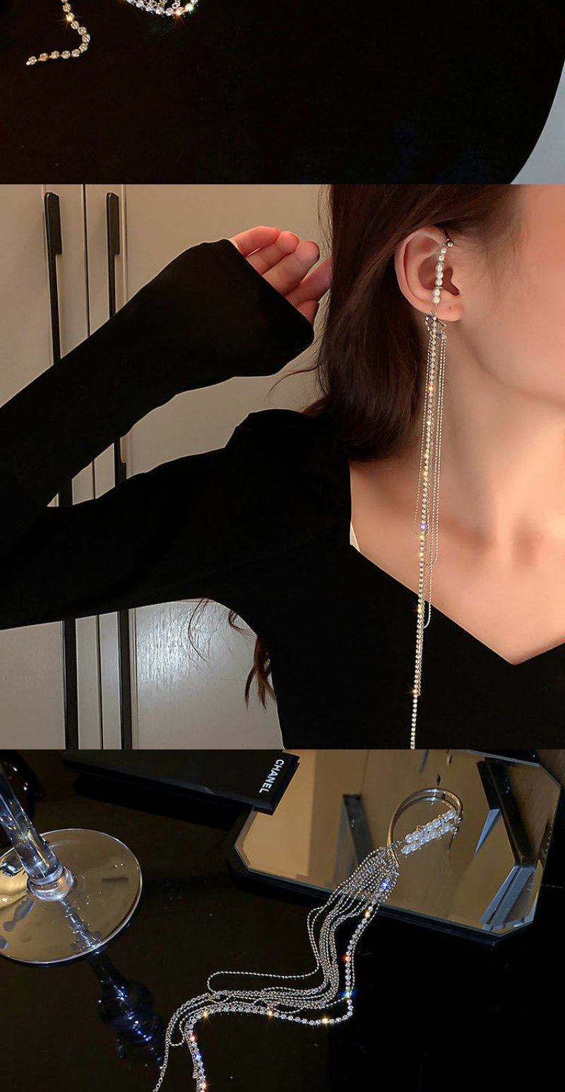 远方情新款超长镶钻流苏耳挂小众设计冷淡风无耳洞超仙耳环E1158
