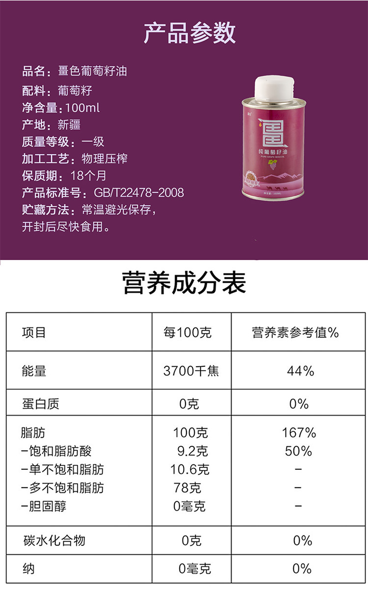 【配料】畺色纯葡萄籽油:葡萄籽