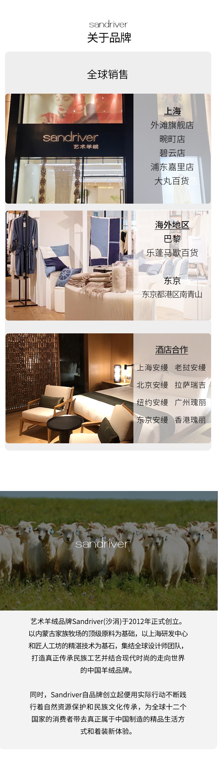 历年在巴黎时装周亮相,享誉世界的艺术羊绒品牌[Sandriver 沙涓]由羊绒布道者郭秀玲女士创立。阿拉善自有牧场纯种羔羊绒,日本国宝设计师小筱顺子,上海自有基地精工细作。承载羊绒情怀,坚持匠人品质。