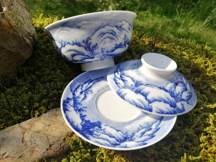 发色幽蓝,手绘线条工整细腻流畅,山水画面意境很美,品质优良,手感也很好。