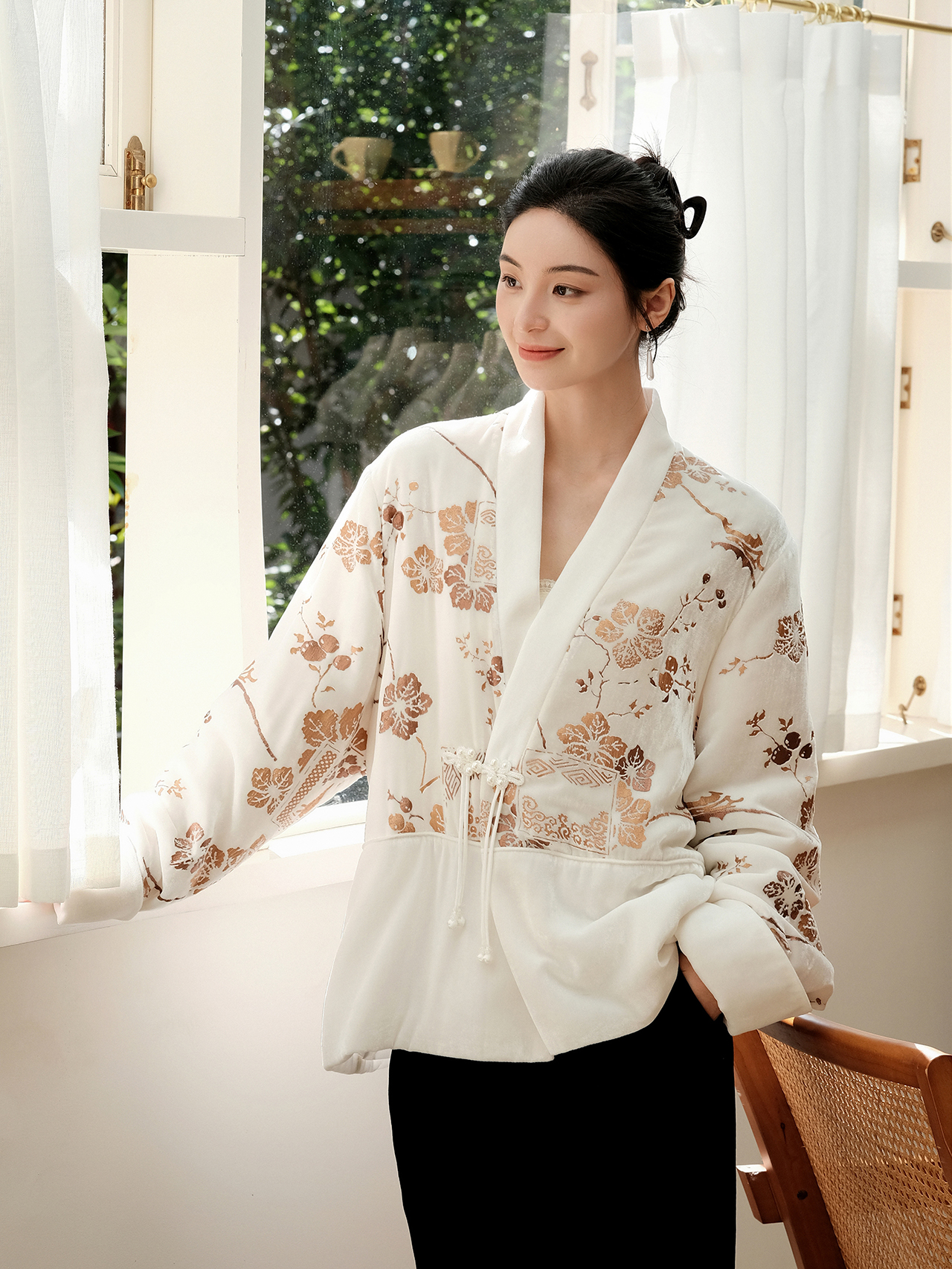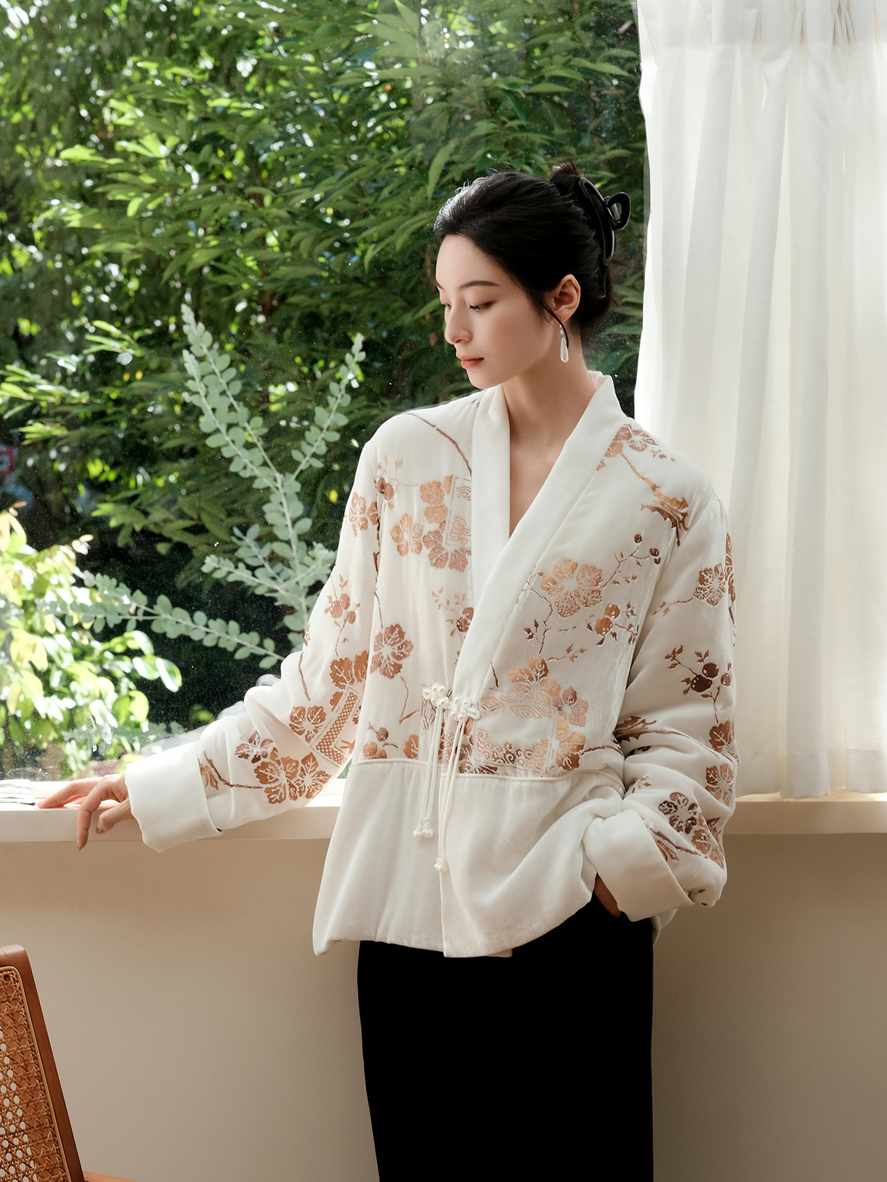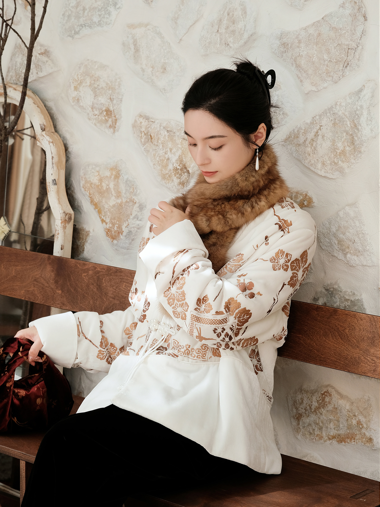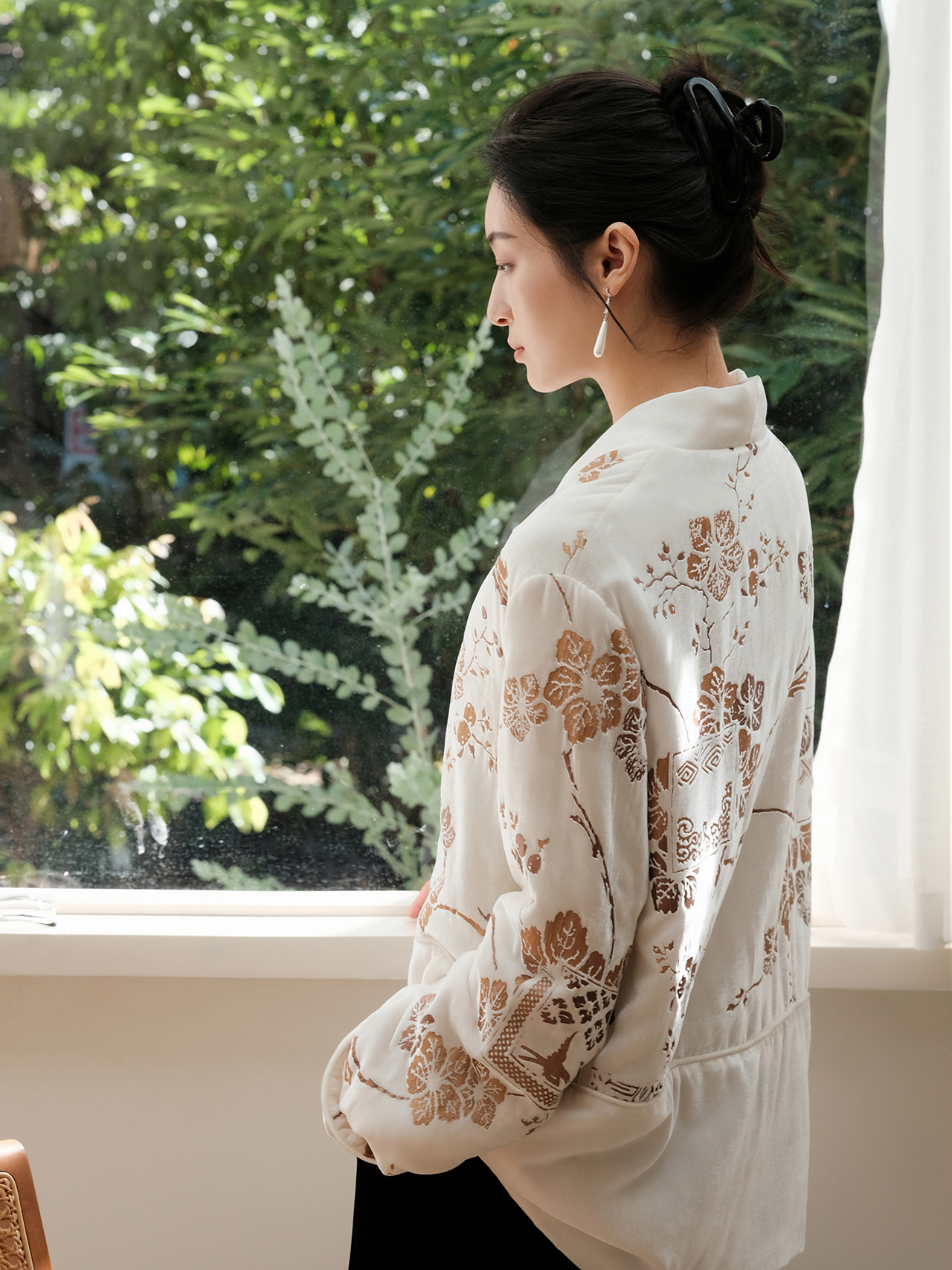 盛唐牡丹 | 丝绒烫金花扣夹棉外套