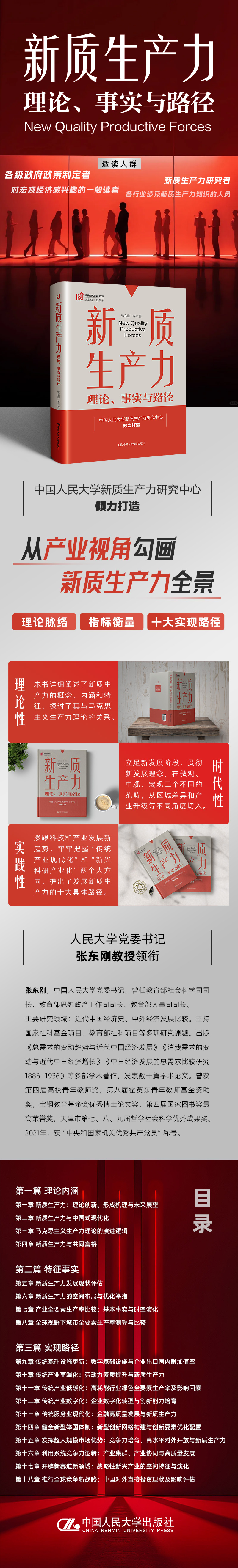 三是突出实践性。本书立足中国经济社会发展规律和实践经验,紧跟科技和产业发展新趋势,牢牢把握“传统产业现代化”和“新兴科研产业化”两个大方向,提出了发展新质生产力的十大具体路径,为以新质生产力发展推进中国式现代化建设提出人大方案、贡献人大智慧。
