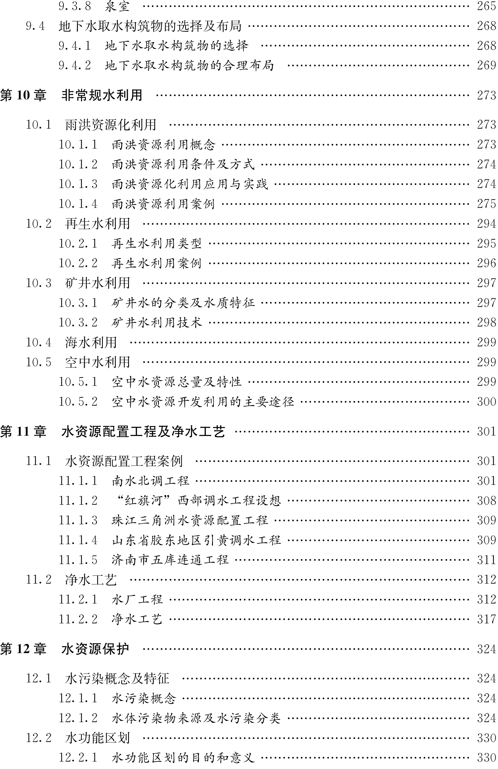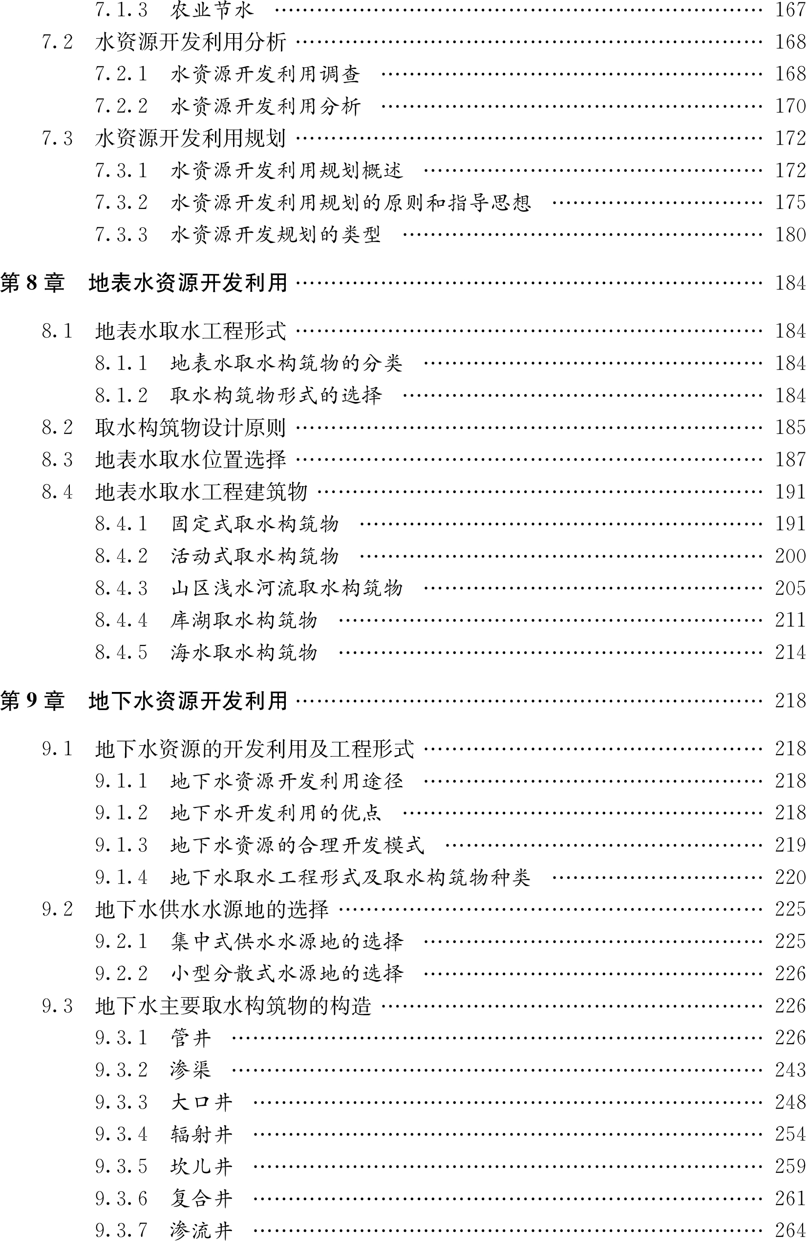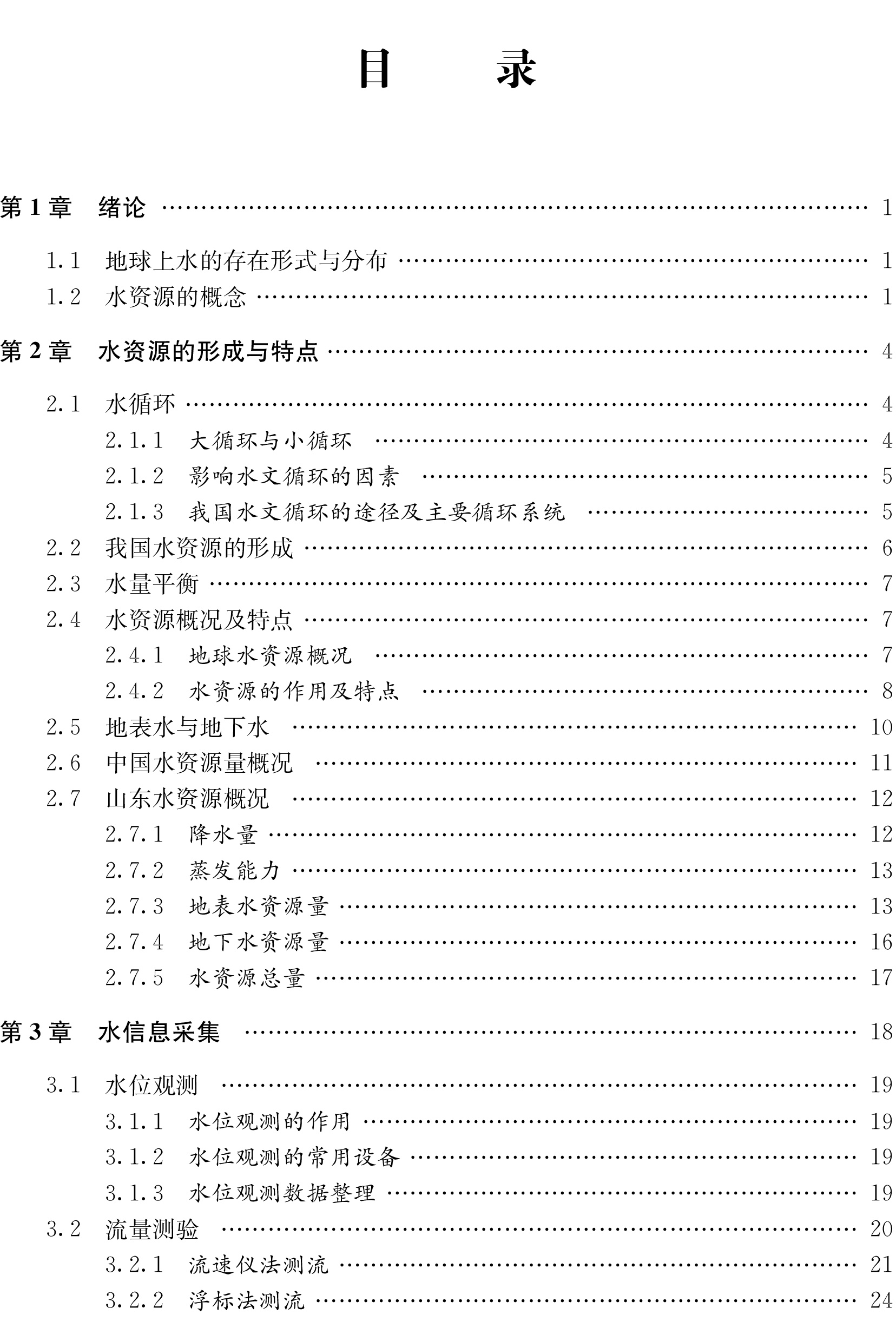 本书共分12章,主要内容包括绪论;水资源的形成与特点;水信息采集;水文数据处理;水资源量计算;水资源可利用量及水质评价;水资源供需平衡分析;节约用水措施、水资源开发利用分析与水资源开发规划;地表水资源开发利用;地下水资源开发利用;非常规水利用;水资源配置工程及净水工艺;水资源保护等。