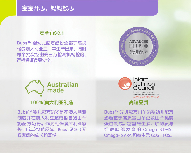 Bubs 贝儿 婴幼儿羊奶粉1段采用独有增强免疫配方,全面呵护宝宝健康成长。山羊奶富含益生菌和核苷酸、先进的白金装配方的鱼油有助于营养支持。口感非常清淡,奶味更浓醇,无脂味。可用于混合喂养,内含宝宝智力与身体发育的关键因子,给宝宝全面的营养呵护,羊奶更容易被宝宝吸收。一杯成长奶粉含有25-50%每天所需吸收的16种矿物质及维生素,有助大脑、骨骼和牙齿发育。同时提供宝宝成长所需的钙质及蛋白质;支持宝宝消化和免疫系统,促进宝宝的生长发育。
