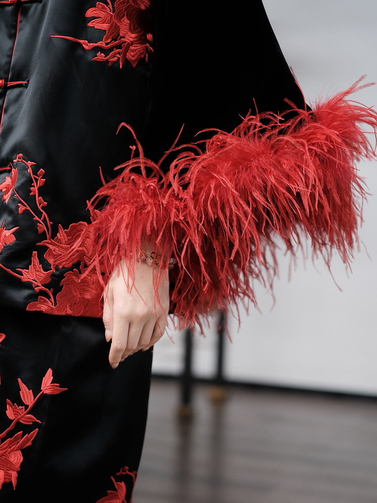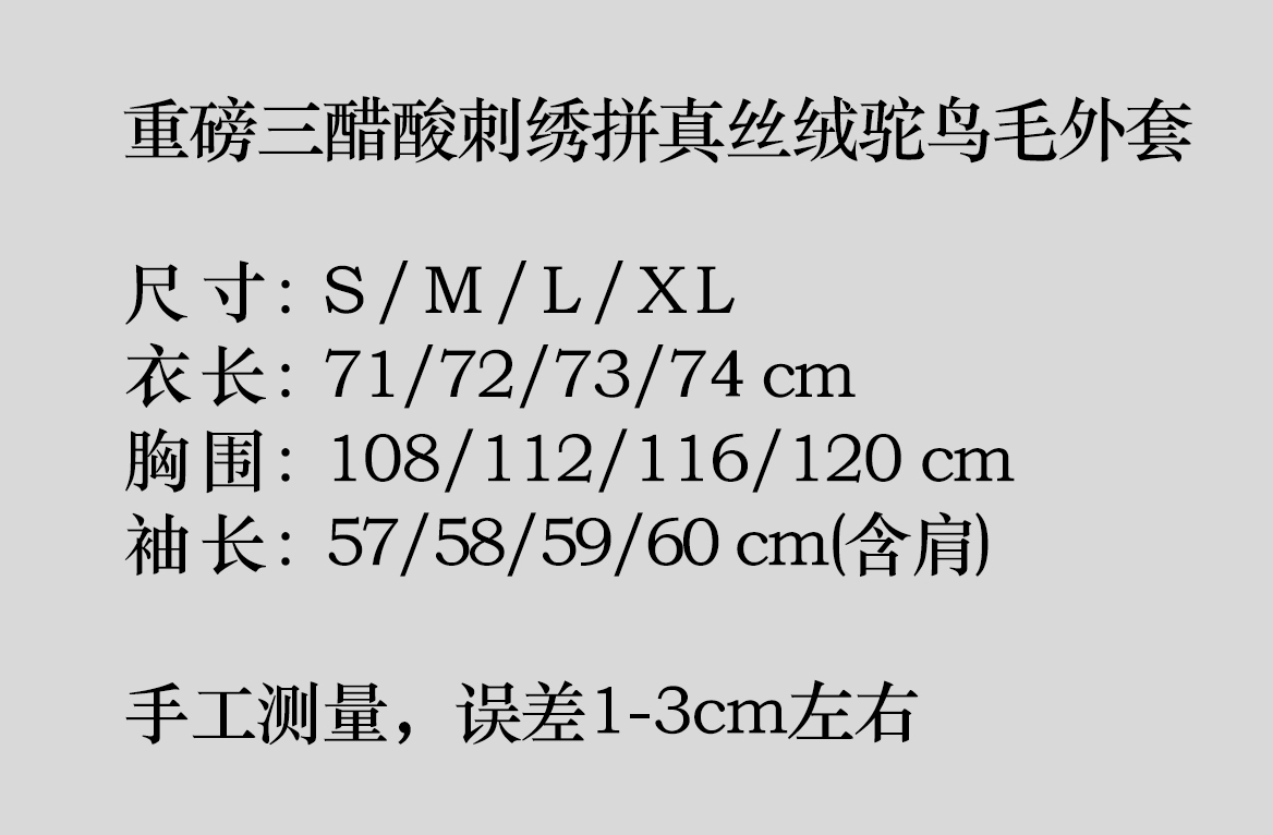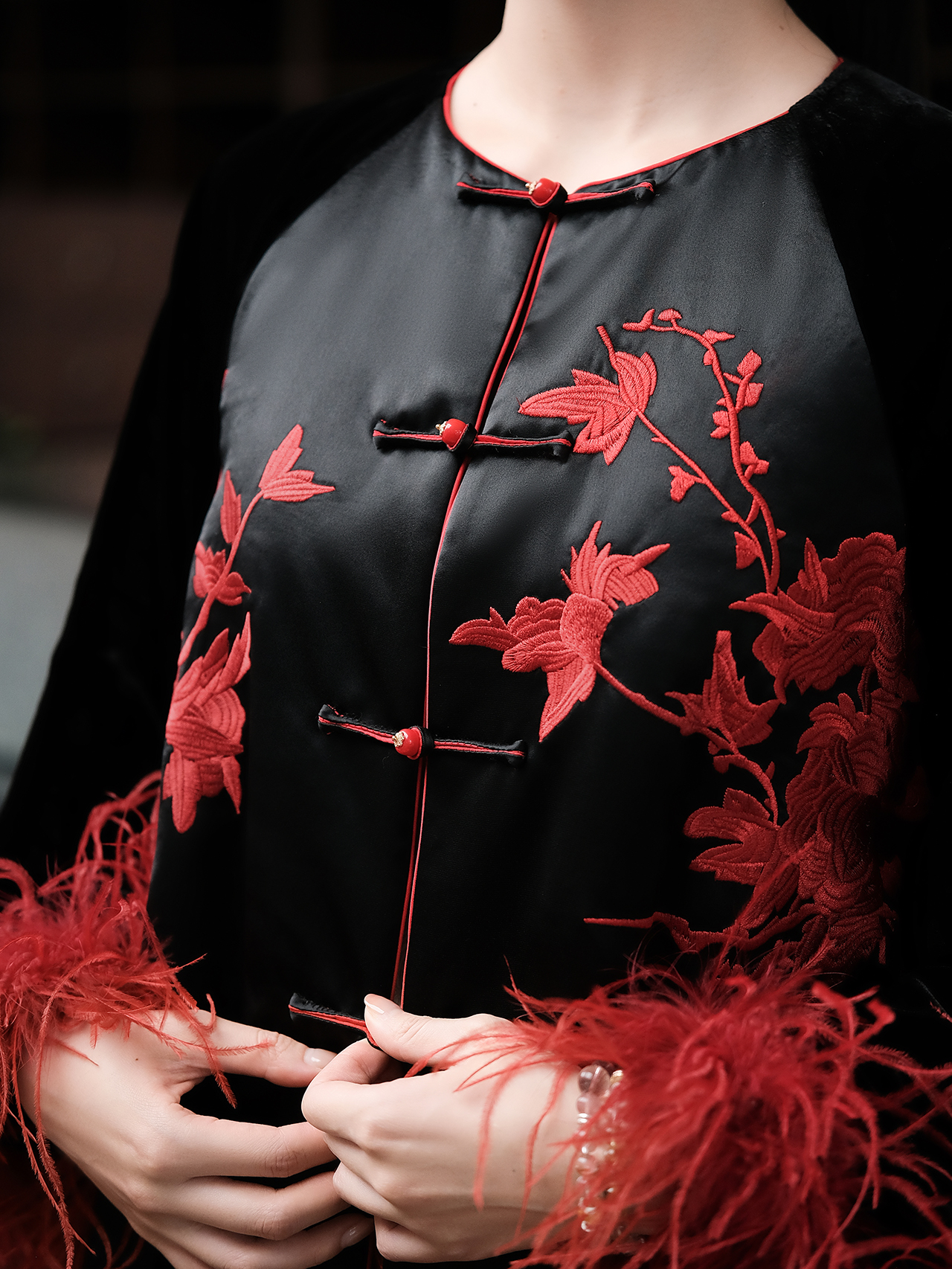 盛唐婧| 重磅三醋酸刺绣拼真丝绒驼鸟毛外套-红色