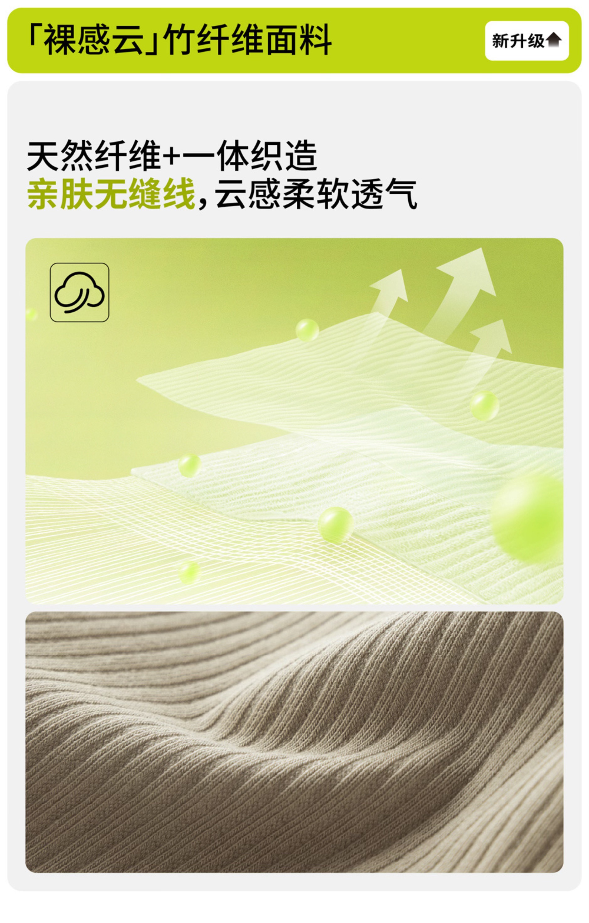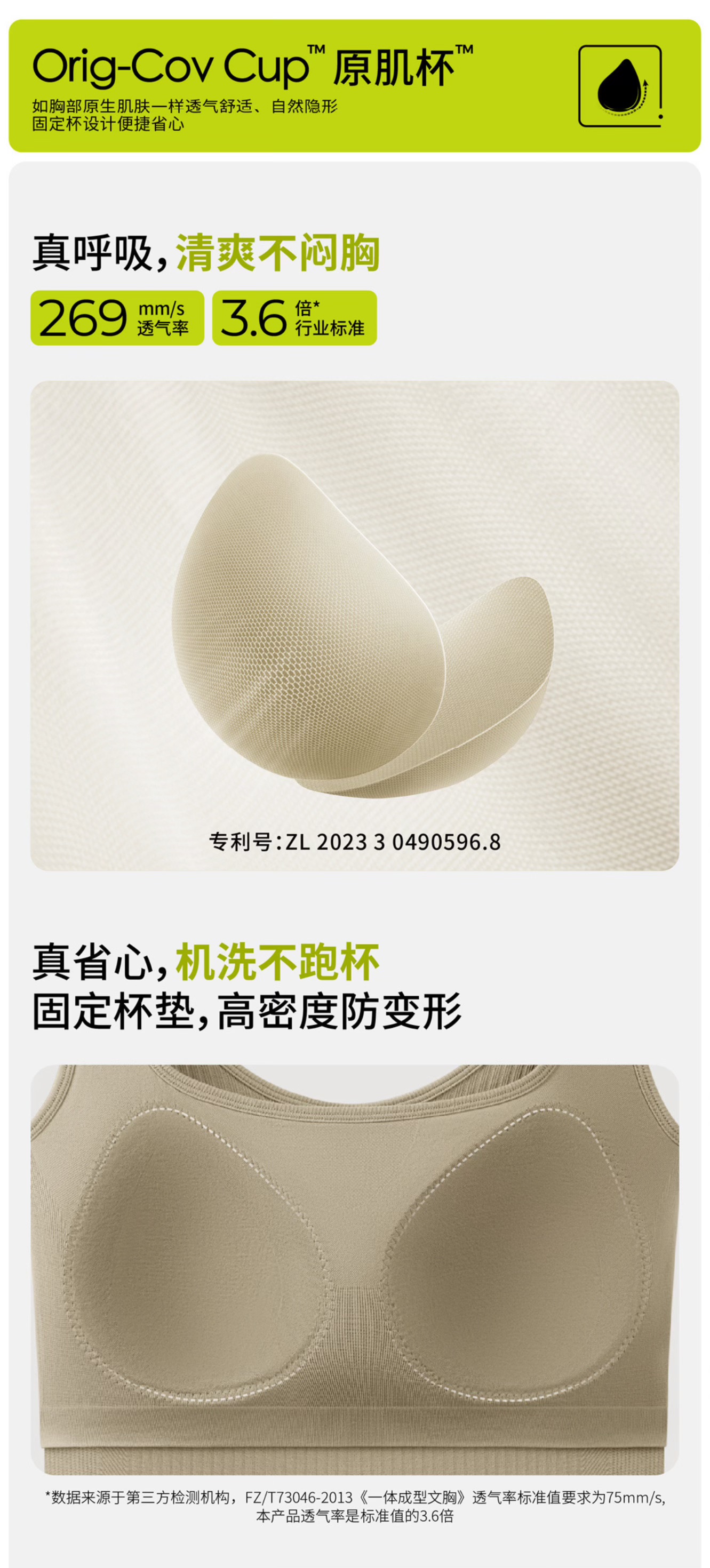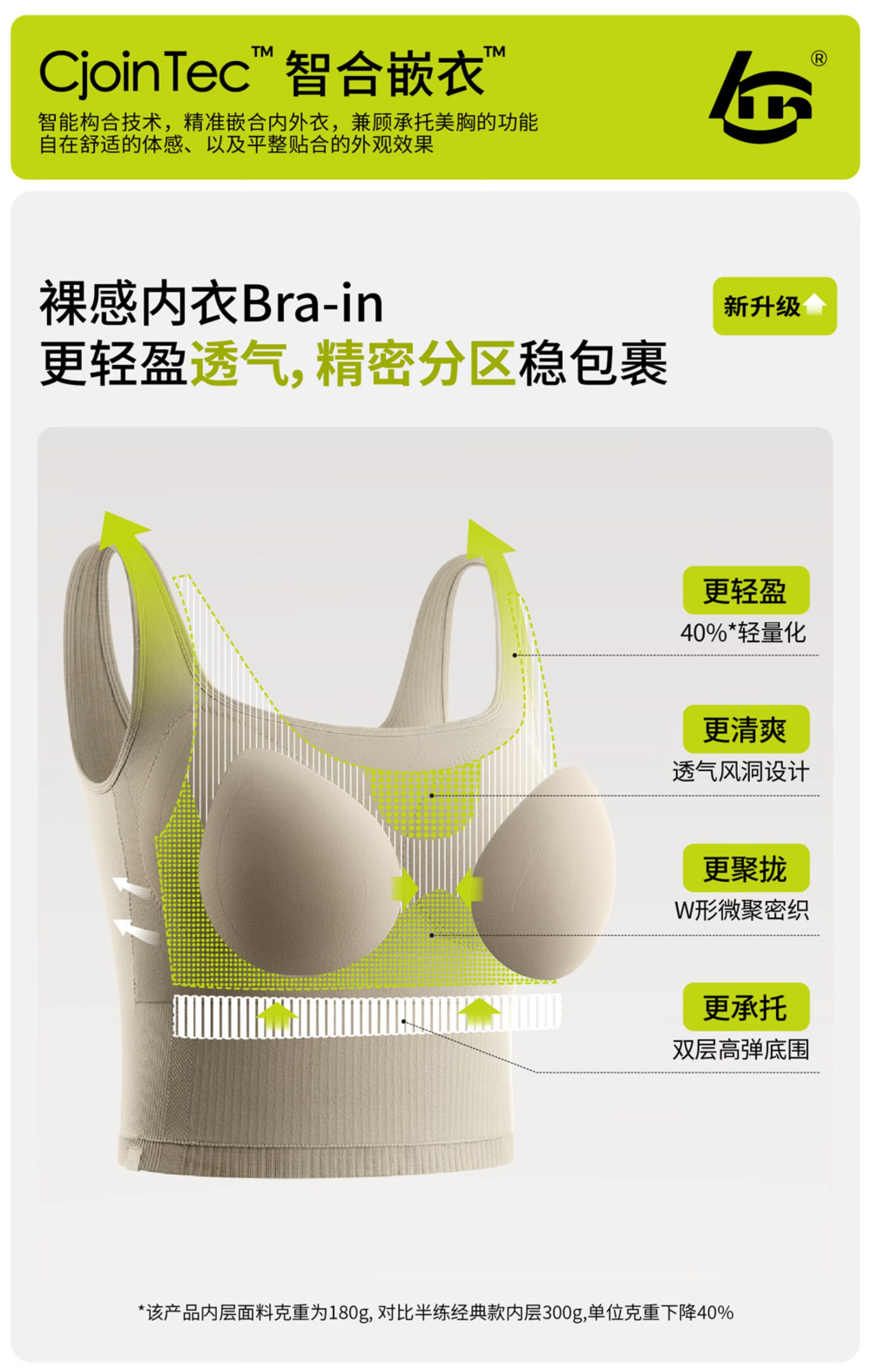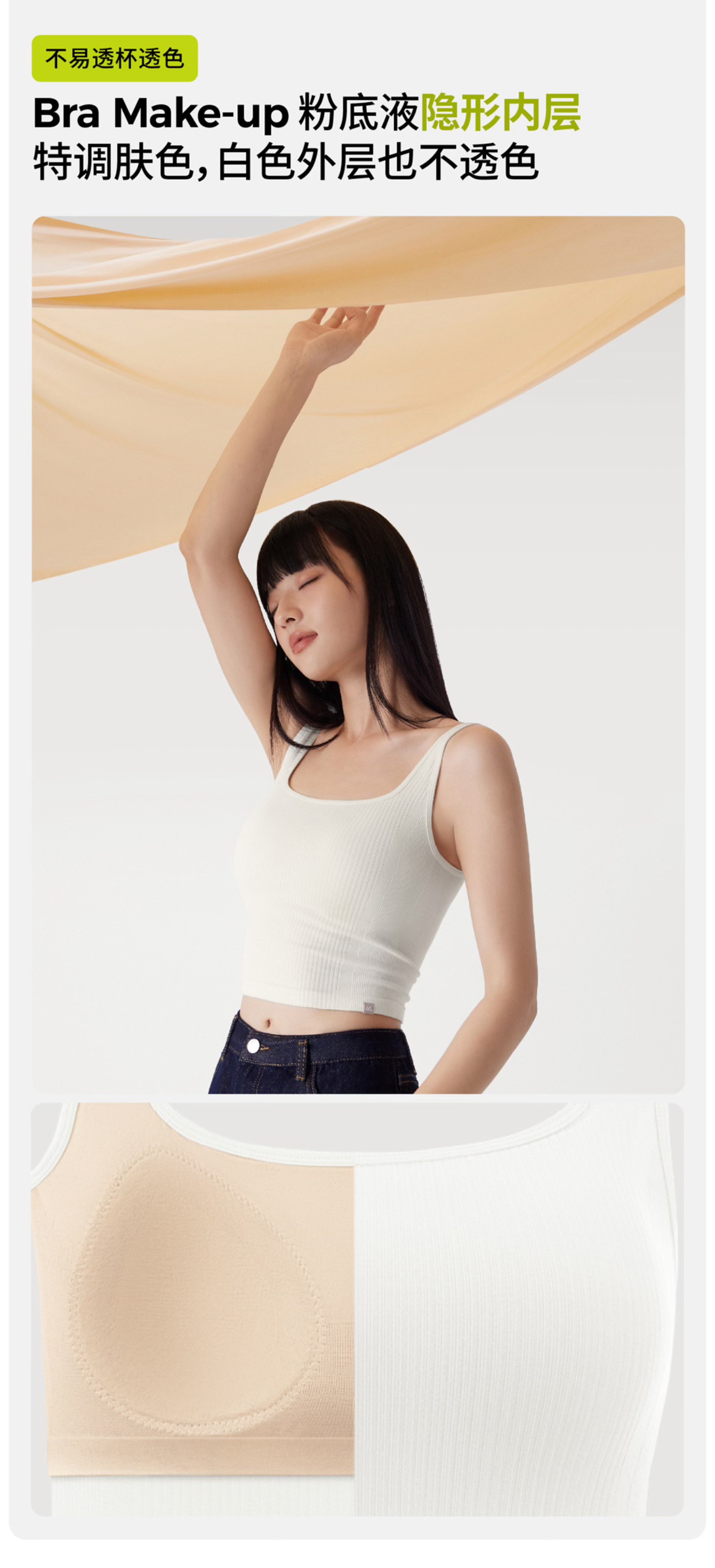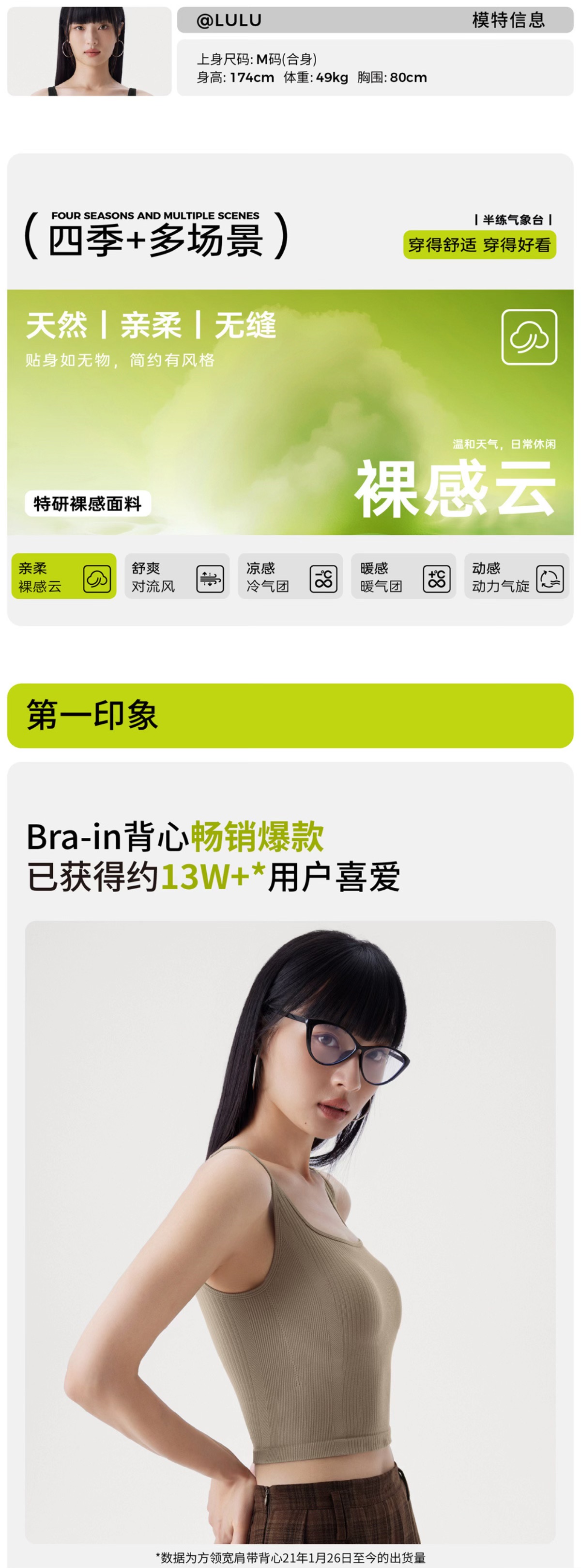 方领宽肩带Bra-in裸感云背心,以CjoinTec™智合嵌衣技术重新定义内衣美学,将承托力与外衣贴合度无缝衔接,打造“第二层肌肤”的革命性穿着体验,是真正会呼吸哦!裸感云面料精选6A级竹纤维与莱卡弹力纤维黄金配比,天然抑菌因子24小时守护肌肤健康。同时,衣服还采用了CjoinTec™智合嵌衣技术,精准嵌合内外衣结构,兼具承托美胸功能与平整贴合外观。内层分布约20000+透气孔,透气防闷热,Qmax值达0.27(超行业标准1.8倍),内置的bra-in更是采用Orig-Cov Cup™原肌杯设计,仿若第二层肌肤般舒适,自然隐形无束缚,高密度海绵防变形且透气率达269 mm/s(超行业标准3.6倍),让胸部自由呼吸,久穿依旧清爽,经过3000次机洗测试依然保持零变形,直接扔进洗衣机,省心更耐穿!