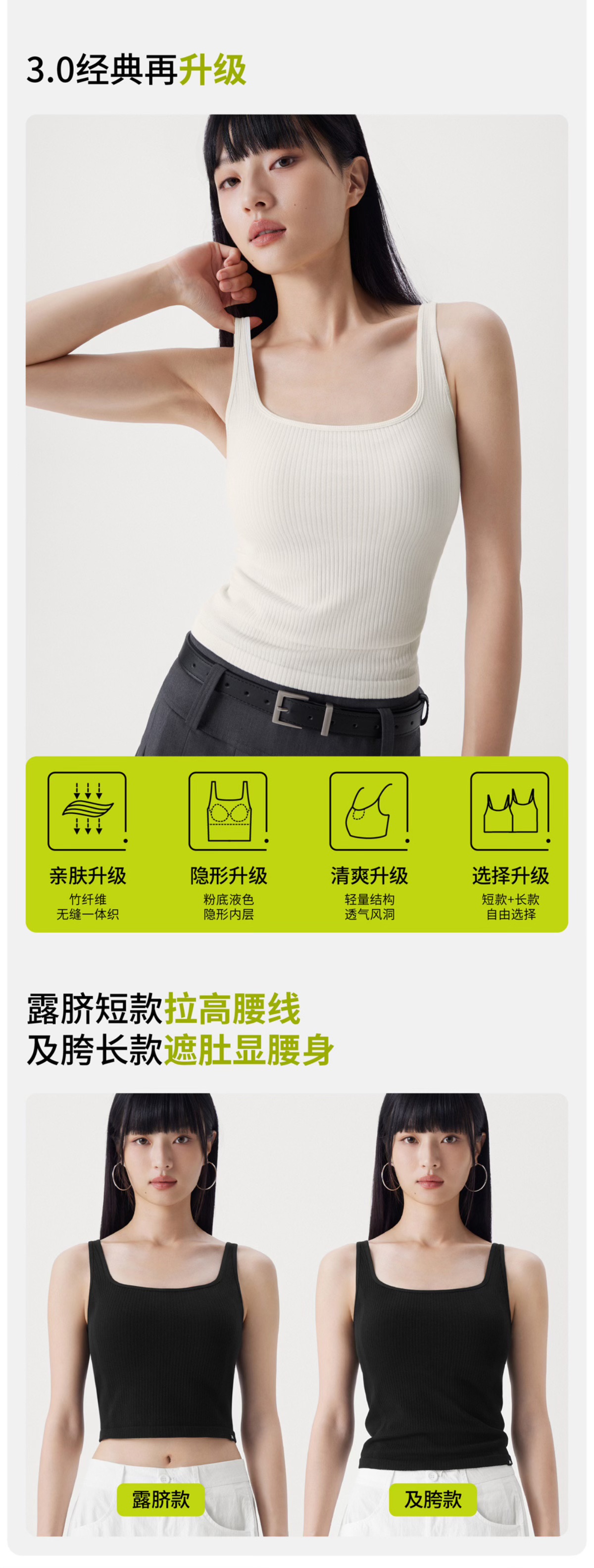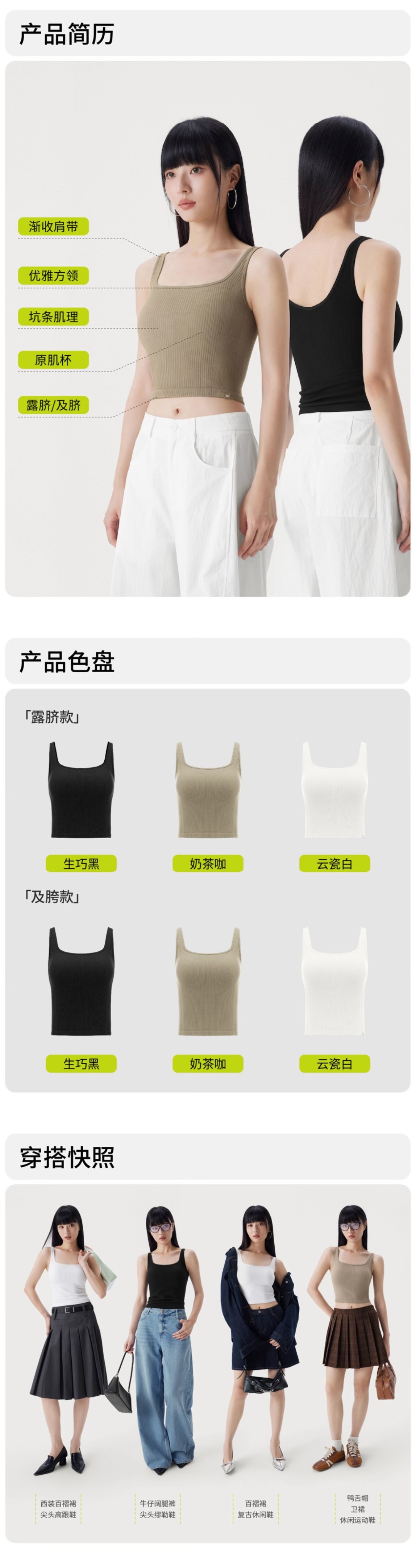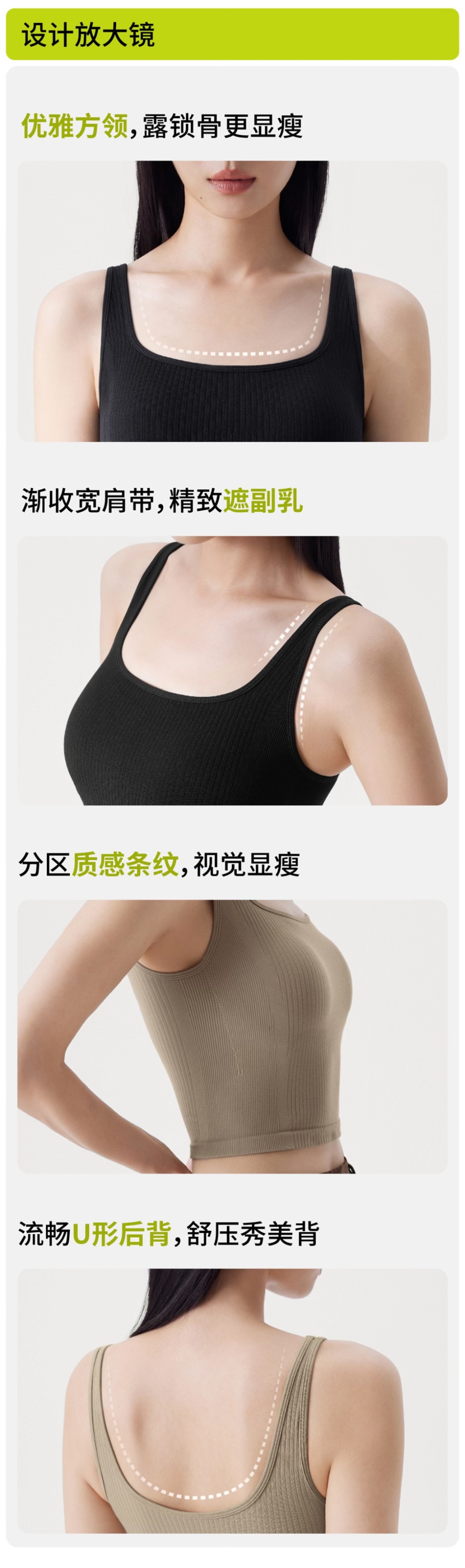 设计上更是细节满满!优雅方领以精准露肤比例修饰天鹅颈,锁骨线条若隐若现;渐宽肩带从肩头至腋下逐渐加宽,巧妙隐藏副乳,打造流畅肩部线条;前胸立体暗纹与后背平滑面料形成视觉差,显瘦效果提升30%;U型美背线以精准弧度勾勒蝴蝶骨轮廓,让背影都好好看!而且还根据不同需求设计了两种版型:露脐短款衣长精准控制在肚脐上方2cm,优化黄金比例,搭配高腰下装更显腿长;及胯长款采用微收腰设计自然垂落,修饰胯部线条,通勤与休闲皆相宜!