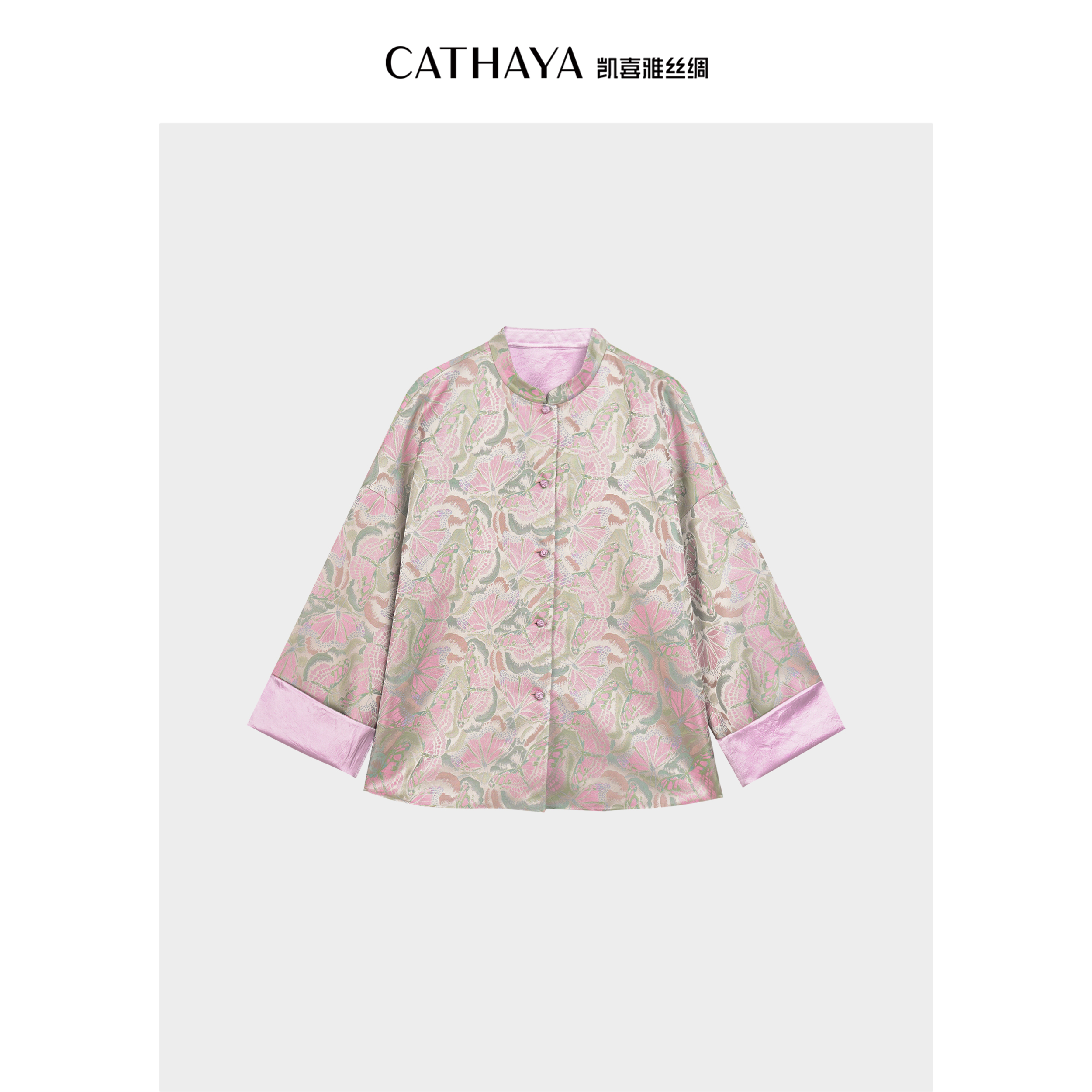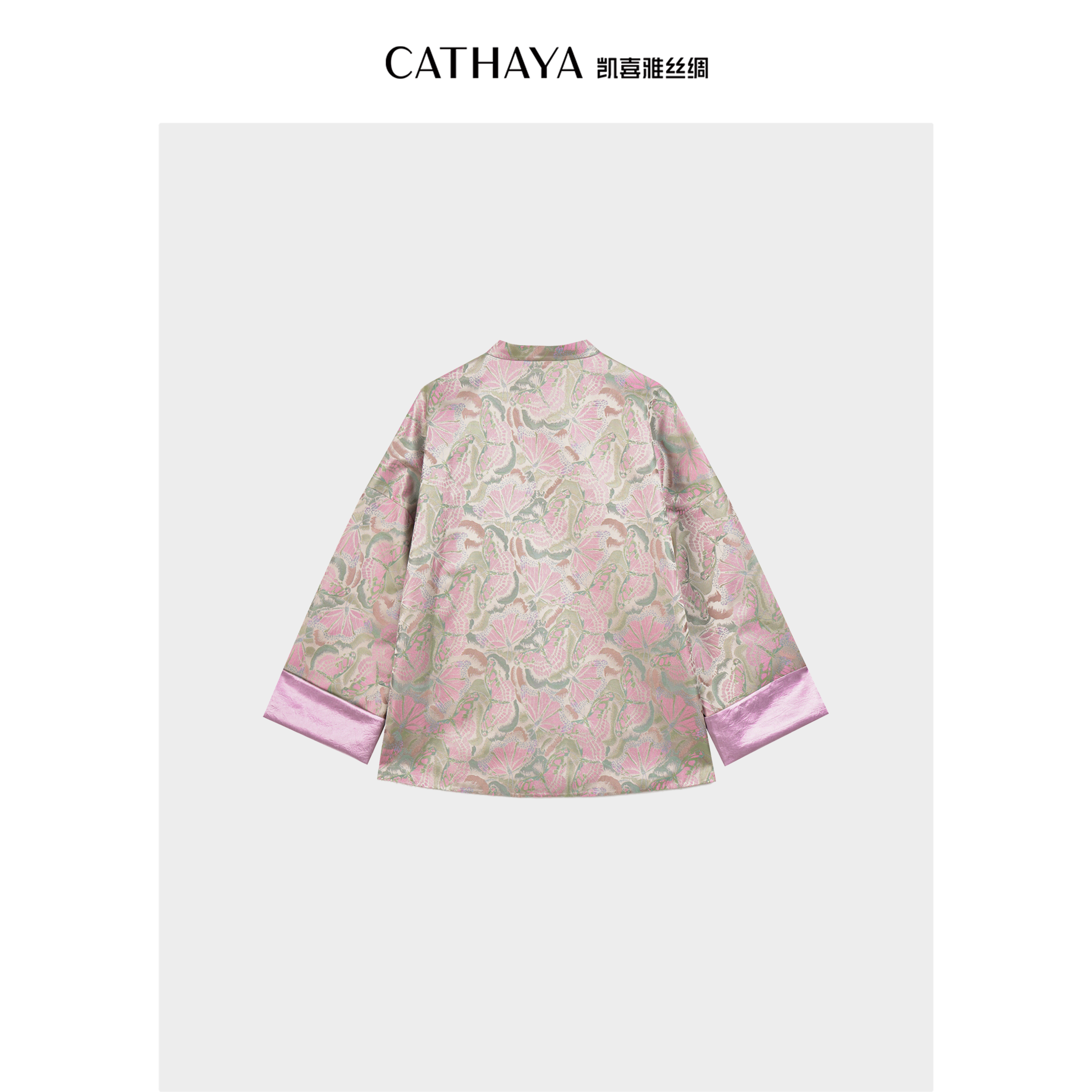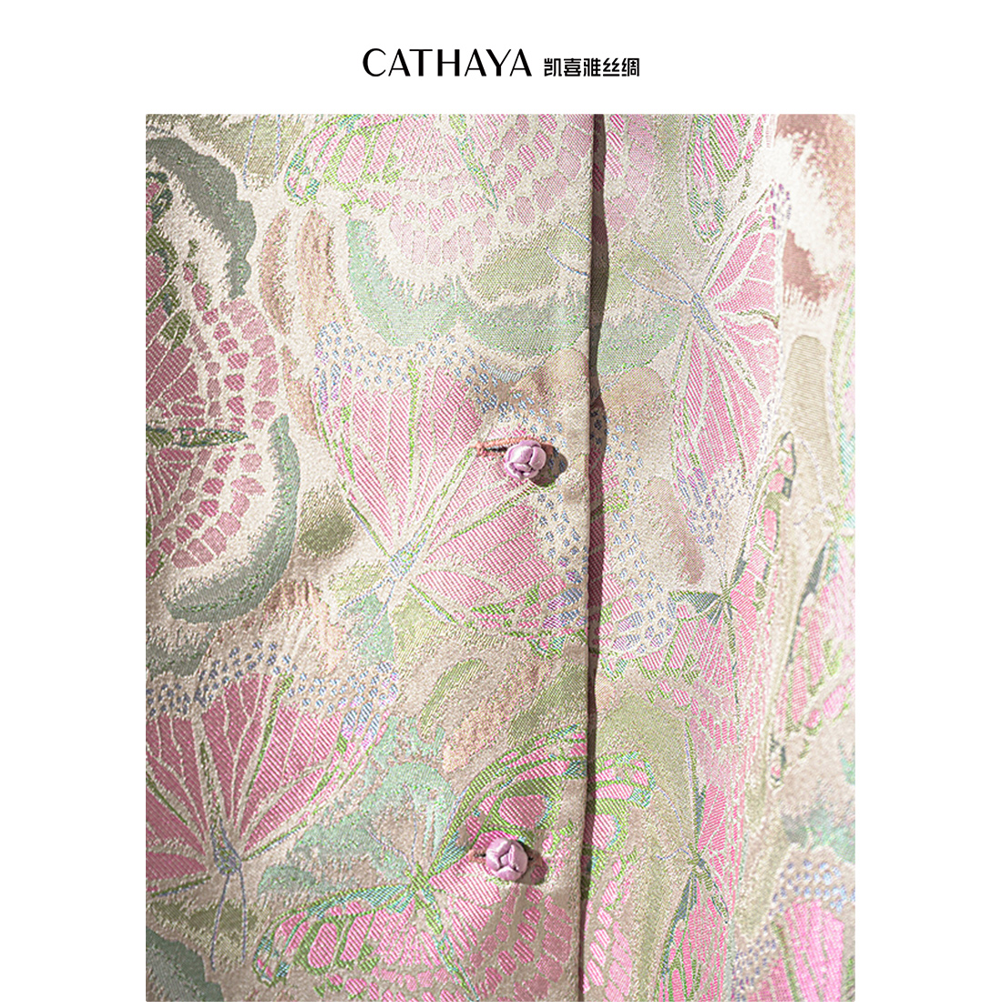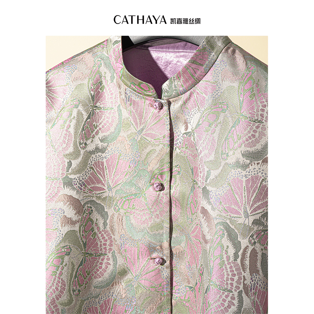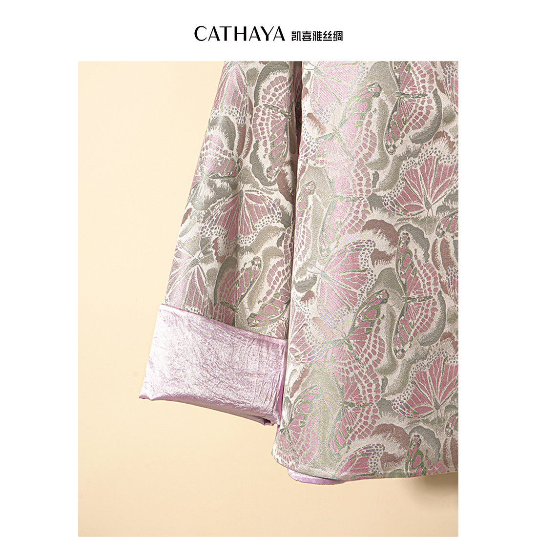 1.【蝶舞流光】采用28姆米宋锦“彩鳞蝴蝶梦花纹”,银绿底布上蝴蝶纹样栩栩如生,暗藏缠枝莲暗纹,五重纬工艺打造立体织纹。另一面为桃红醋纤面料,柳绿纹样象征生机,双面皆可搭配;