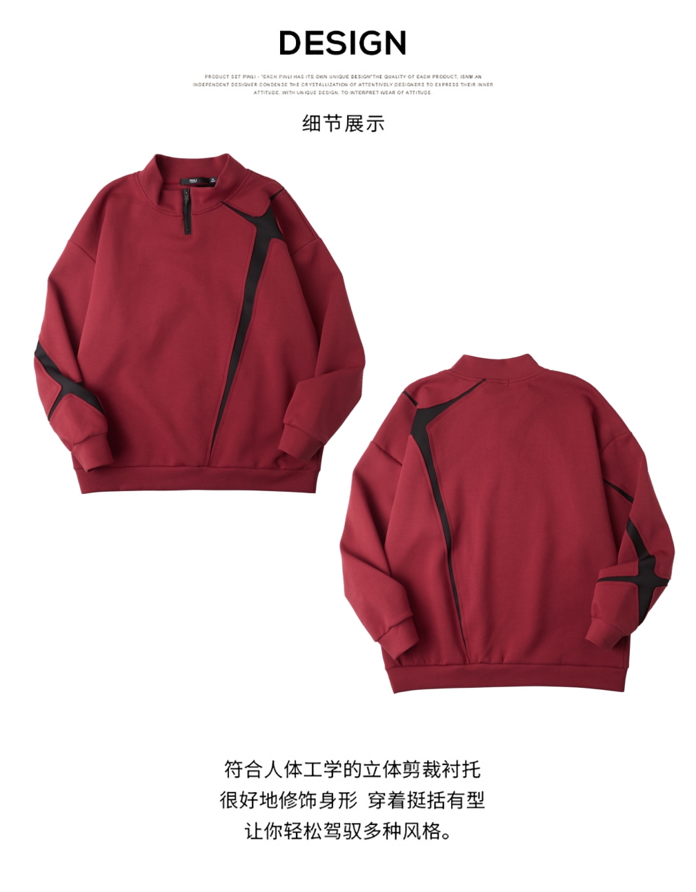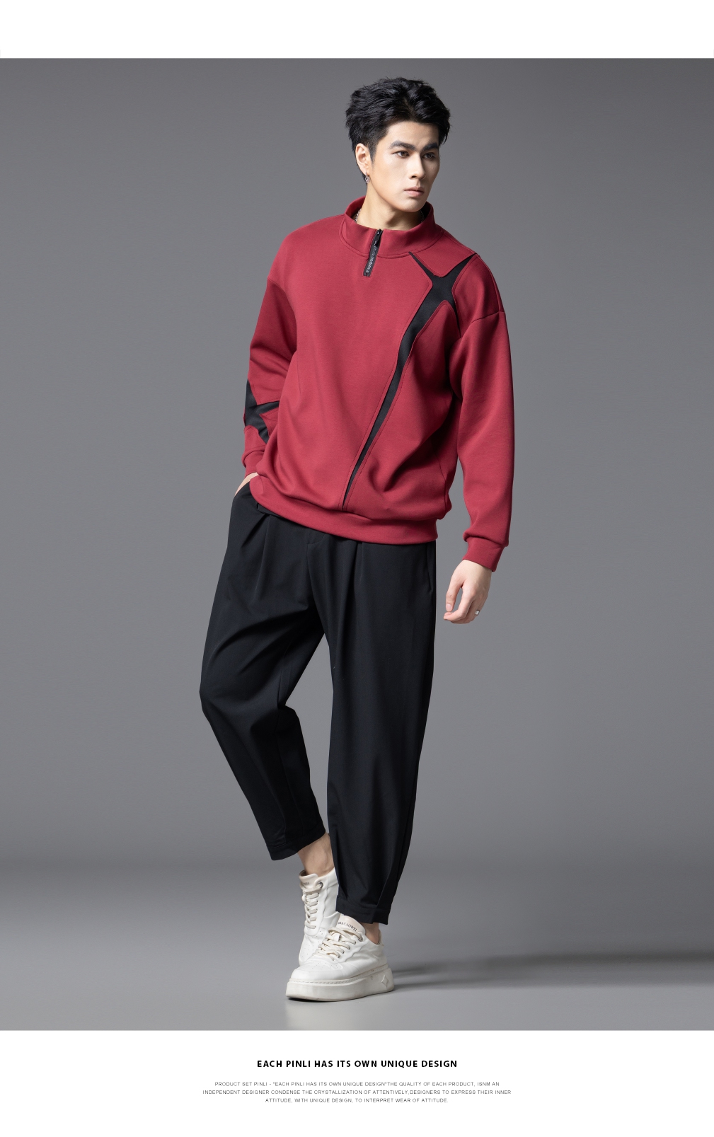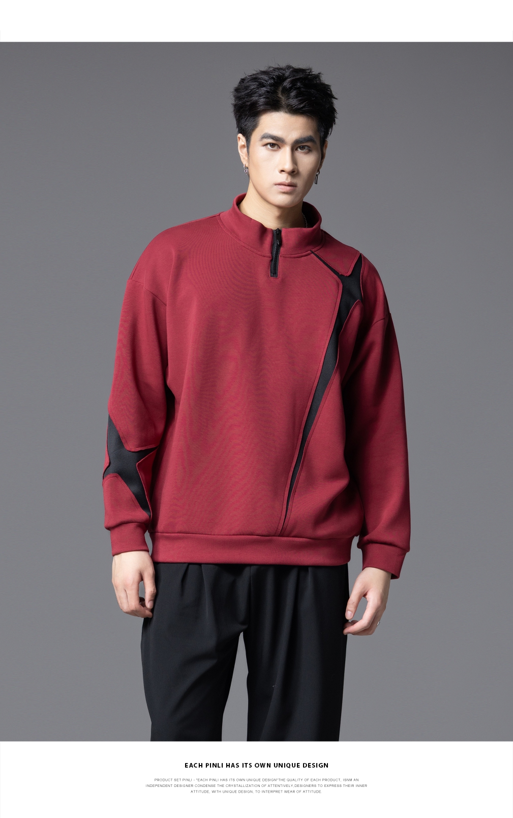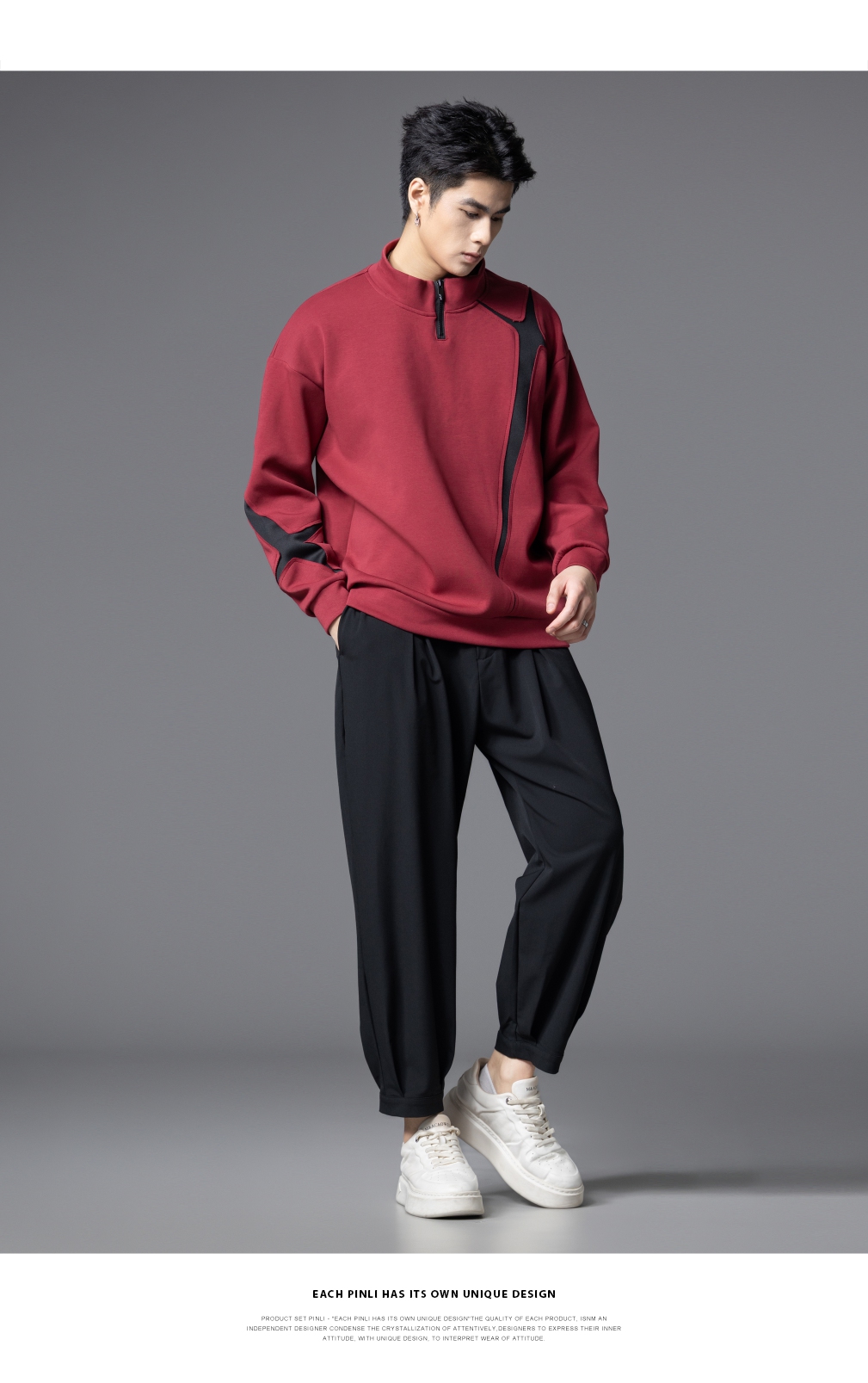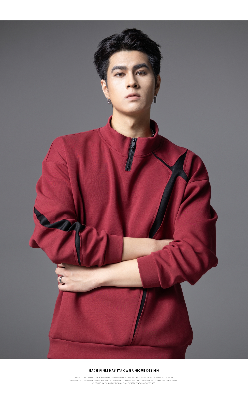 PINLI品立2025秋季新款潮牌高领拉链宽松卫衣男撞色复古休闲上衣B253109011