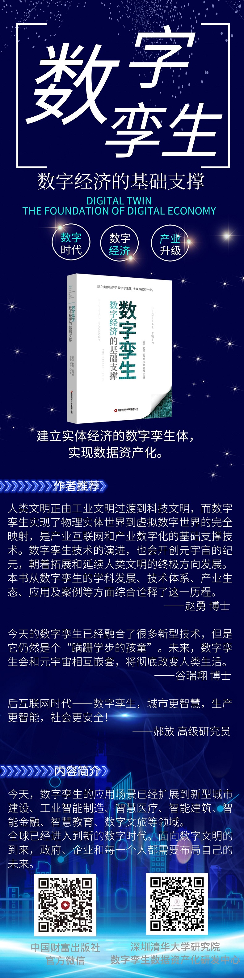 通常认为,数字孪生(Digital Twin)是基于美国密歇根大学的迈克尔·格里夫斯(Michael Grieves)教授的研究所提出的概念,之后这一提法得到广泛的认同并沿用至今。其实,数字孪生理念和方法已经走过了几十年的发展历程,从20世纪60年代美国国家航空航天局(NASA)的阿波罗登月计划,到今天的工业4.0和智慧城市,数字孪生技术广泛应用于各个行业中。