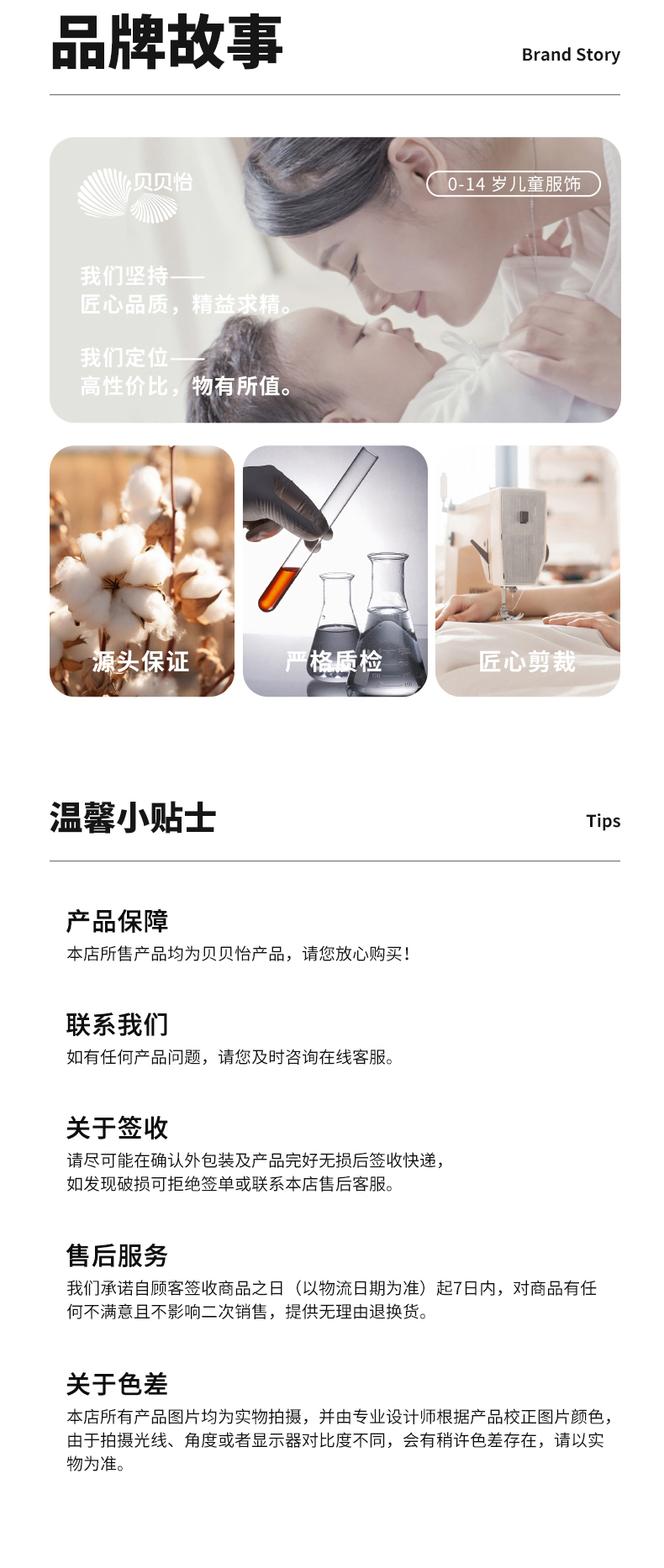 - 贝贝怡专注0-6岁婴幼儿服饰,坚持安全、柔软、舒适的产品理念,为千万中国家庭提供超高品质、安全可靠的婴幼儿服饰产品,妈妈放心,宝宝开心!