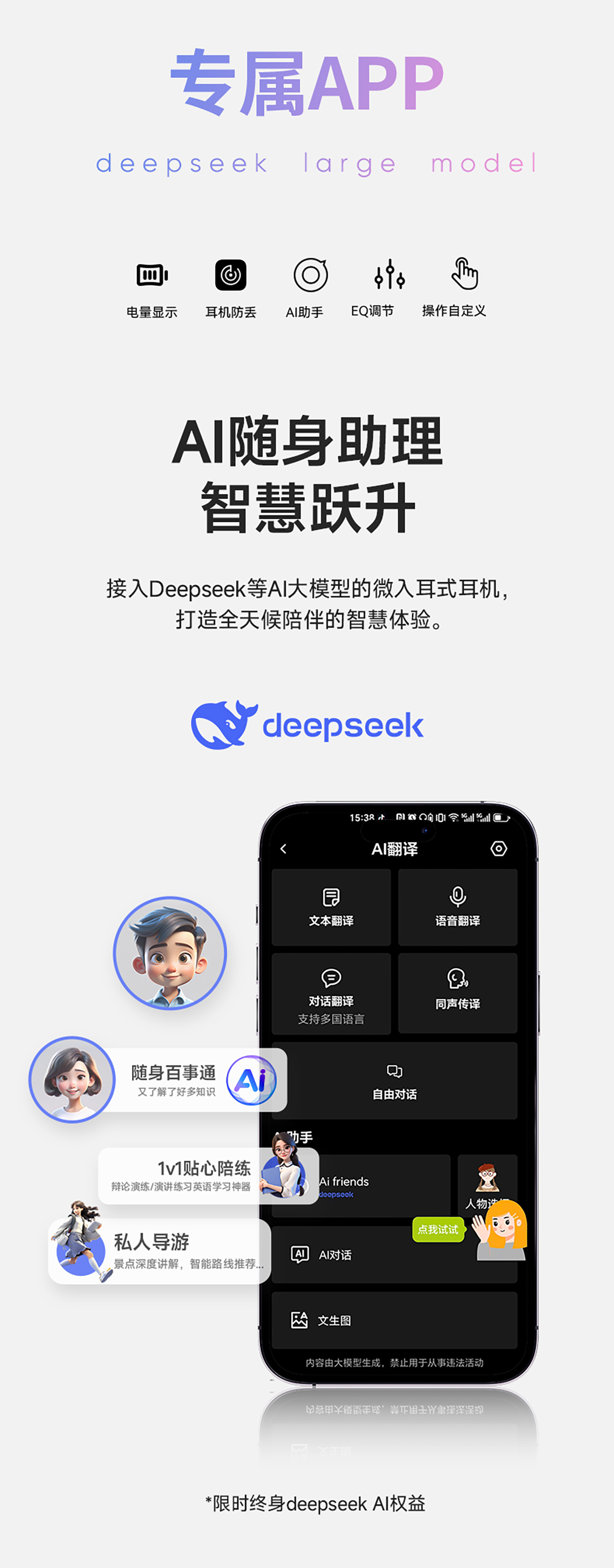 同时,它支持ENC通话降噪与ASM跨学科音频合成技术,三频均衡、音质通透,日常听歌、通话都十分出色;侧置充电防汗设计,能有效避免汗液侵蚀,大幅提升耳机使用寿命。更强大的是,它内置由科大讯飞提供技术支持的AI大模型,支持实时同声传译、会议录音转写、AI助手对话、口语陪练、景点讲解等功能,一机覆盖翻译、办公、学习、旅行等多种场景;还配备EQ调节、耳机防丢、一键排水清灰、白噪音助眠等实用功能,搭配蓝牙6.0稳定连接,太过物超所值了!