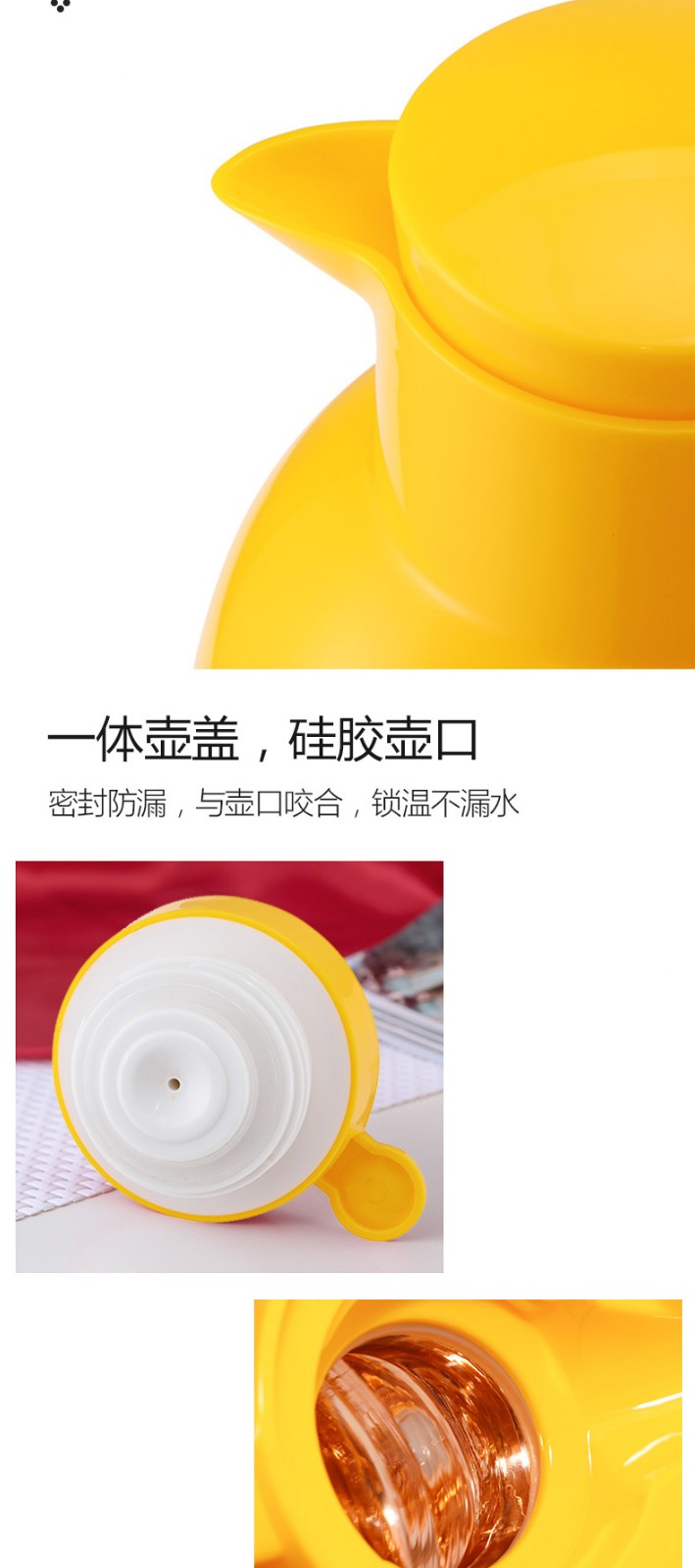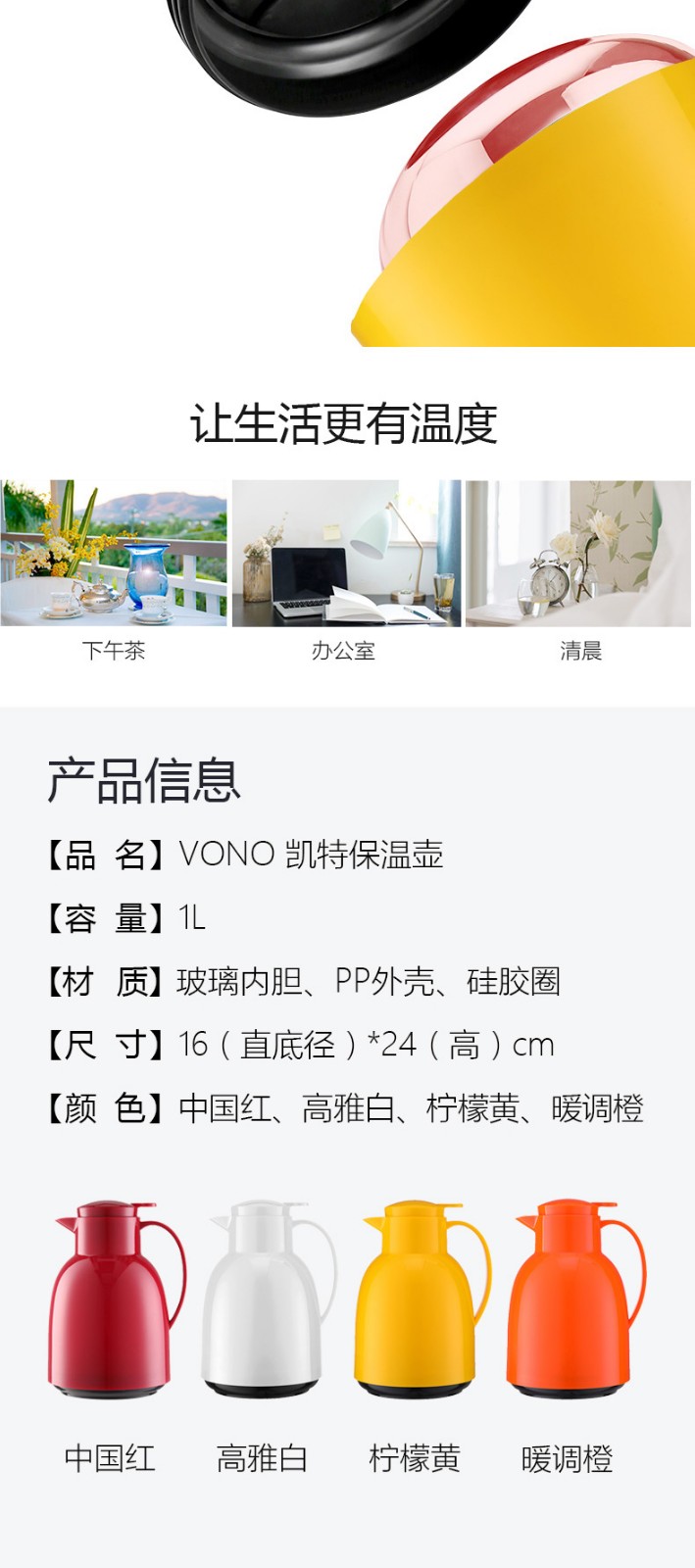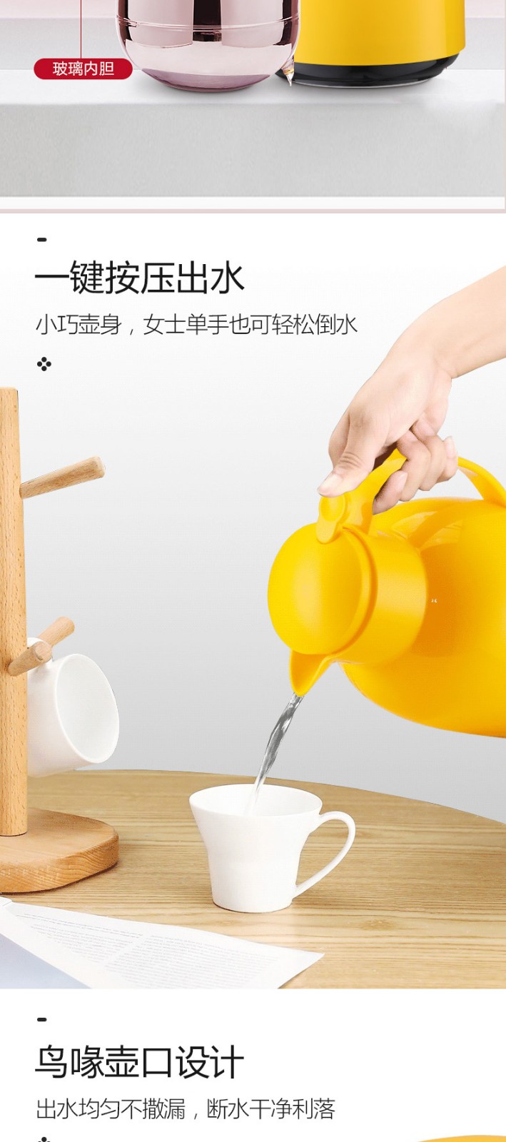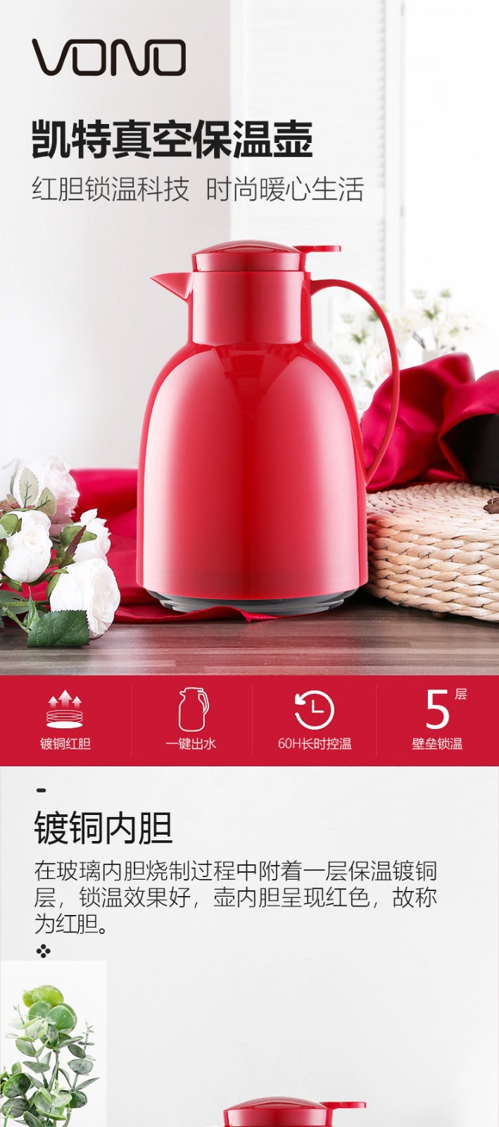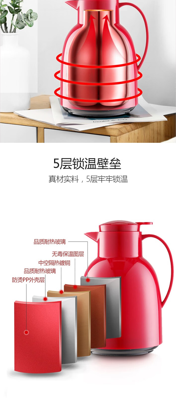 【6F】利快 按压式保温壶vono家用宿舍双层玻璃内胆保温瓶暖瓶1.0L 红色