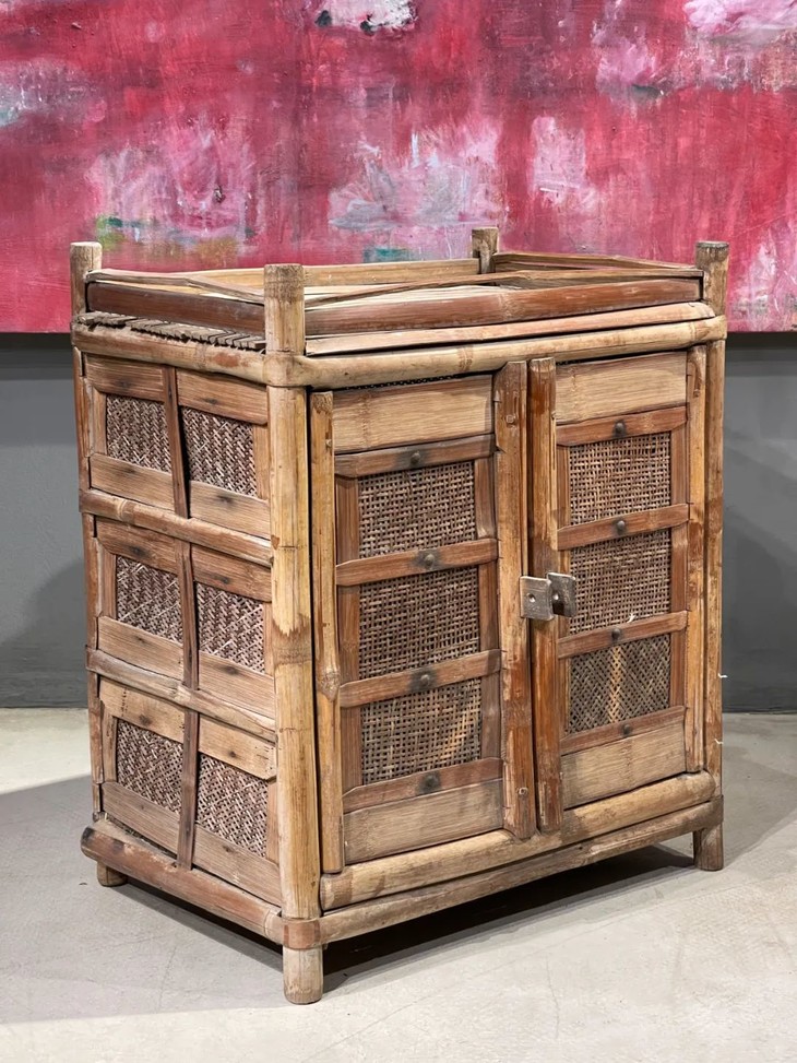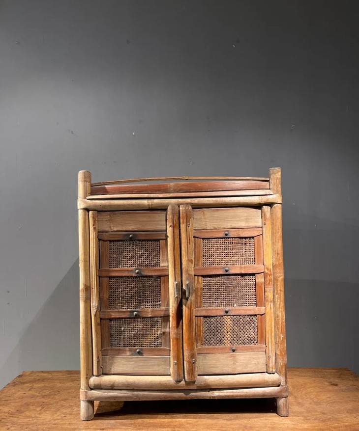 这是一件以竹竿构筑而成的传统储存茶叶或是食物的储柜,以天然江南孟宗竹竿精心编织构筑而成的传统明式家具风格储柜,是典型明清文人品味的书房或是富贵人家的竹制储存茶叶或是食物的橱柜。