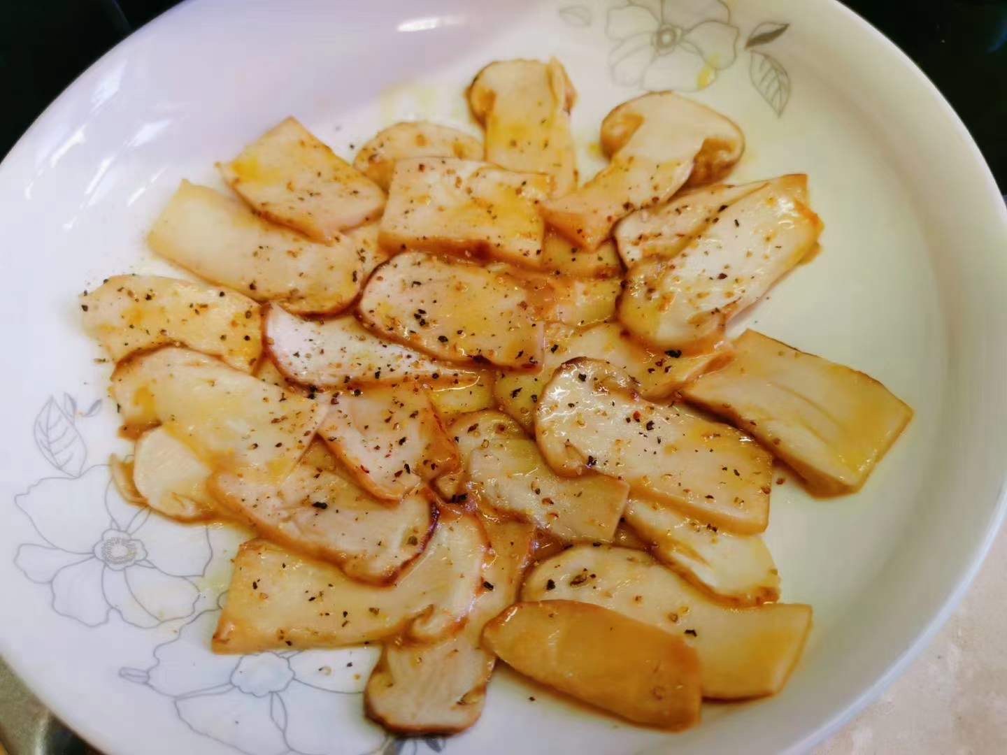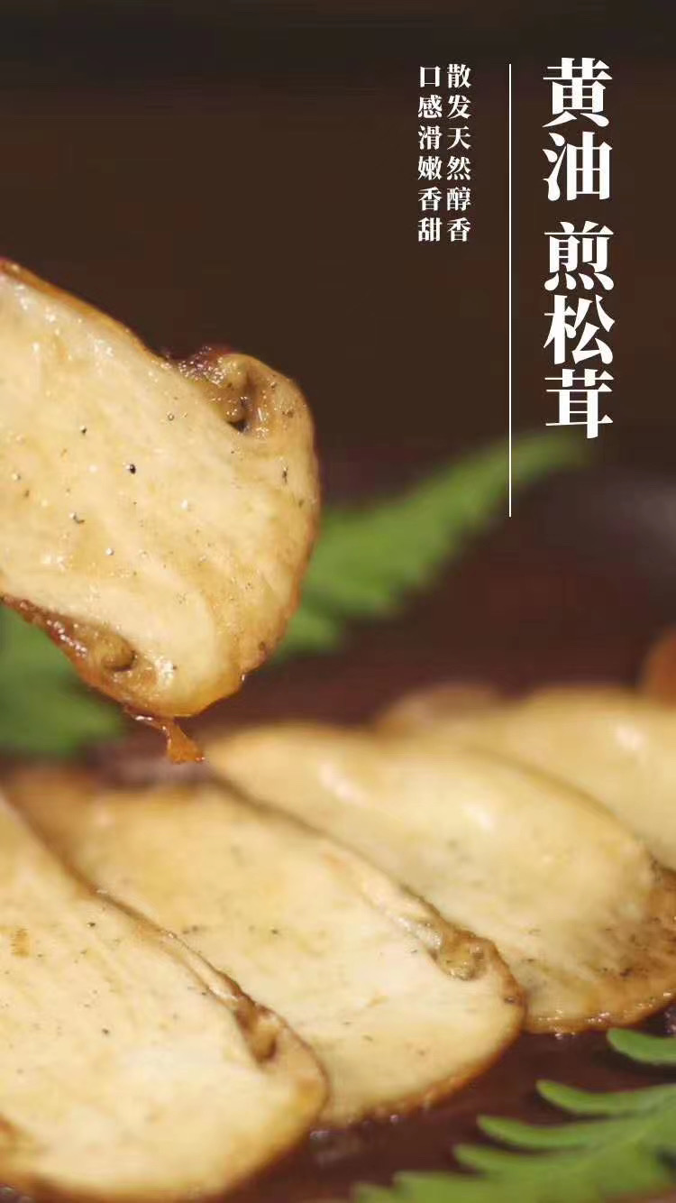 【吃法二:香煎松茸】1、松茸清洗干净,去根部,用干净纸巾擦拭松茸表面(最好不用水洗),切厚片备用。2、锅中放入黄油/牛油等,小火融化。3、放入松茸煎至两面金黄色,撒入黑胡椒碎、盐即可。