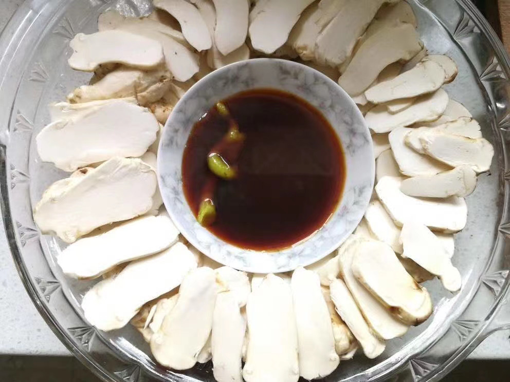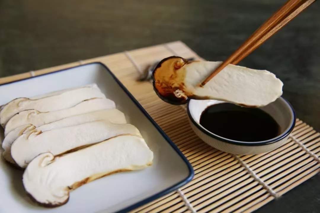 将松茸清洗干净,切成片后,搭配酱油、芥末等配料生吃的一种食物。