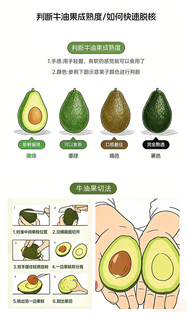 3.牛油果从绿色转变深褐色(颜色不是判断成熟的唯一标准),用手指轻压柔软即可食用