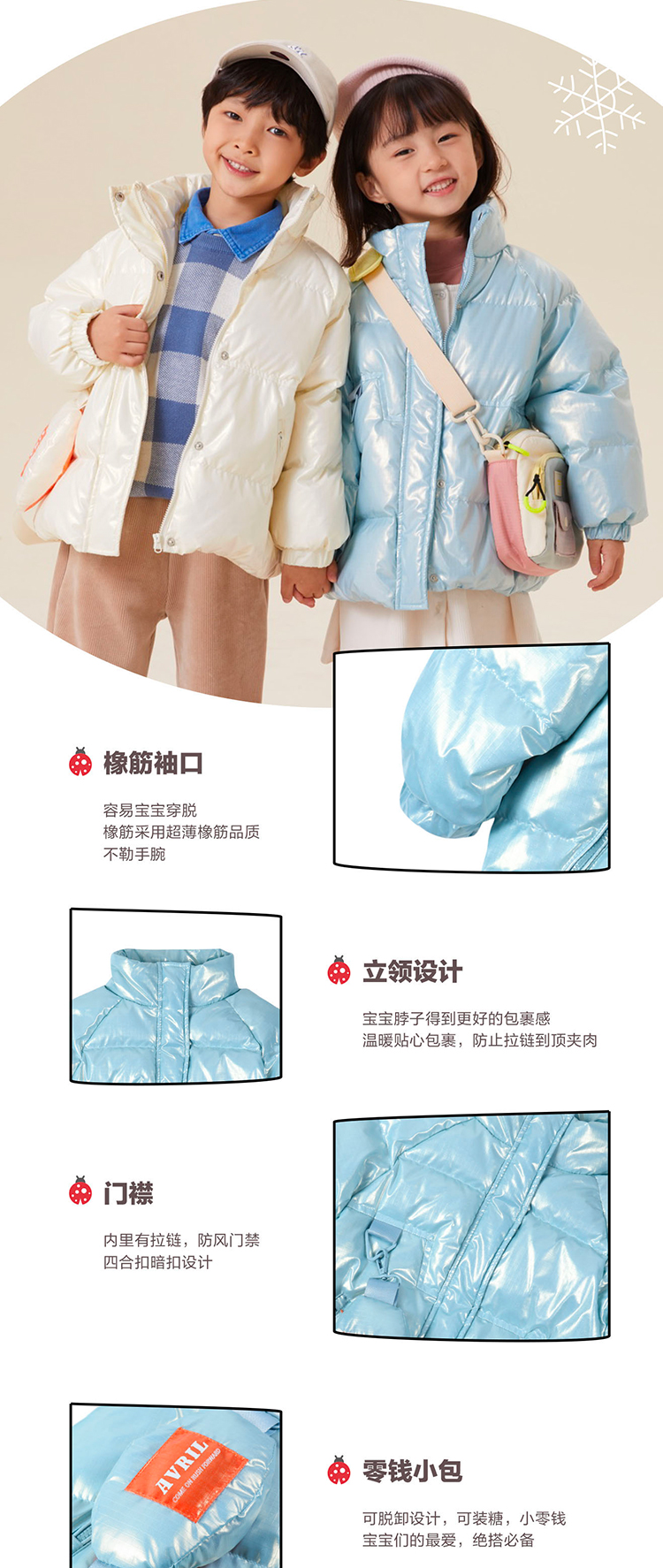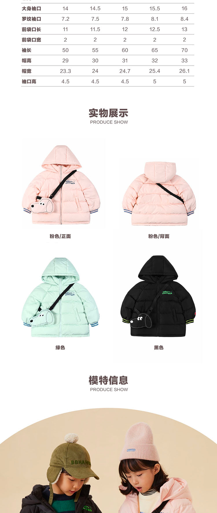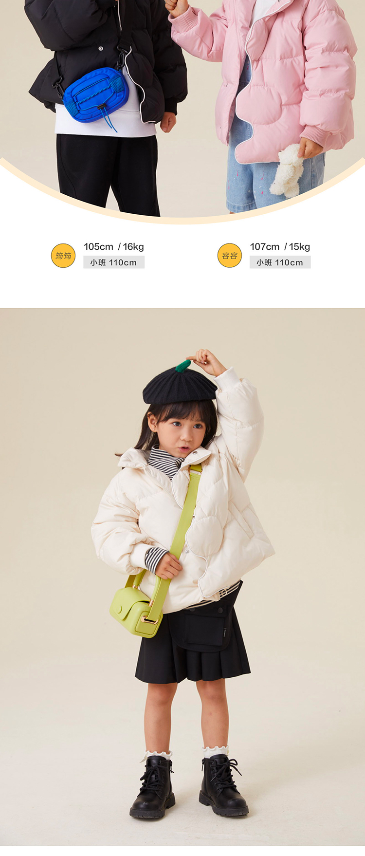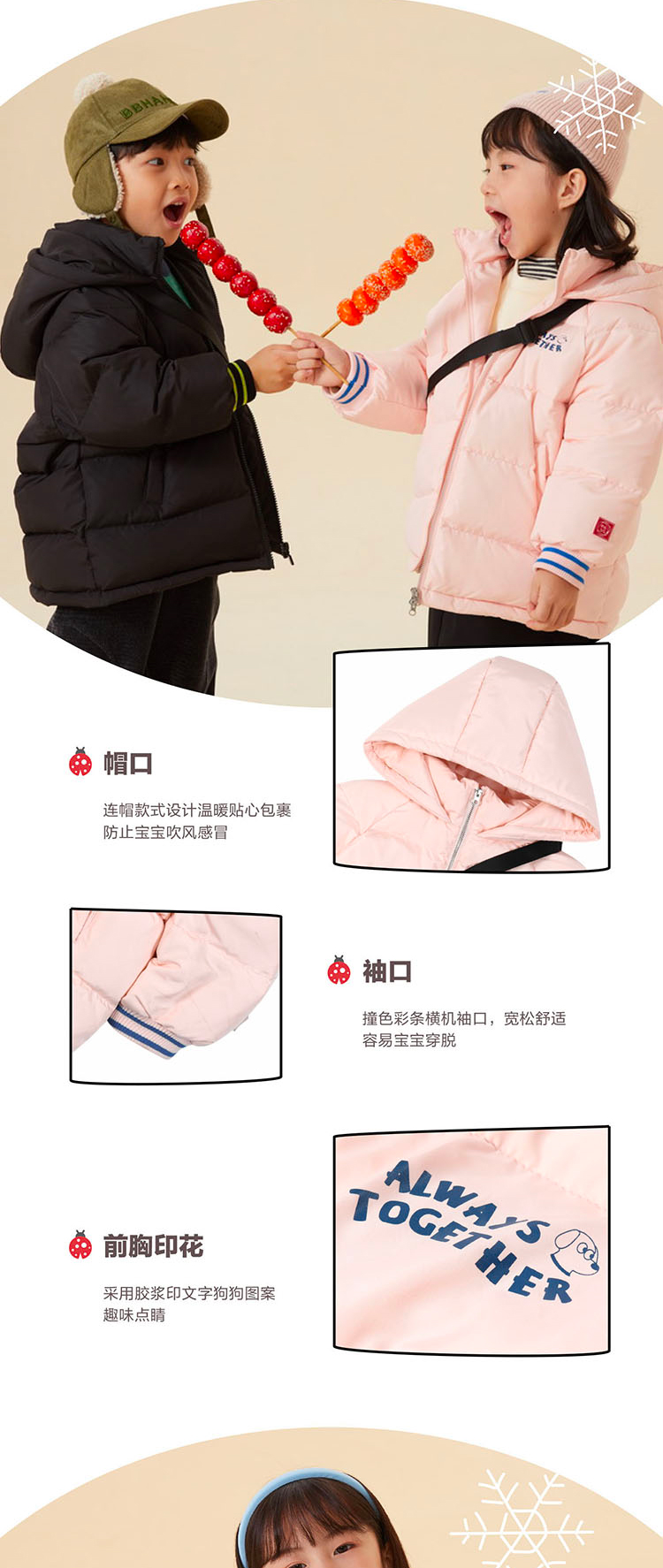 PetitAvril贝甜 儿童挎包羽绒服、炫彩立领羽绒服、可脱卸围巾羽绒服、狗狗图案羽绒服(太平鸟旗下品牌)