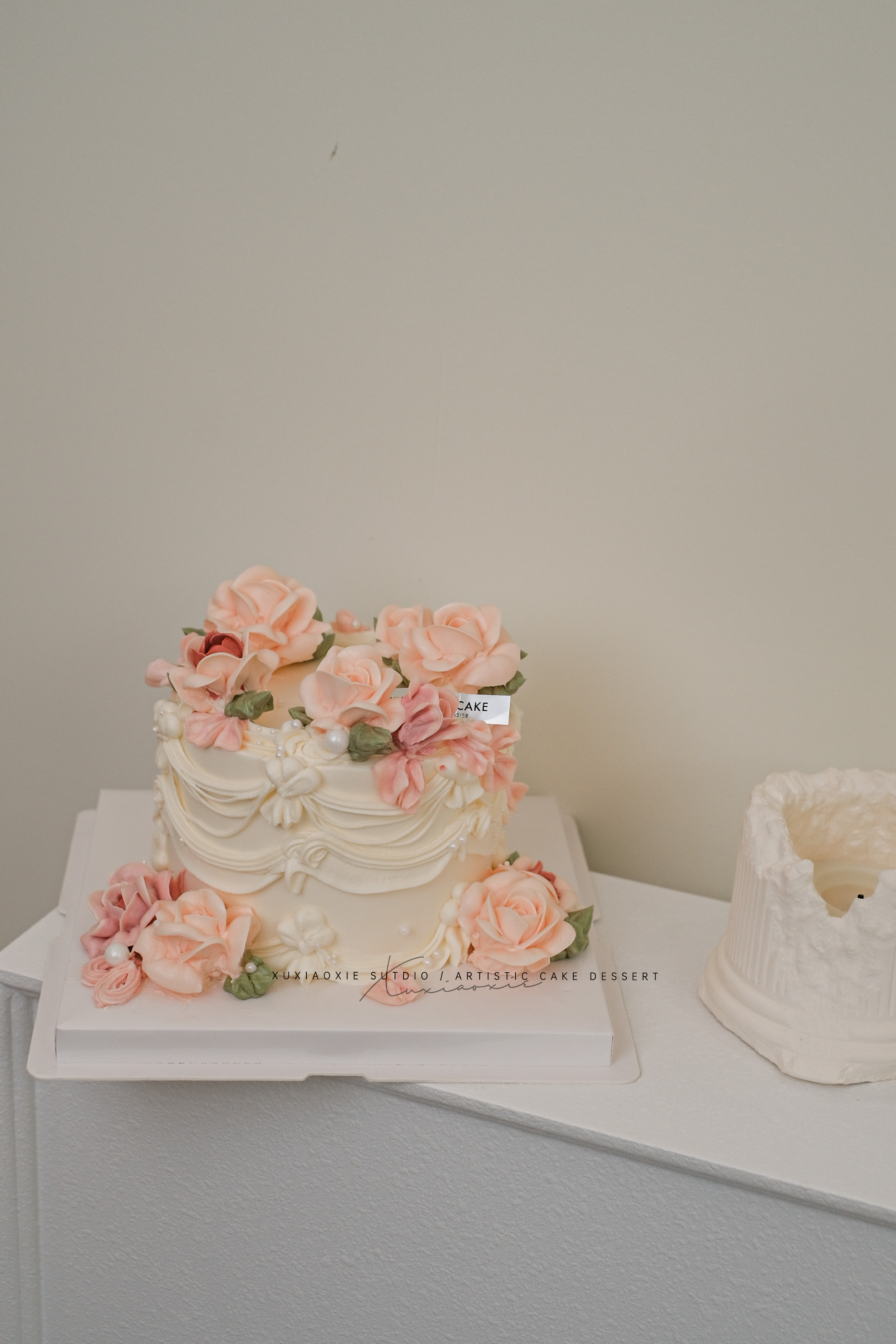 由于这款蛋糕造型比较复杂,我们会使用奶油霜抹面来确保蛋糕的稳定性。