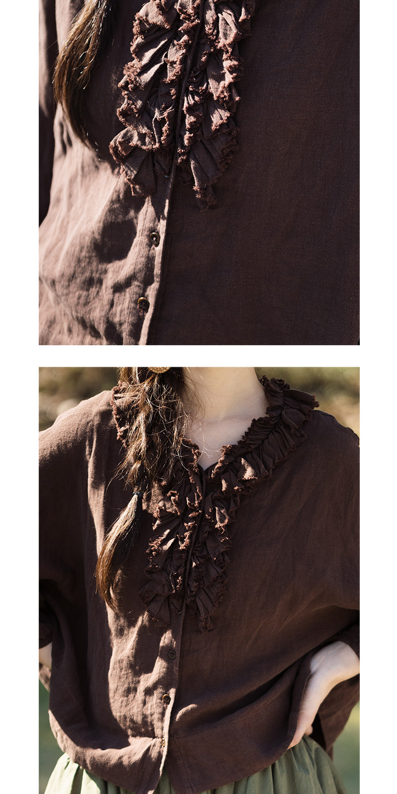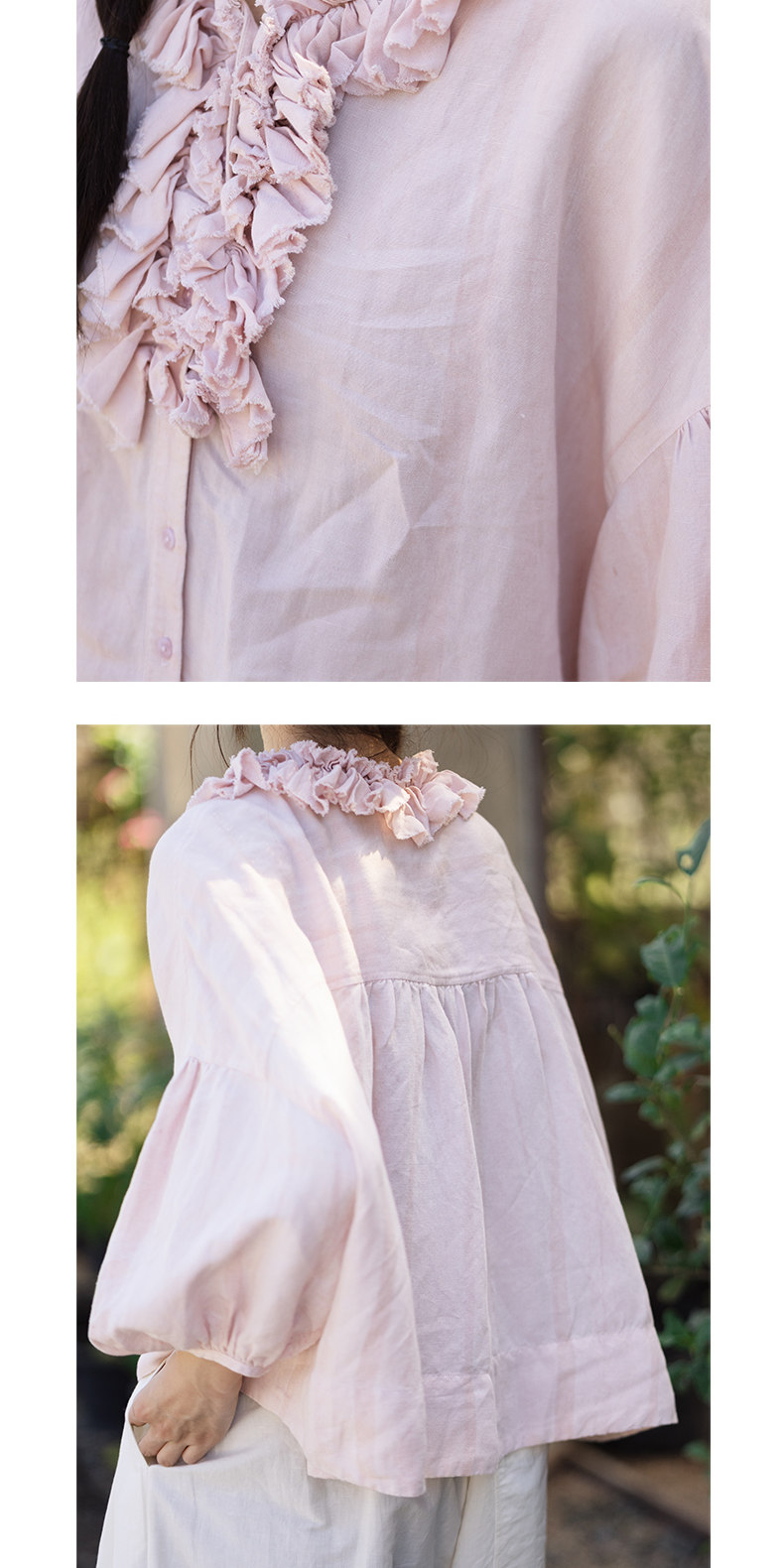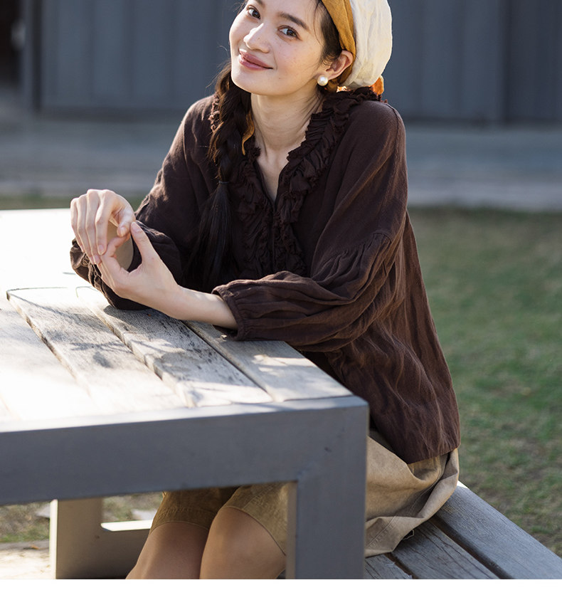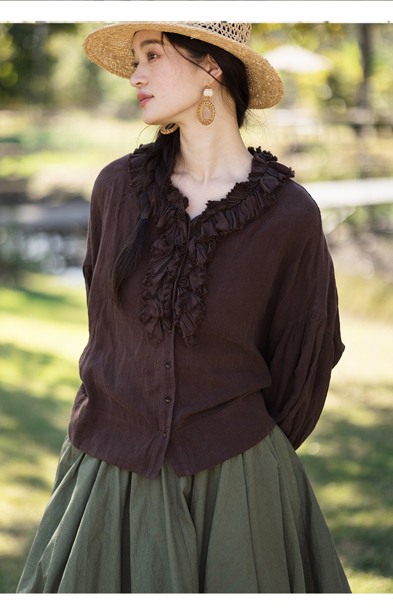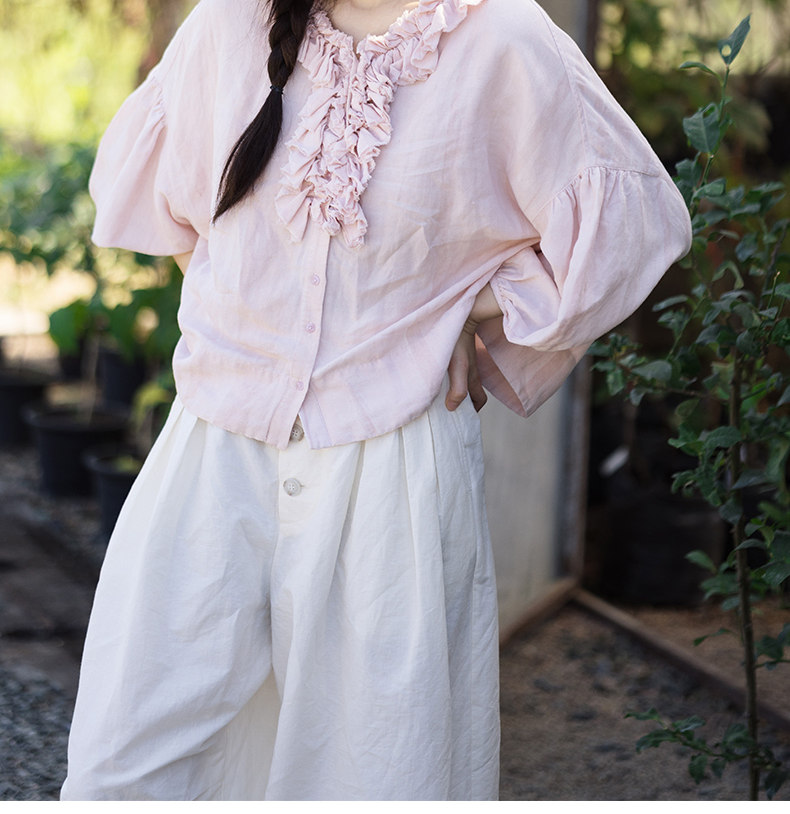 特绽放162朵/庄园衬衫*21支精梳亚麻复古手工木耳边领泡泡袖衬衫