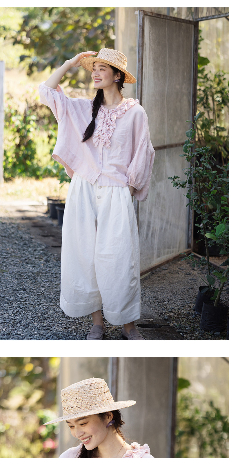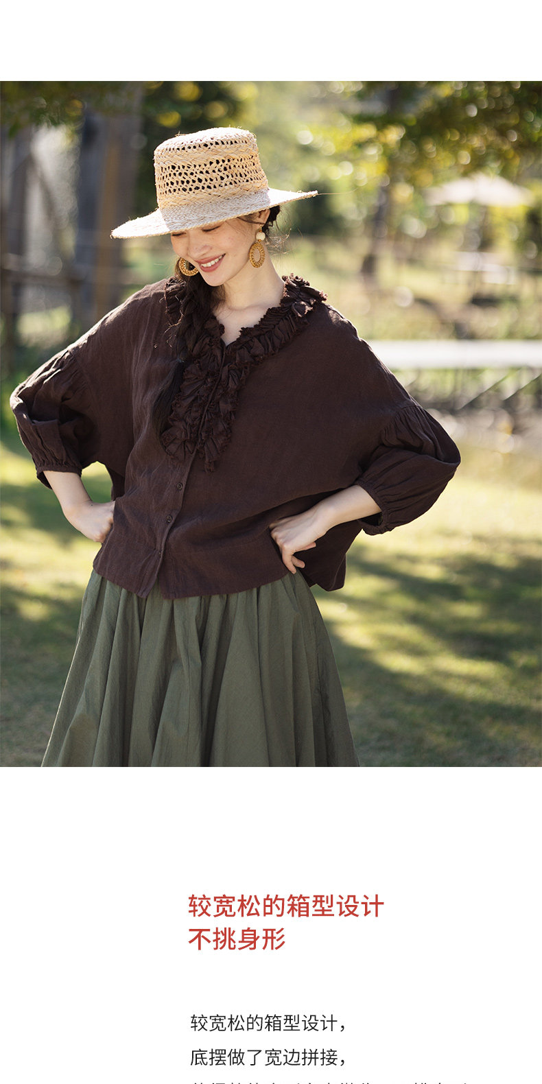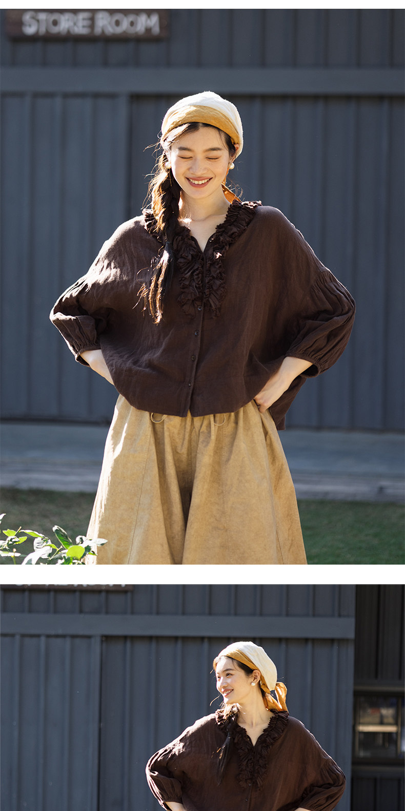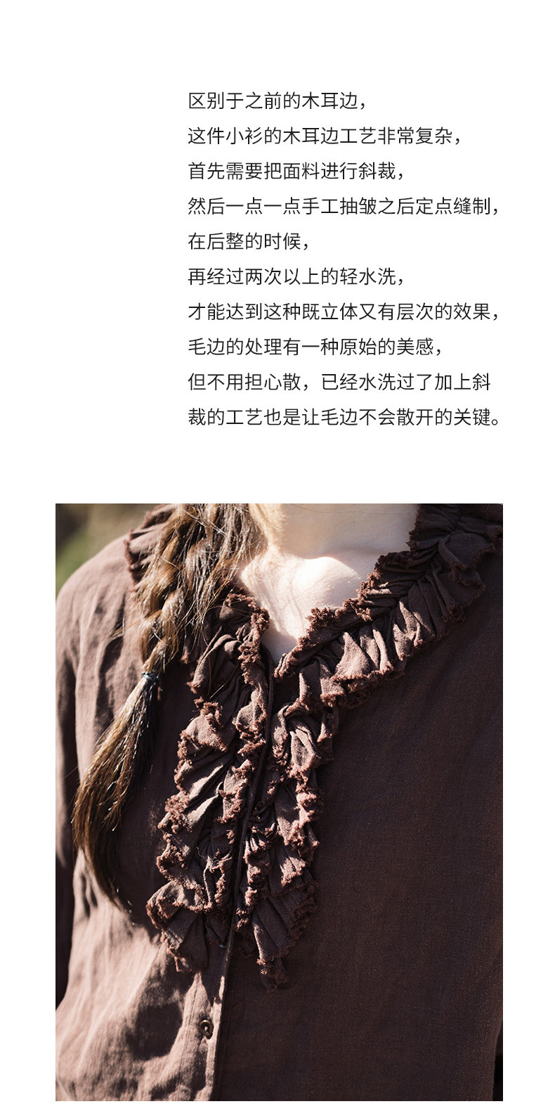 特绽放162朵/庄园衬衫*21支精梳亚麻复古手工木耳边领泡泡袖衬衫