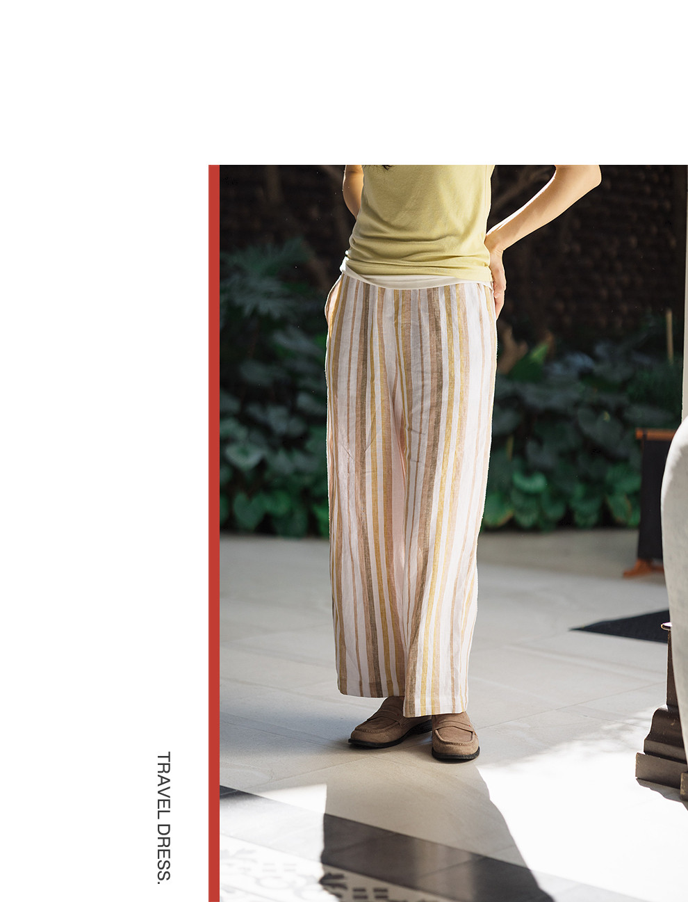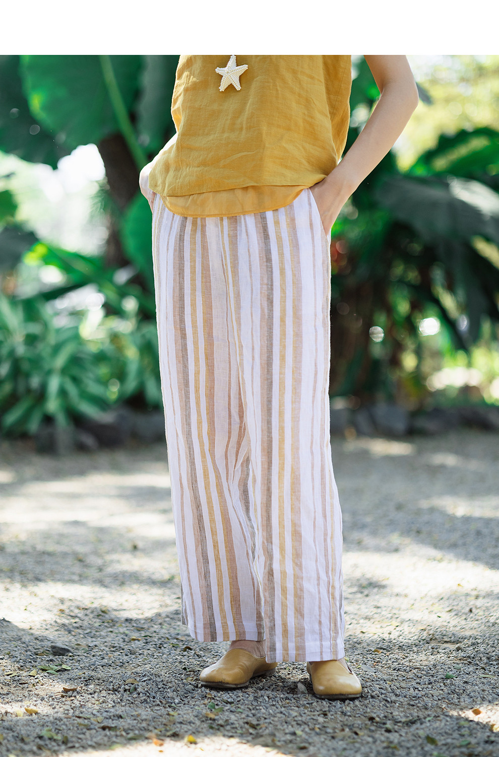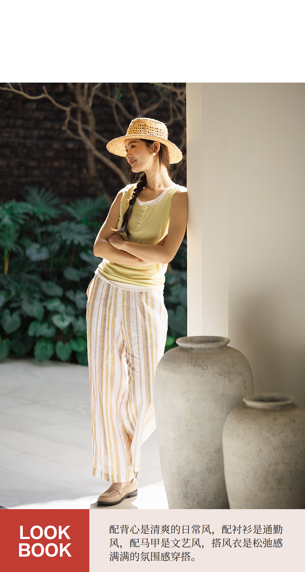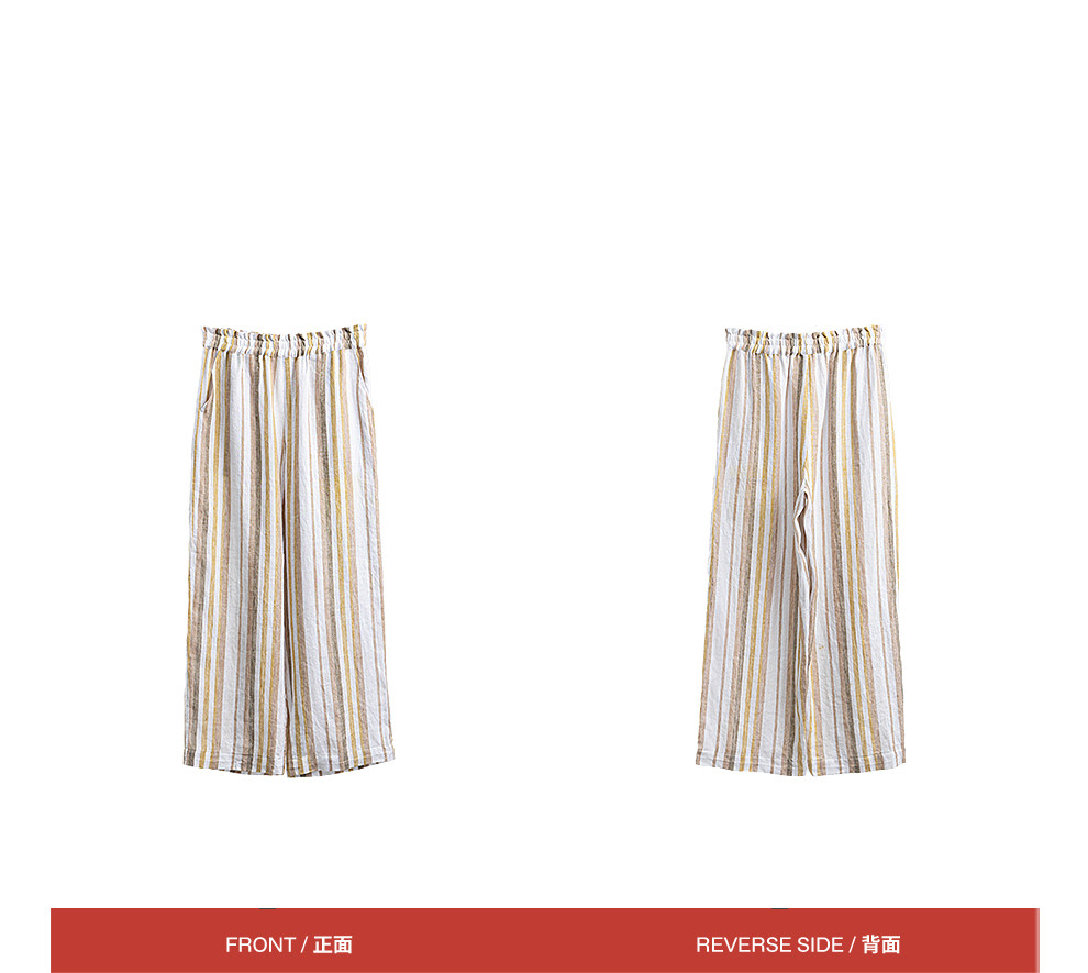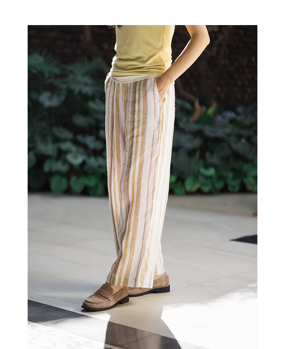 绽放105朵/色织亚麻条纹全腰松紧直筒裤经典百搭休闲裤女新款长裤