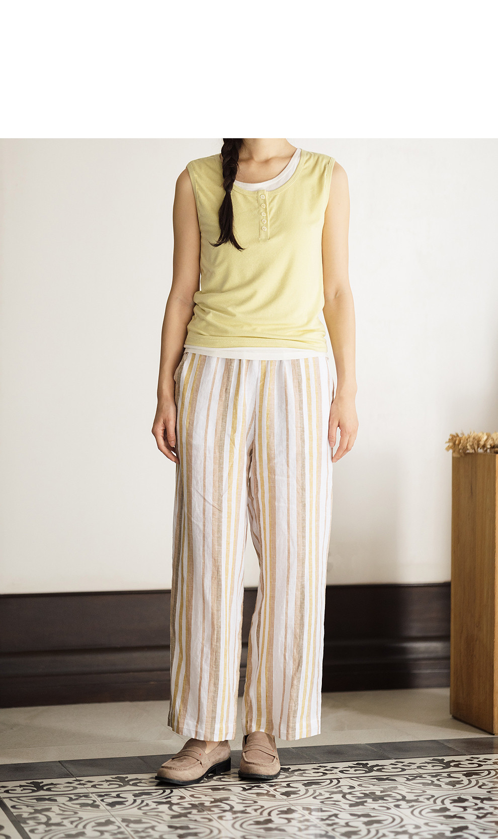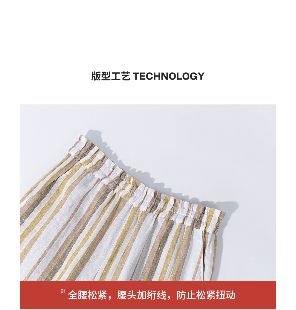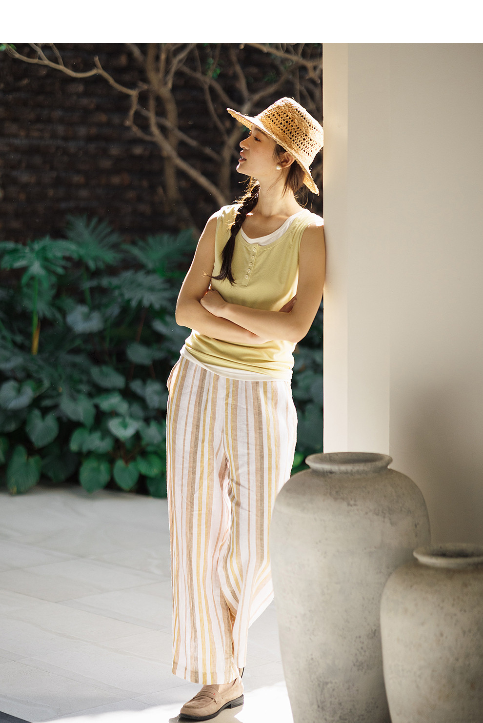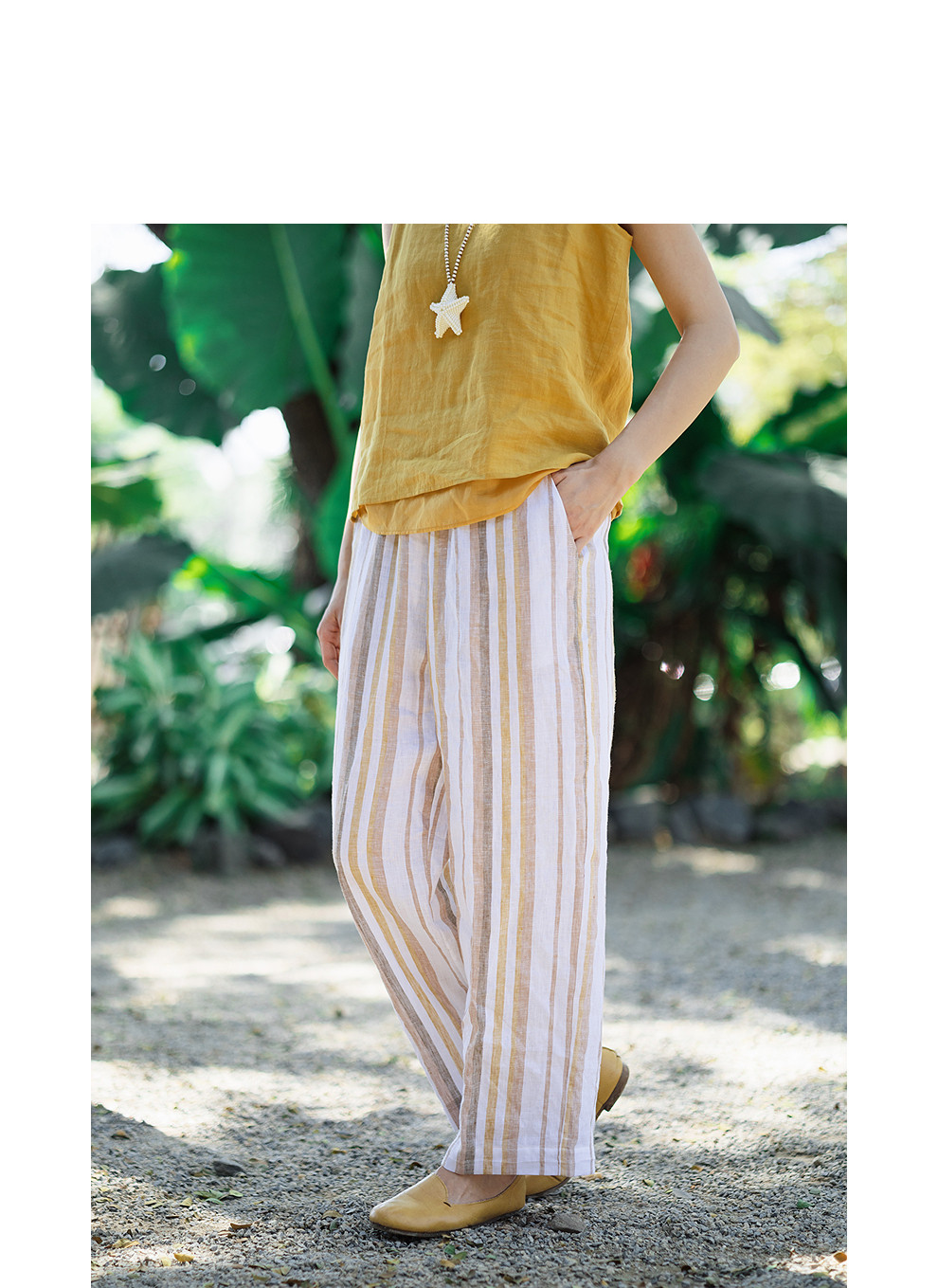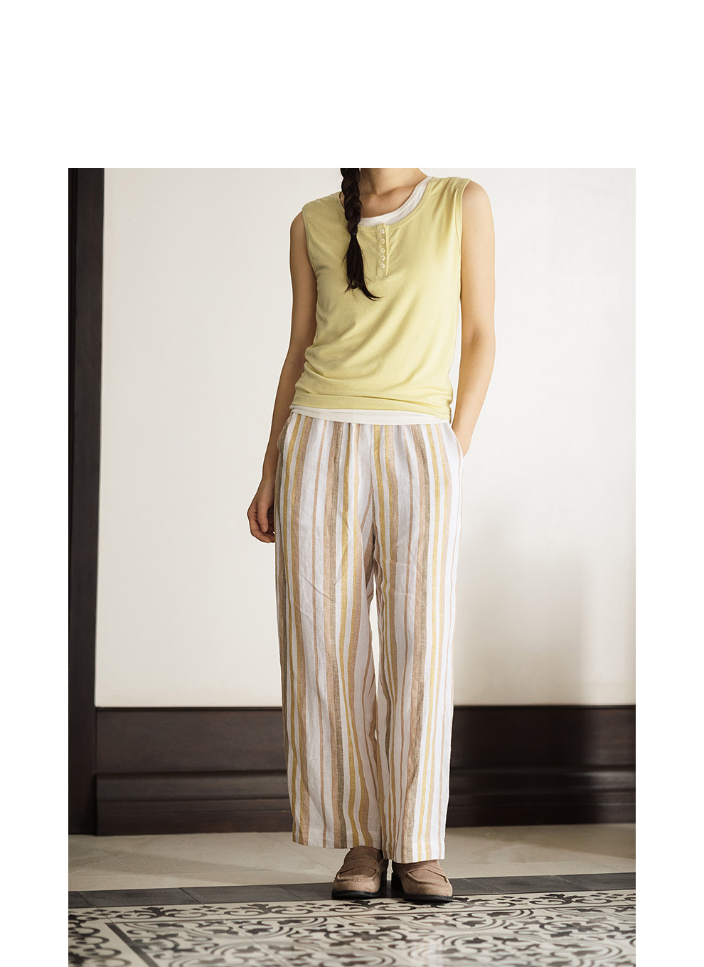 绽放105朵/色织亚麻条纹全腰松紧直筒裤经典百搭休闲裤女新款长裤