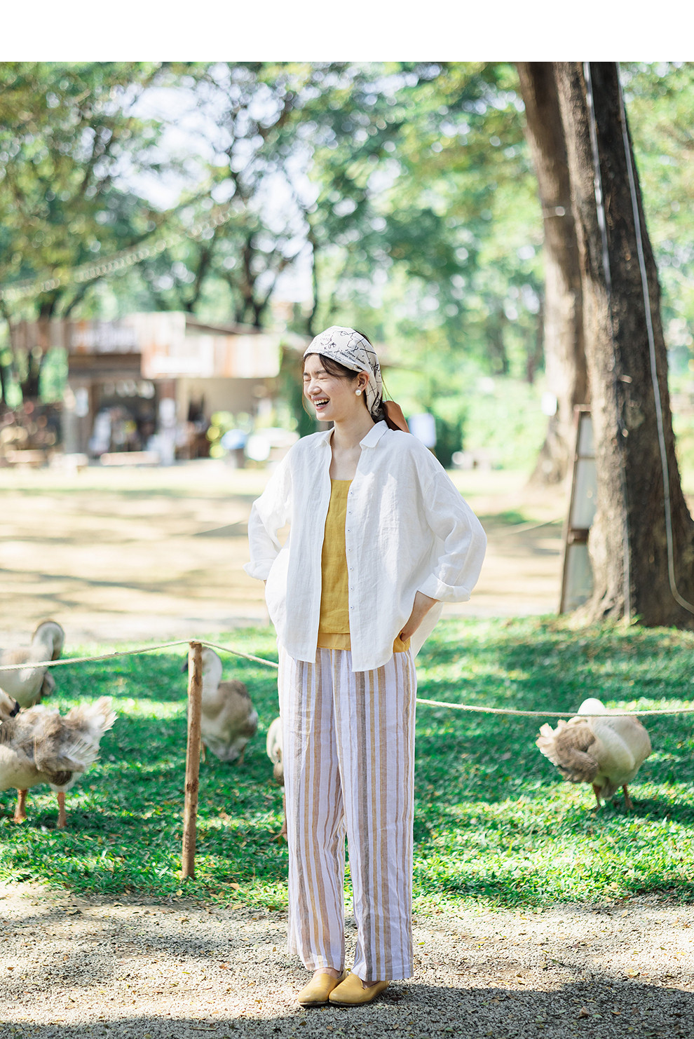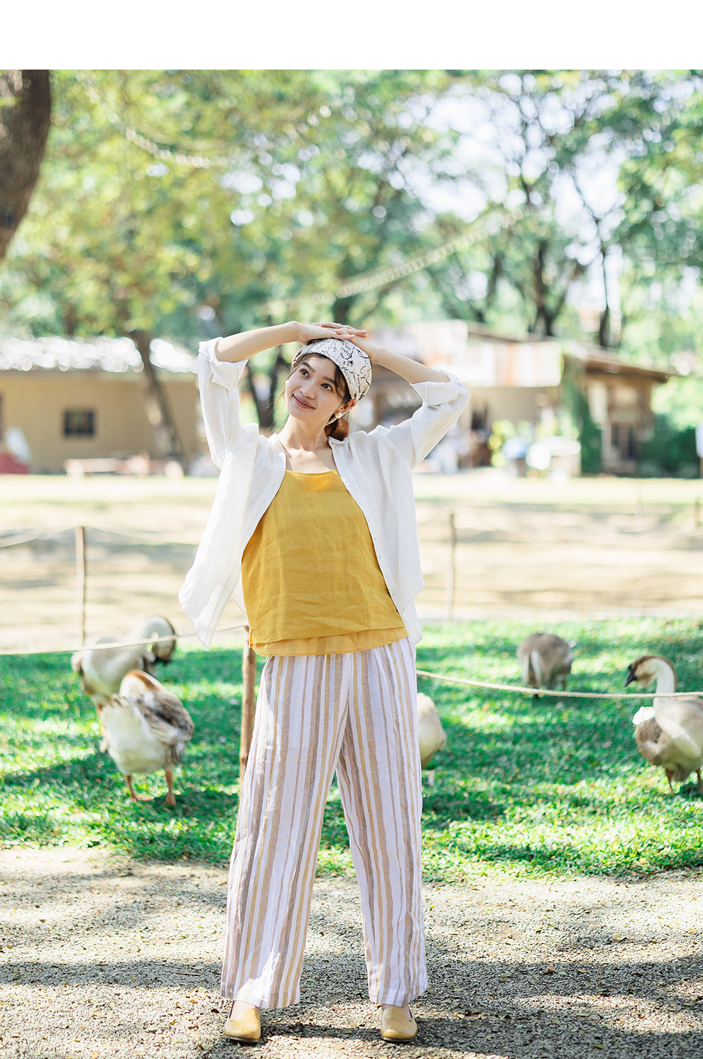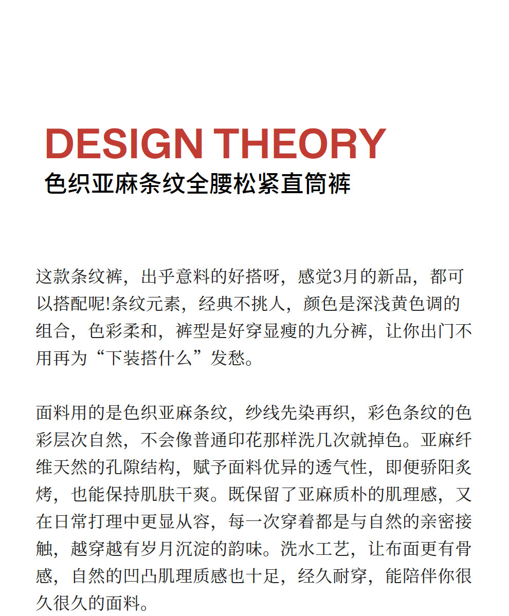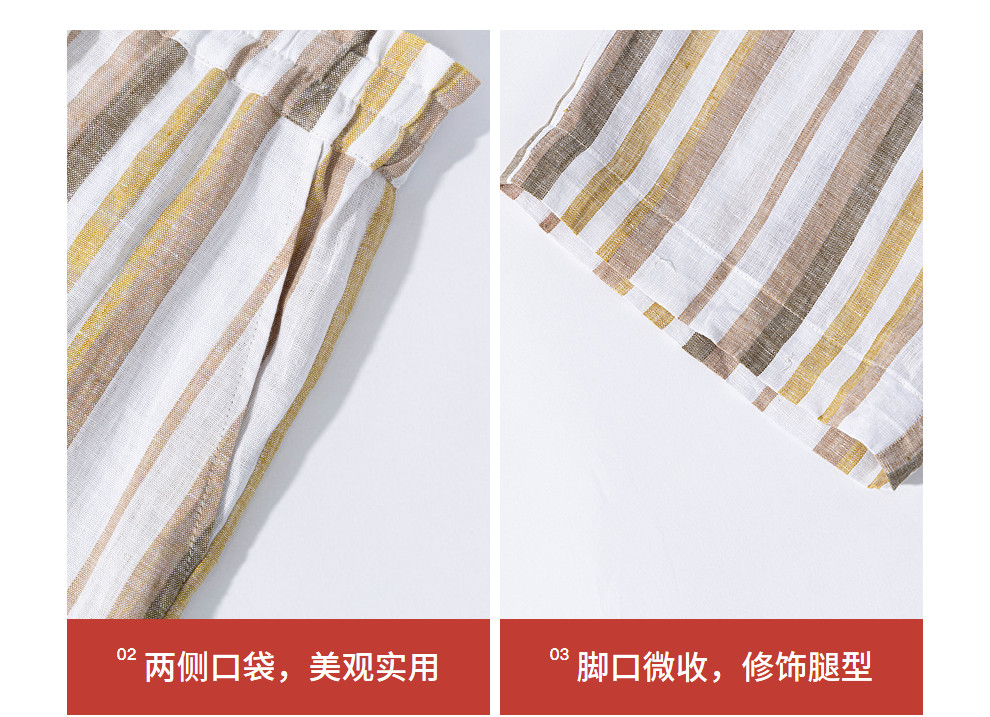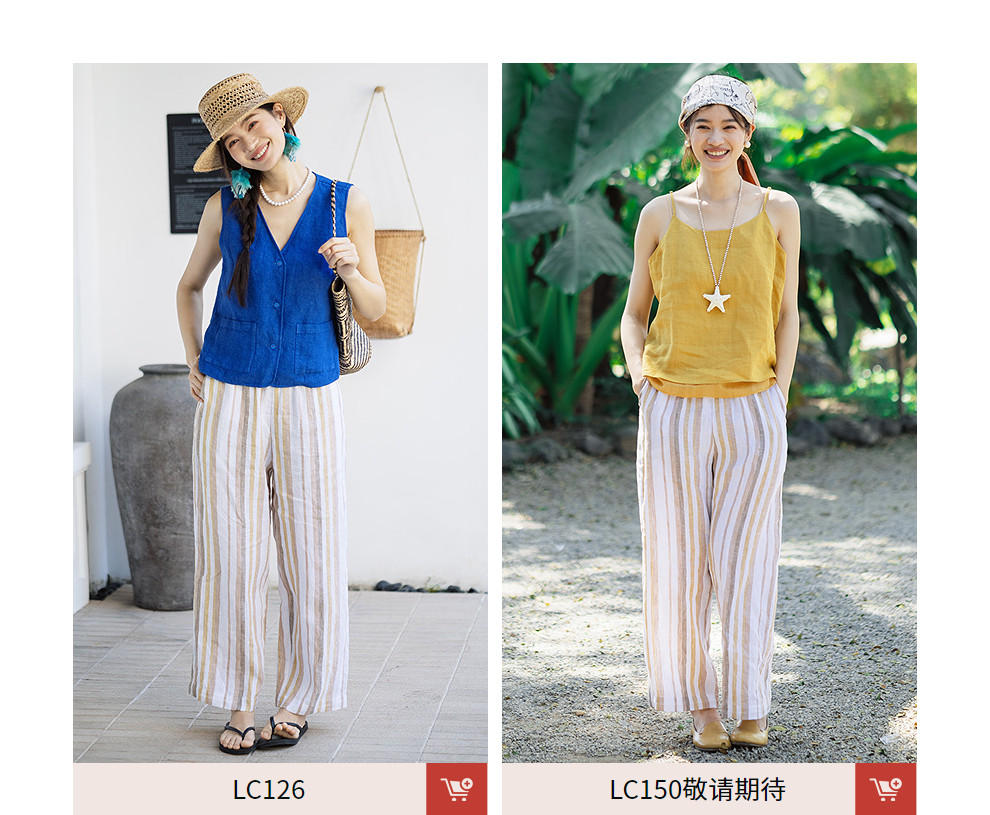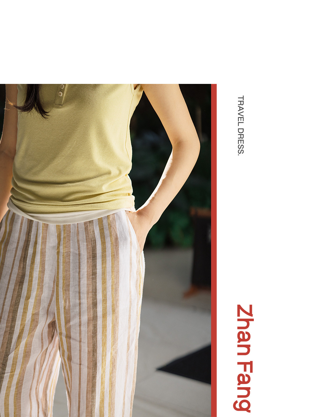 绽放105朵/色织亚麻条纹全腰松紧直筒裤经典百搭休闲裤女新款长裤
