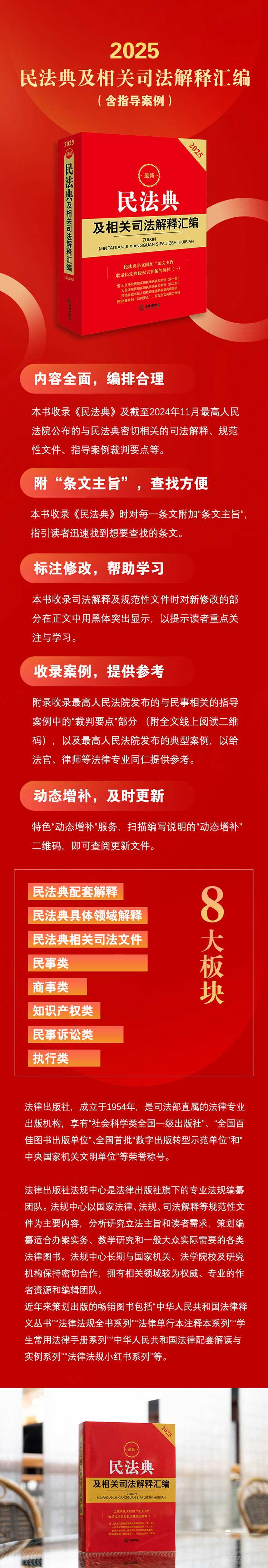 2021年1月1日,《中华人民共和国民法典》正式施行。习近平总书记在中央政治局就;切实实施民法典举行第二十次集体学习时强调,要切实推动民法典实施,以更好推进全面依法治国、建设社会主义法治国家,更好保障人民权益,并对加强民事司法工作、提高办案质量和司法公信力、及时完善相关民事司法解释、统一民事法律适用标准等提出明确要求。最高人民法院在民法典施行前完成了对591件司法解释及相关规范性文件的清理工作。其中,废止了116件;对名称和部分条款进行修改的共111件;与民法典规定一致,未作修改、继续适用的364件。同时,新制定了多件司法解释,分别涉及适用民法典时间效力、物权、担保制度、婚姻家庭、继承、劳动争议、建设工程合同等方面。除上述司法解释,最高人民法院还对《民事案件案由规定》进行了修改。民法典正式实施后,最高人民法院又公布了《最高人民法院关于审理申请注册的药品相关的专利权纠纷民事案件适用法律若干问题的规定》《最高人民法院关于适用〈中华人民共和国民法典〉总则编若干问题的解释》等与民法典密切相关的司法解释及司法文件。秉持;为人民传播法律的宗旨,法律出版社法规中心精心修订了《最新民法典及相关司法解释汇编》一书,以帮助广大法官、律师等法律专业的同仁学习使用。本书具有如下特点:1.本书收录民法典及截至2024年11月最高人民法院公布的与民法典密切相关的司法解释、规范性文件、指导案例裁判要点等,内容全面,编排合理。2.本书收录民法典时对每一条文附加;条文主旨,指引读者迅速找到想要查找的条文。3.本书收录司法解释及规范性文件时对新修改的部分在正文中用黑体突出显示,以提示读者重点关注与学习。4.本书收录了最高人民法院发布的与民事相关的指导案例中的;裁判要点部分(附全文线上阅读二维码),以及最高人民法院2022年2月25日发布的《人民法院贯彻实施民法典典型案例(第一批)》、2022年4月11日发布的《民法典颁布后人格权司法保护典型民事案例》、2023年1月12日发布的《人民法院贯彻实施民法典典型案例(第二批)》等,以给法官、律师等法律专业同仁提供参考。5.为了方便广大读者能够持续了解、学习与民法典相关的法律文件,本书推出特色动态增补服务。请读者扫描动态增补二维码,查看、阅读本书出版后一段时间内更新的或新发布的法律文件。希望本书能为广大读者朋友的工作和学习提供有益帮助。本书不足之处,欢迎读者指正。