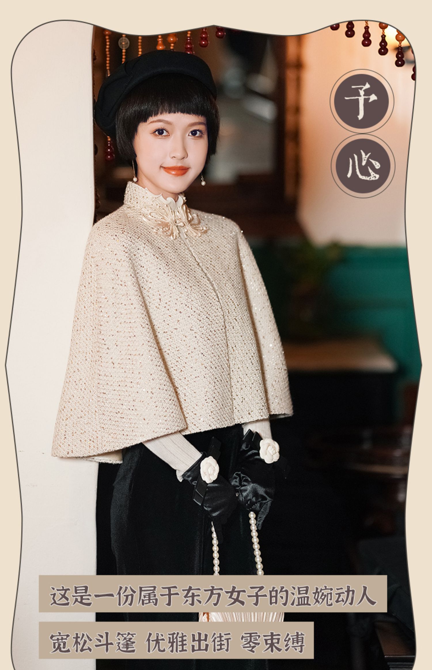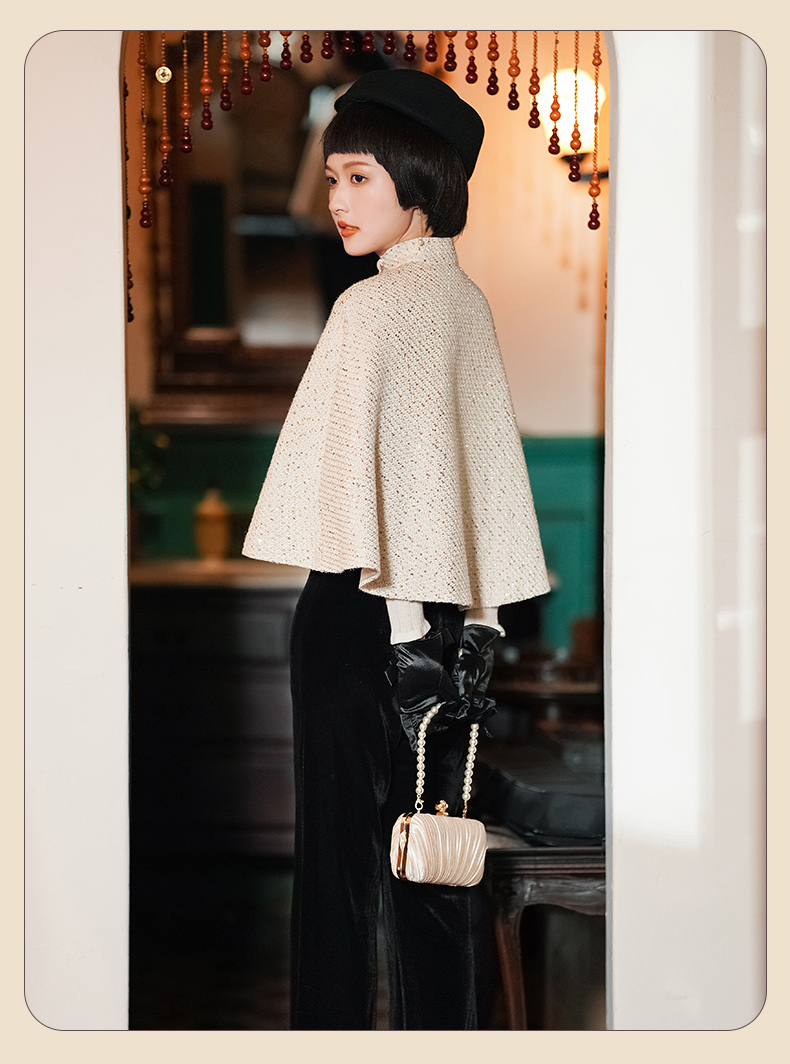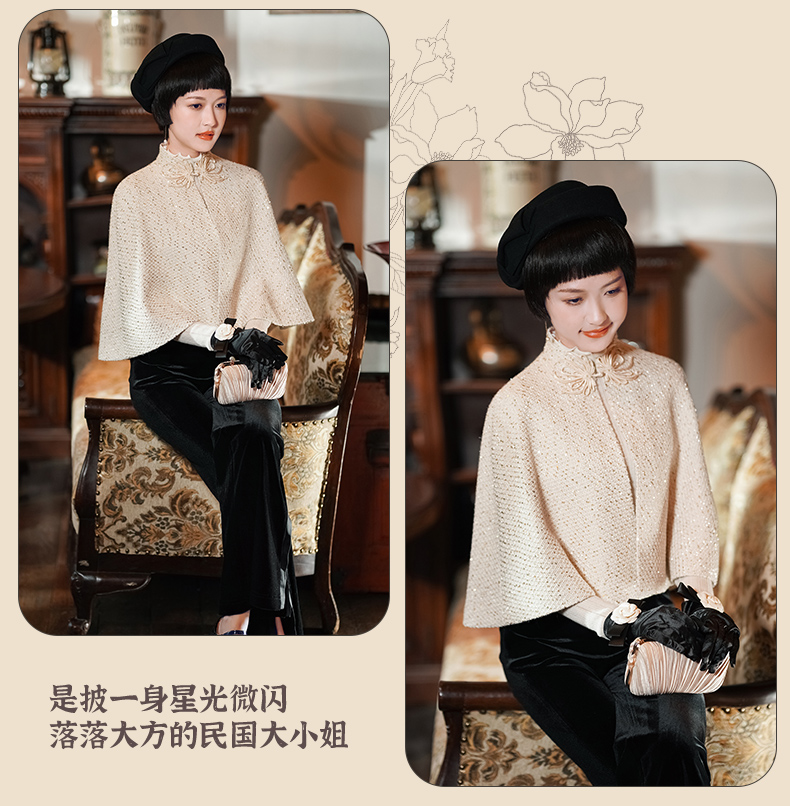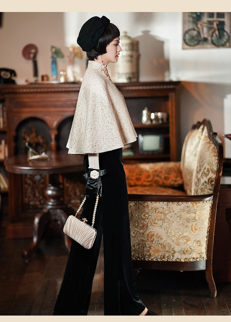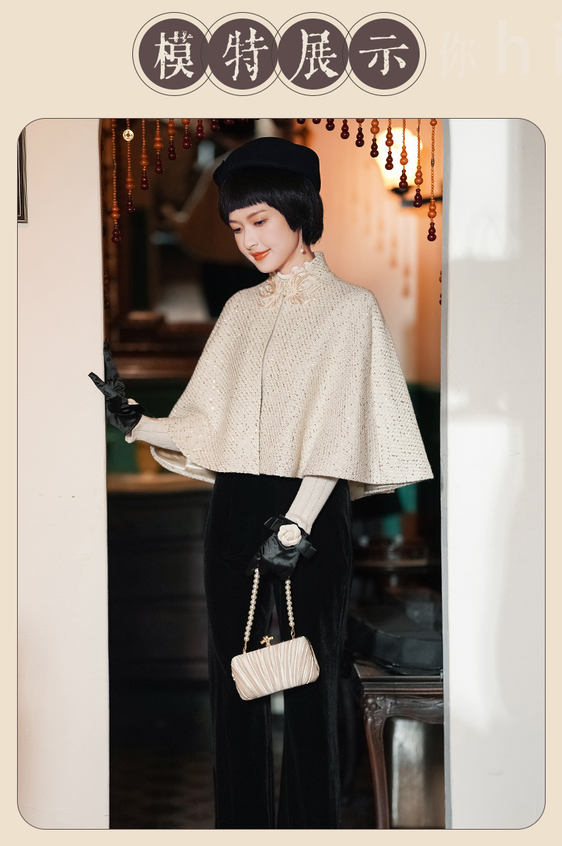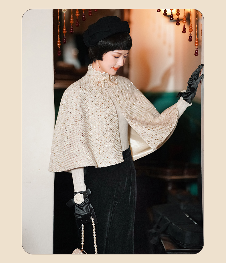 逸红颜 予心 2025冬季新款粗花呢外套香槟色旗袍披肩外搭斗篷时尚