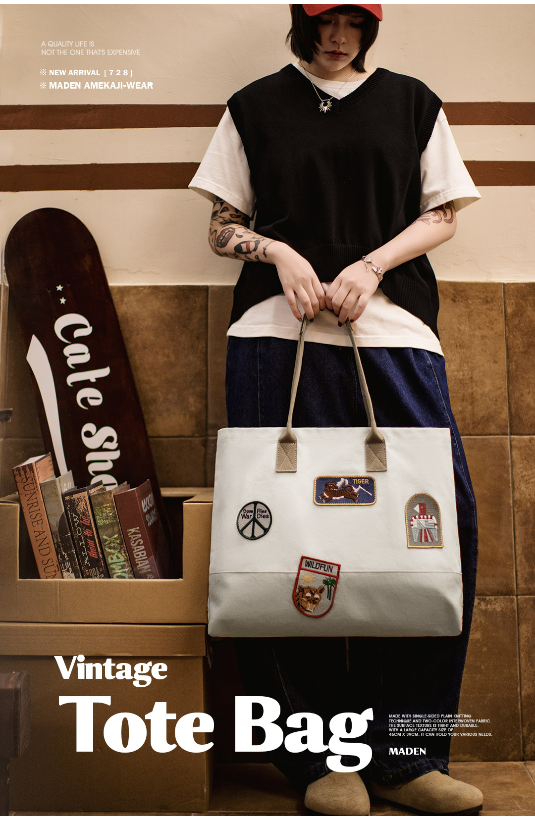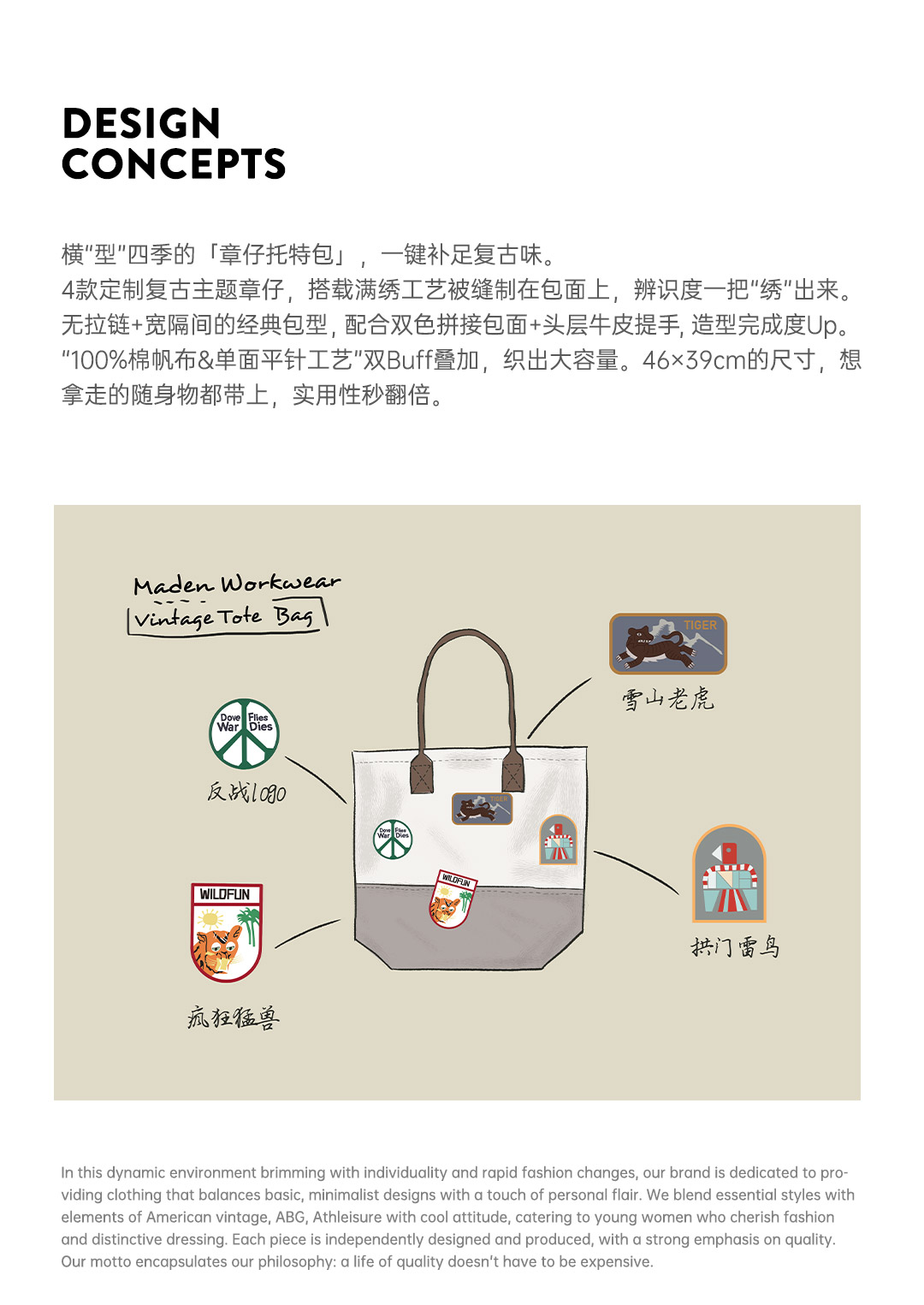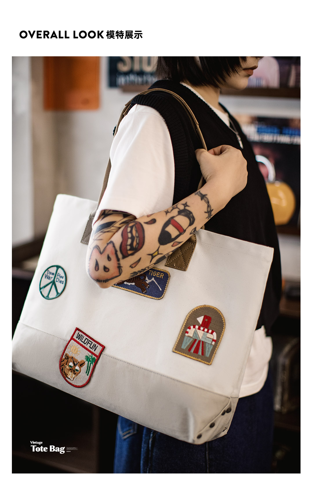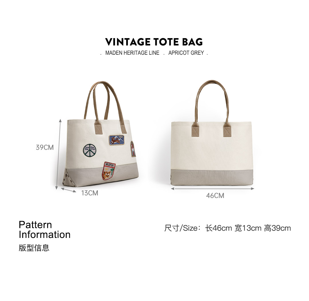 马登美式复古刺绣徽章帆布托特包大容量电脑包上课通勤手提报童包