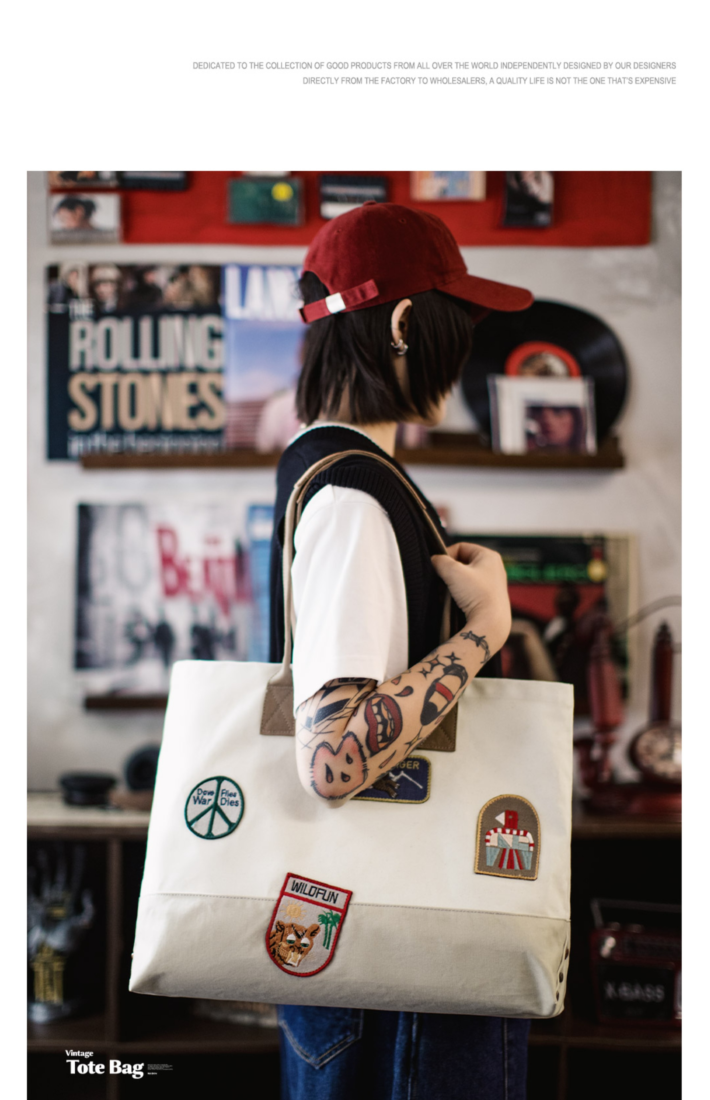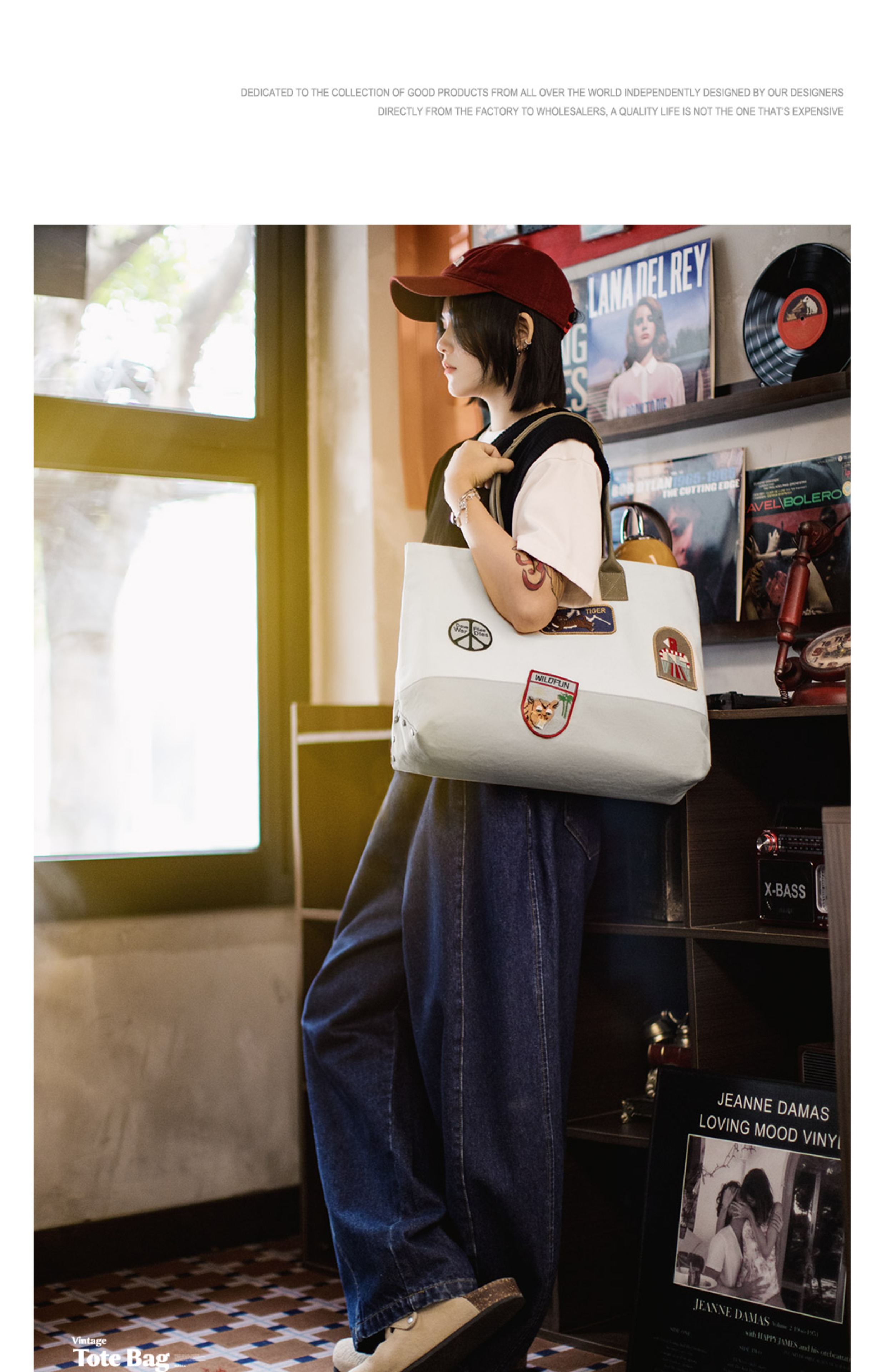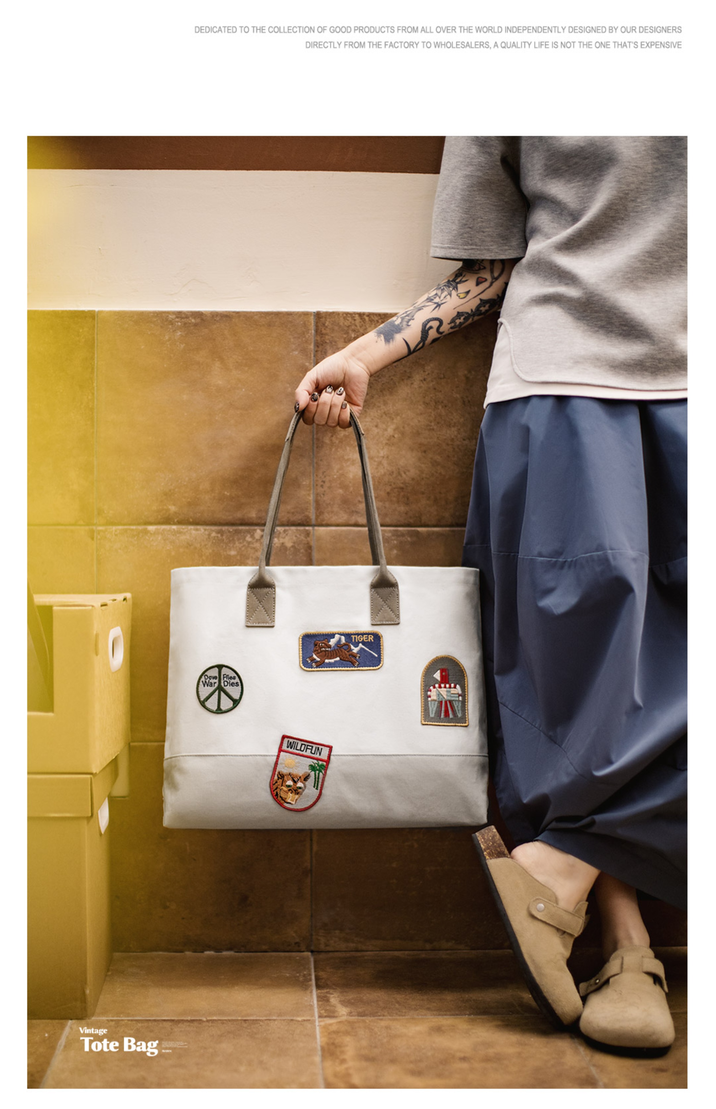 马登美式复古刺绣徽章帆布托特包大容量电脑包上课通勤手提报童包
