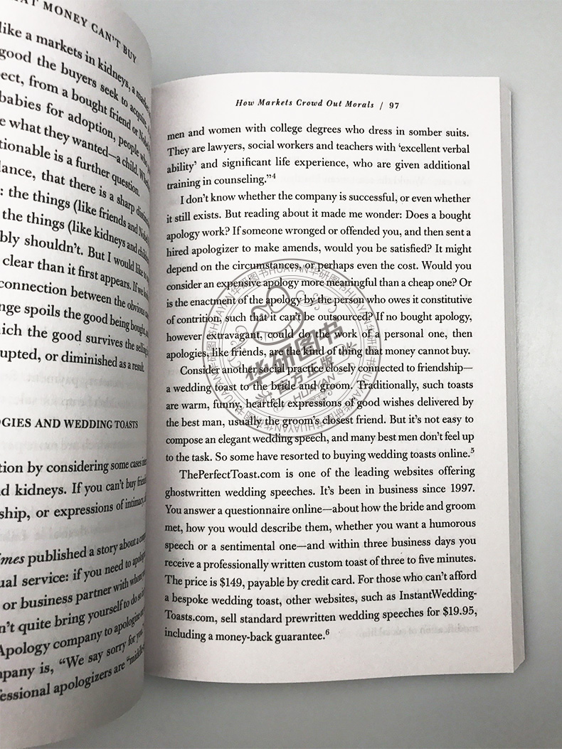 在What Money Can't Buy《金钱不能买什么》中,迈克尔�9�9桑德尔论述了当下突出的道德问题之一:在我们这个世界,任何事物都可以出售,这个世界难道没有问题?如果是这样,我们又该如何防止市场价值观侵蚀本不该由它们主导的领域?市场的道德界限又何在?