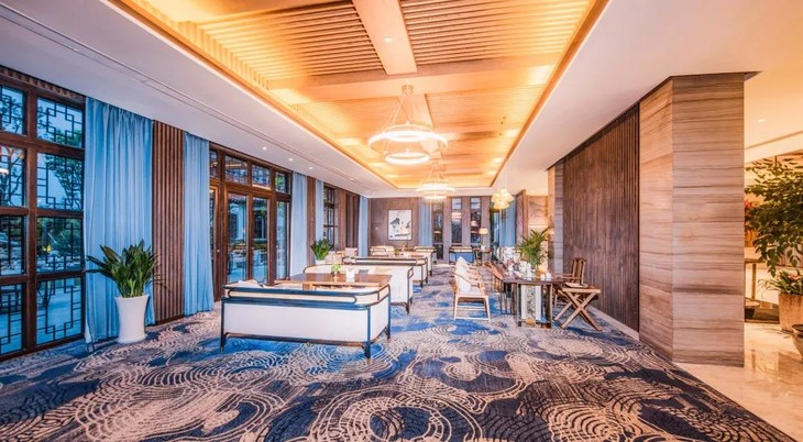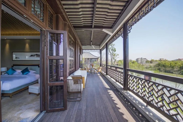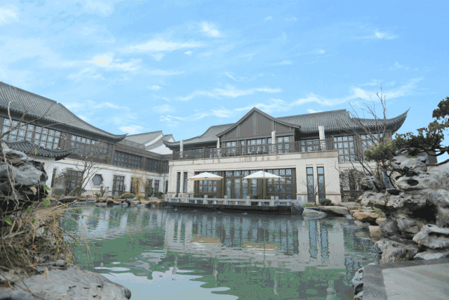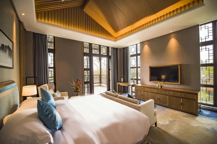 整体风格以江南园林建筑配以现代新中式的装修风格,白墙黑瓦和潺潺流水贯穿了整个酒店,恍如置身山水画中