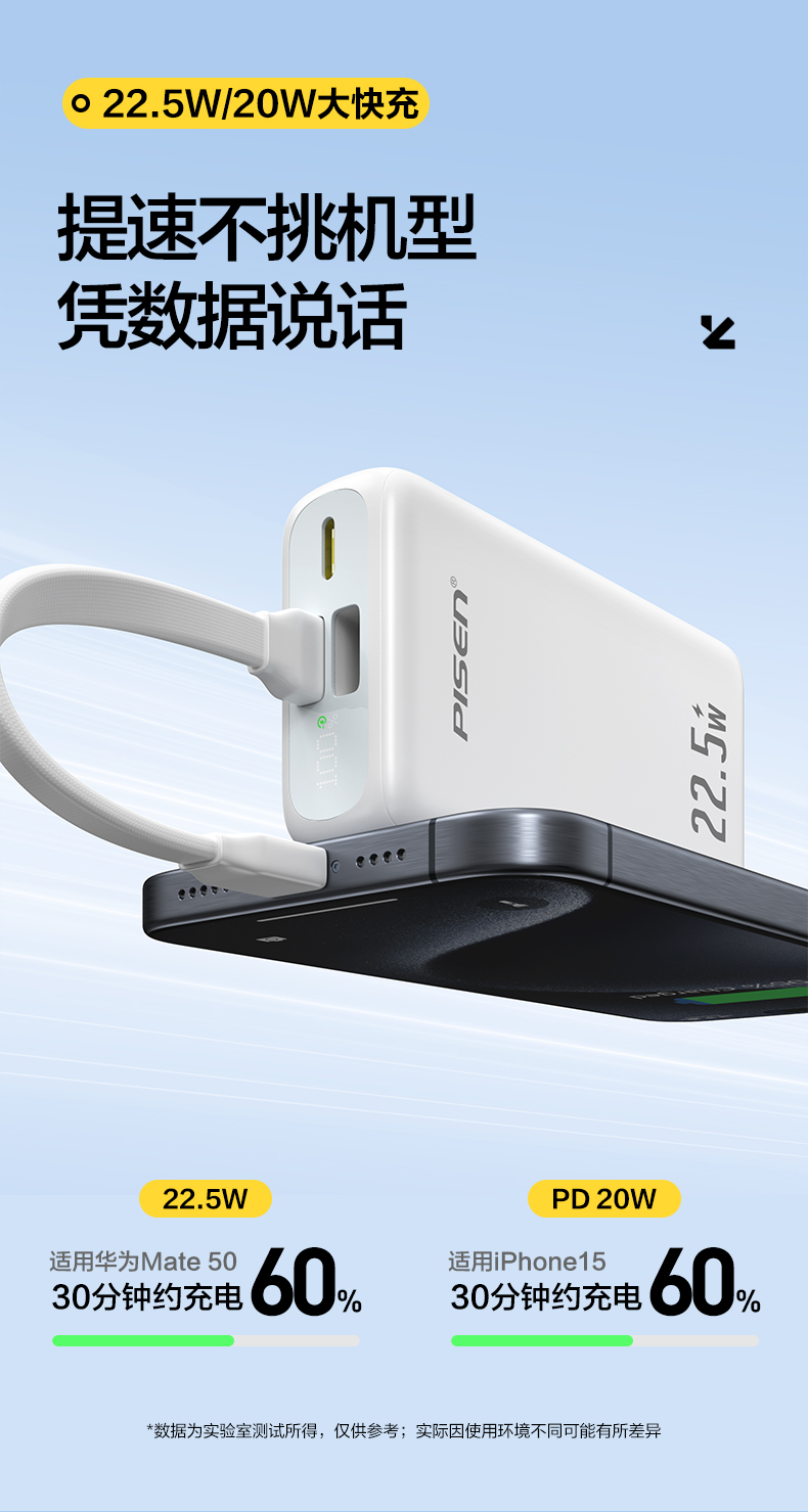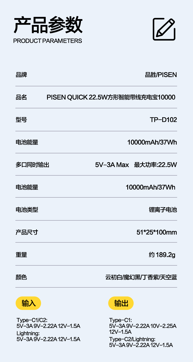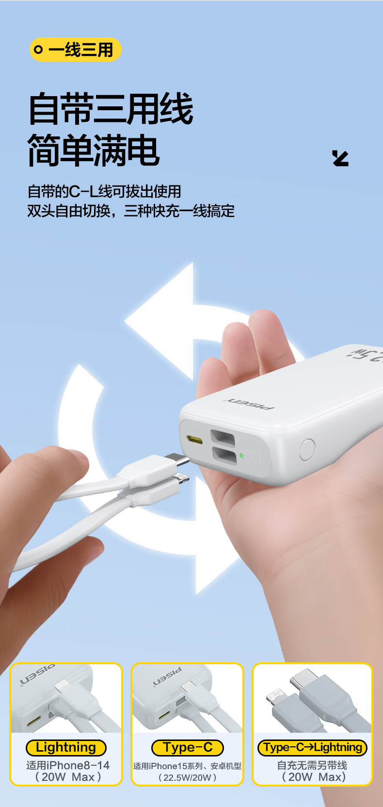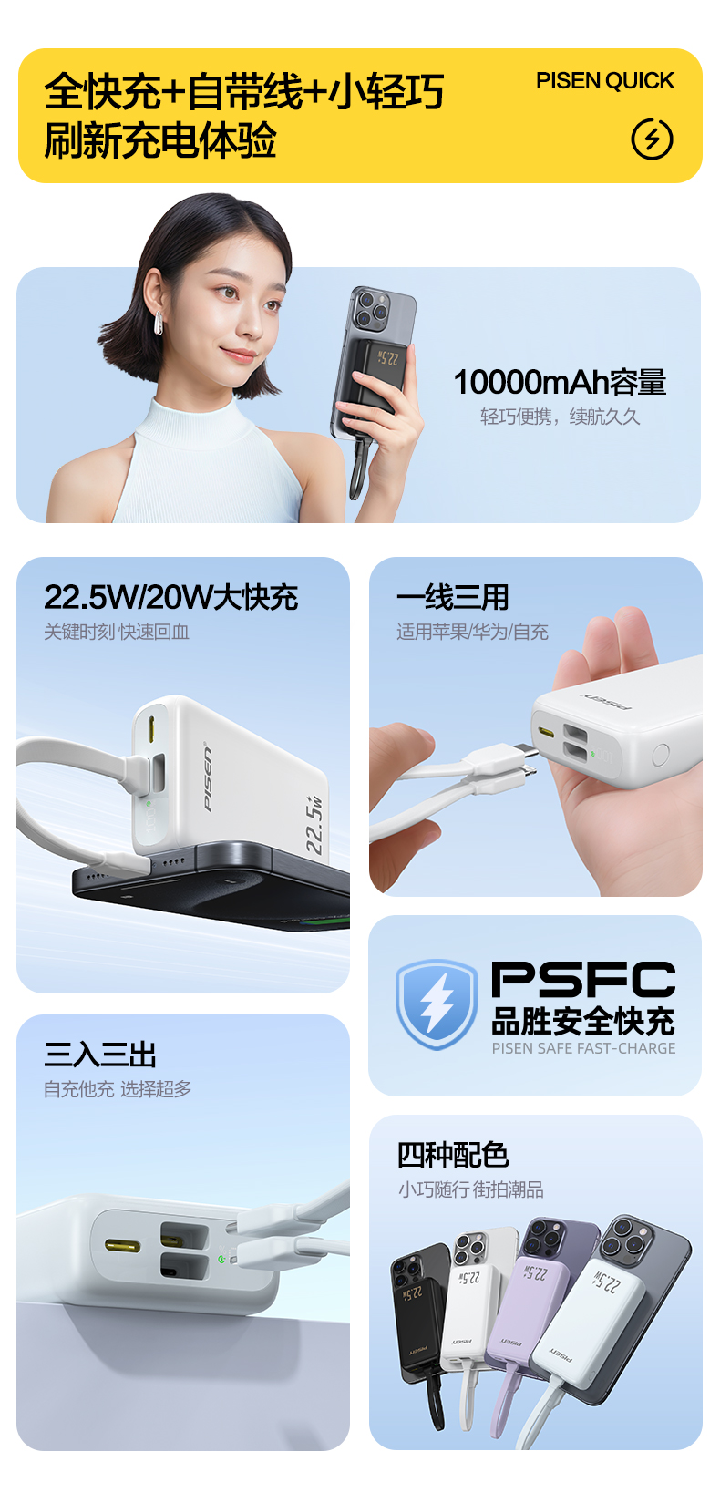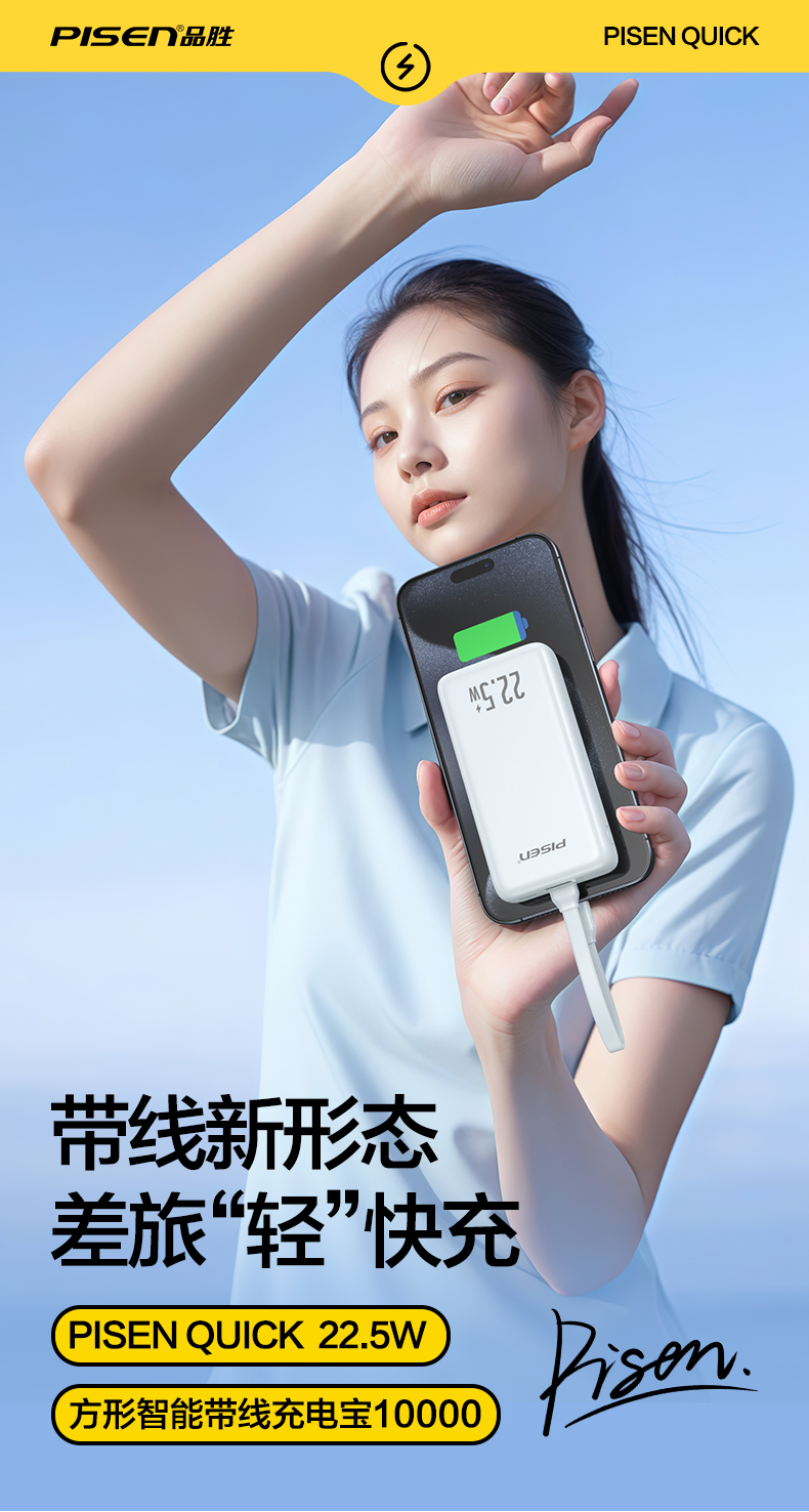 品胜 22.5W方形智能带线充电宝10000毫安 自带线苹果/C口数据线 快充移动电源