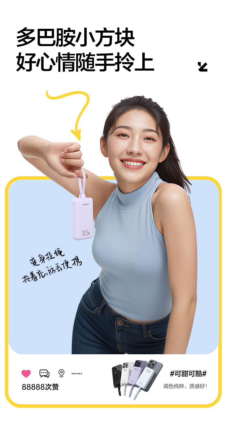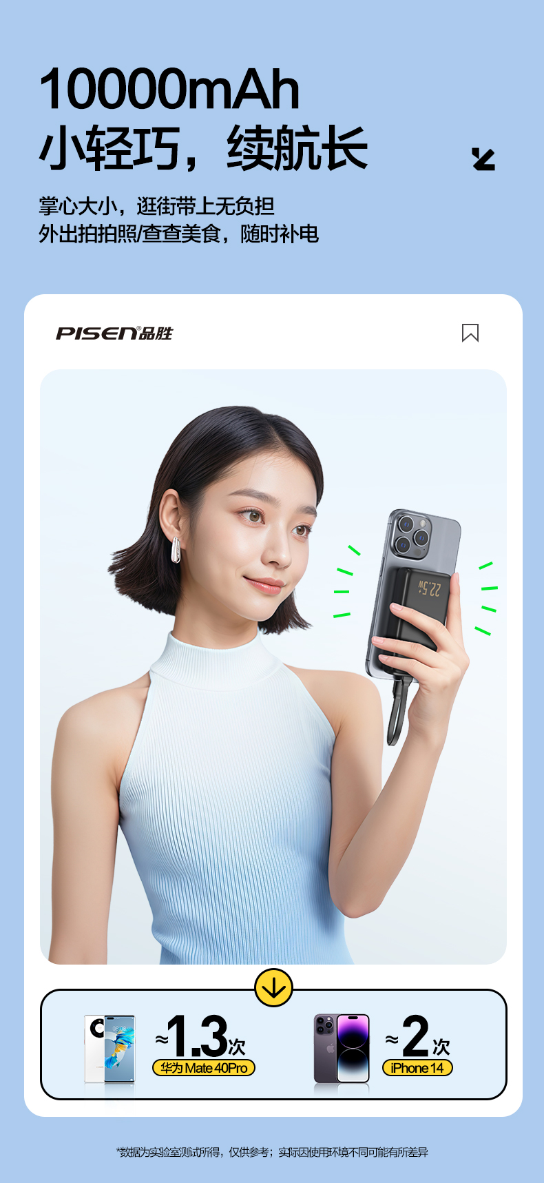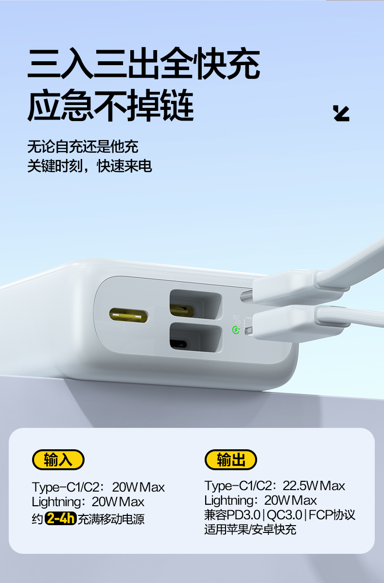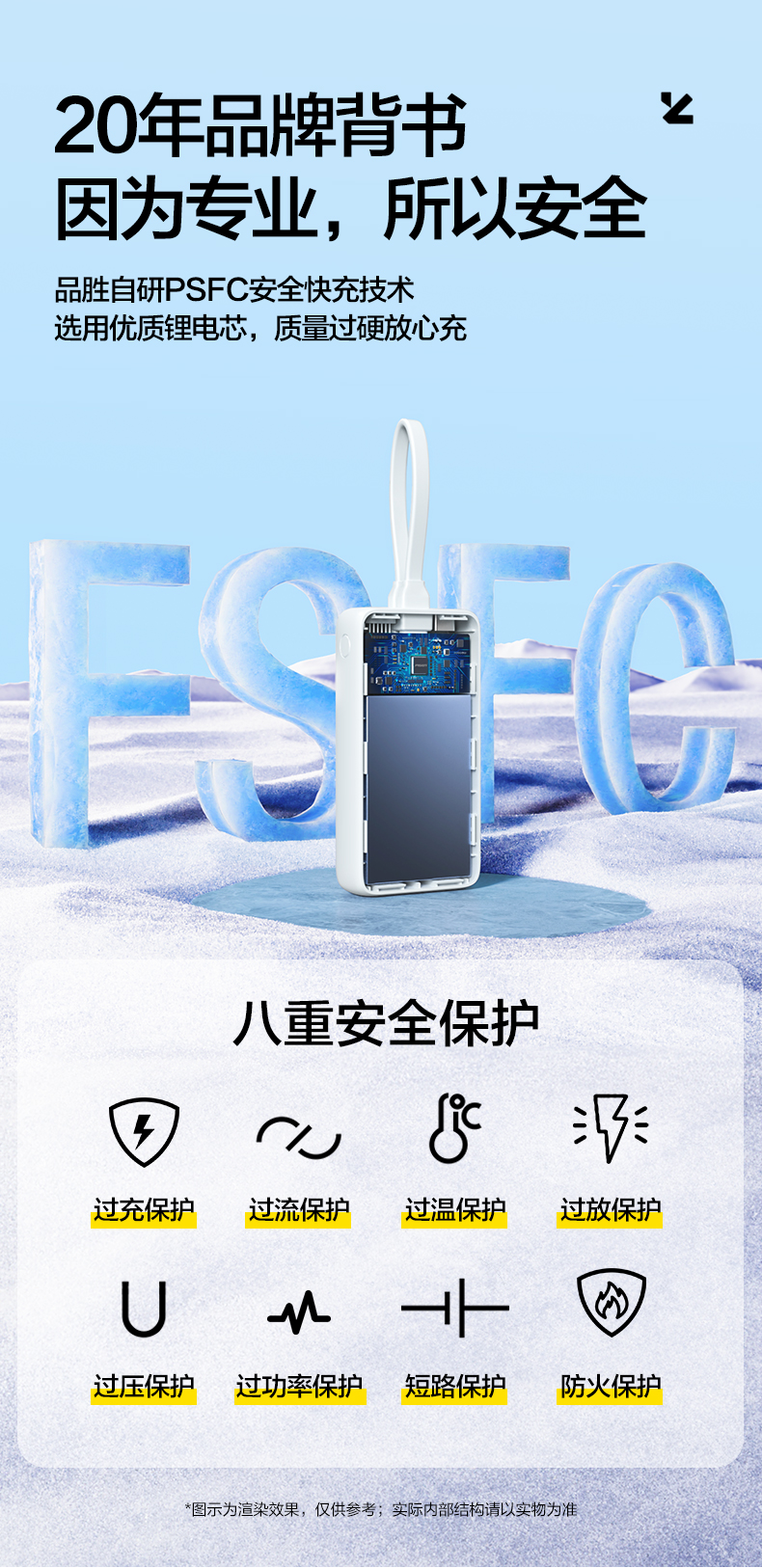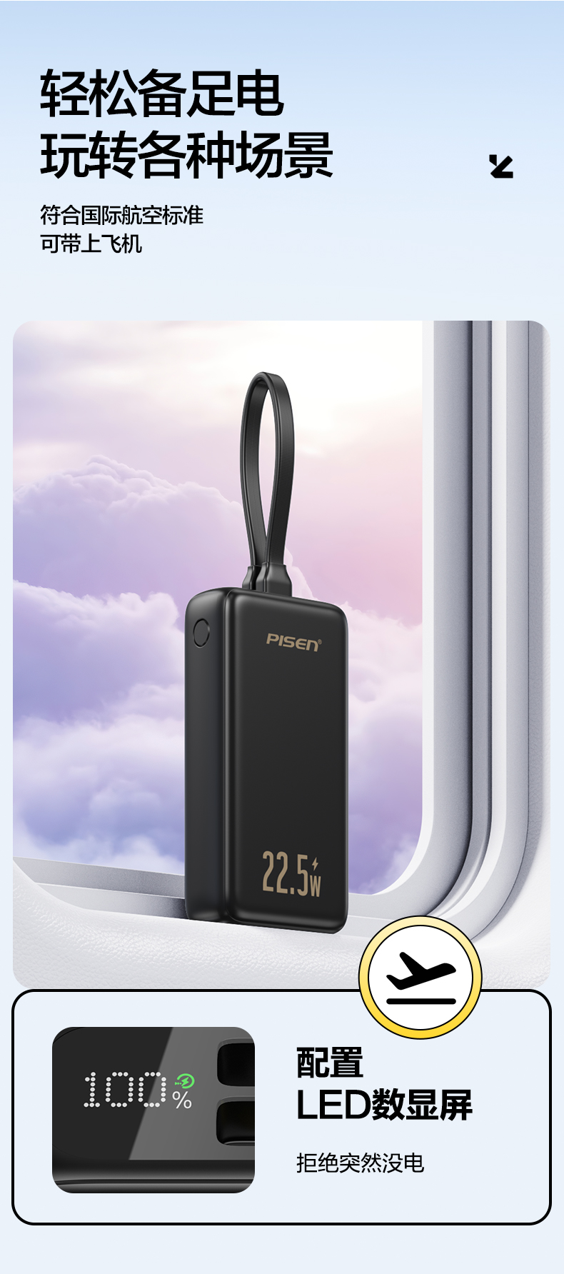 品胜 22.5W方形智能带线充电宝10000毫安 自带线苹果/C口数据线 快充移动电源