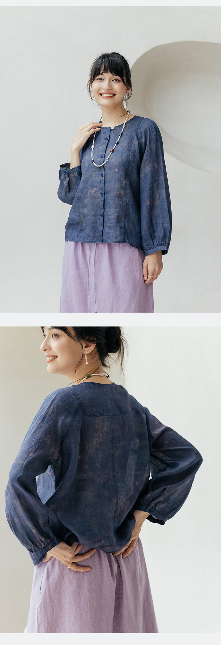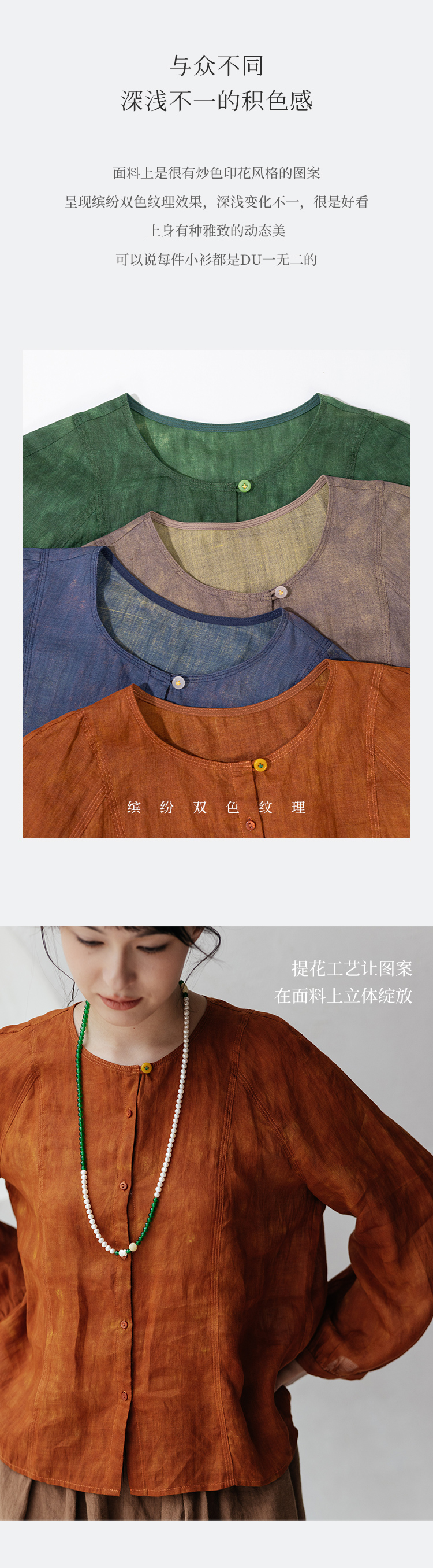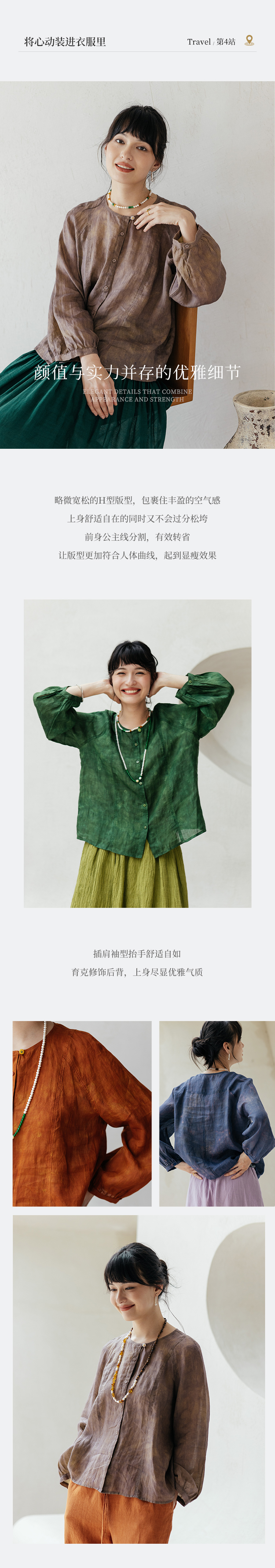 * 绽放旅行女装607朵/早秋新款双色苎麻炒色印花小衫玉石扣长袖衬衫