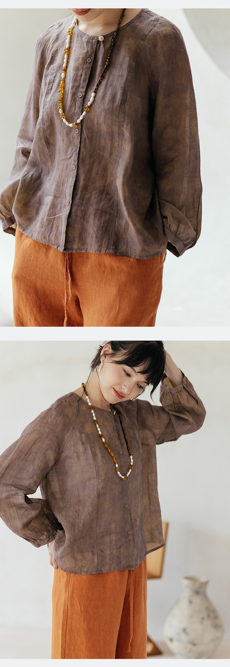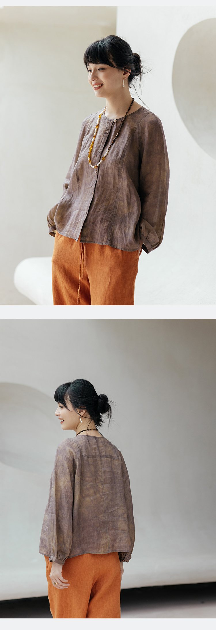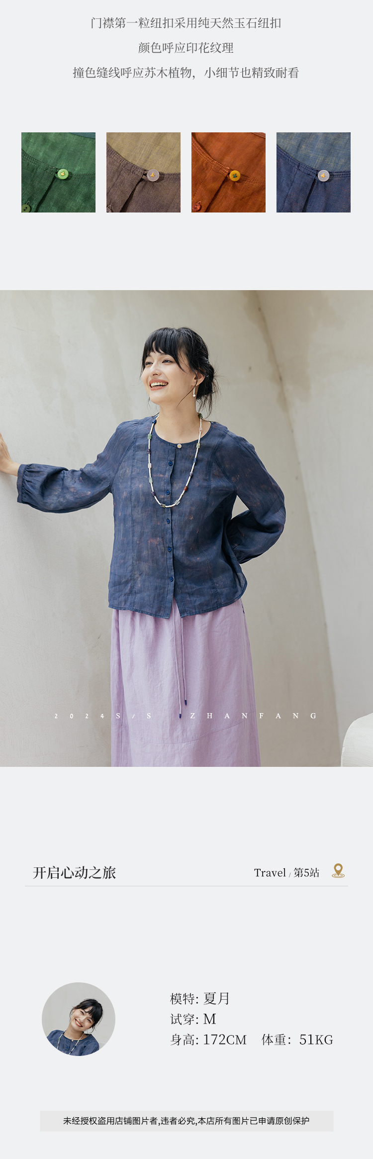 * 绽放旅行女装607朵/早秋新款双色苎麻炒色印花小衫玉石扣长袖衬衫