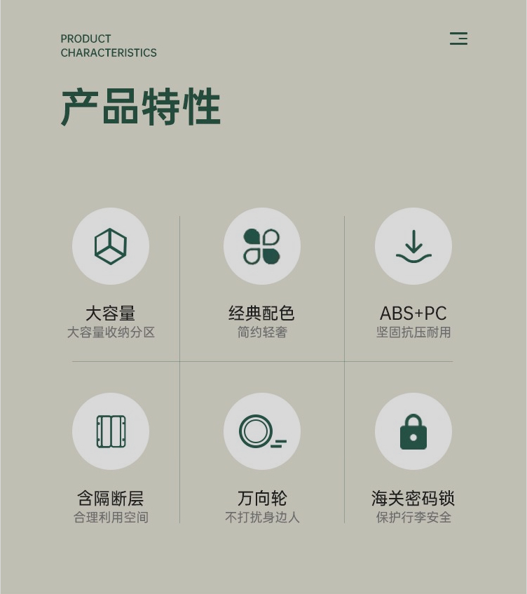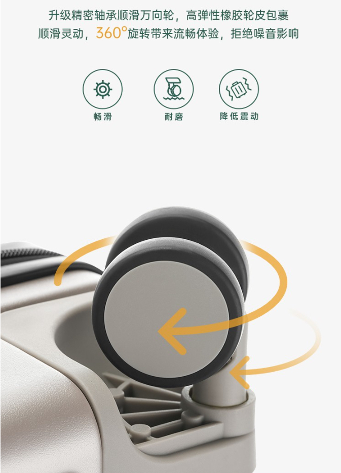 ✈轻奢款式,气质感外观配色,下沉式海关密码锁、PP静音万向轮及口袋标logo加持,日常出行更有范。