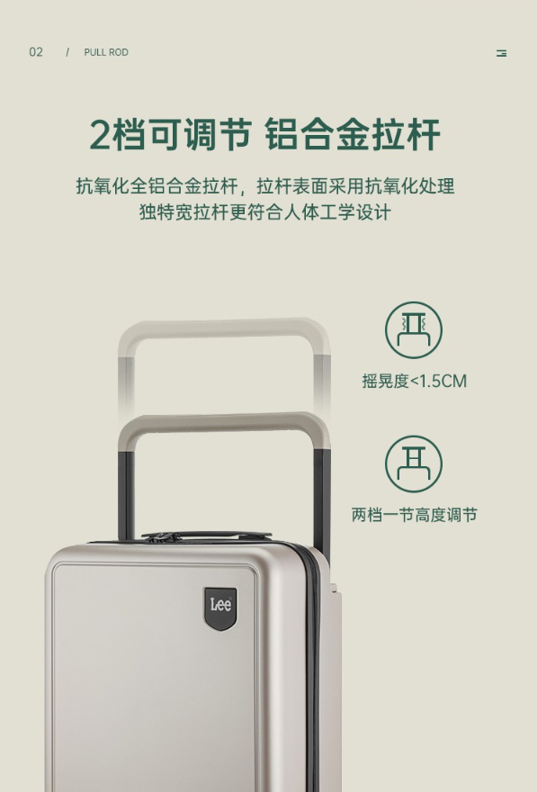 ✈独特宽拉杆更符合人体工学设计,多种地面畅行无阻,从容优雅。