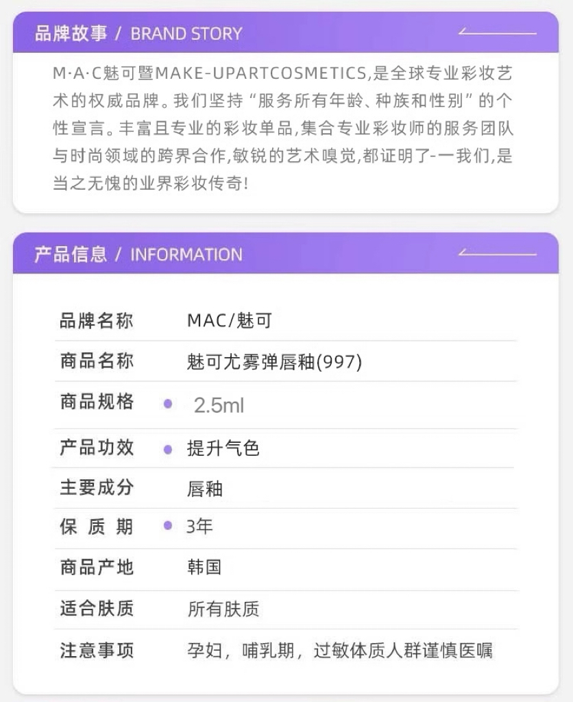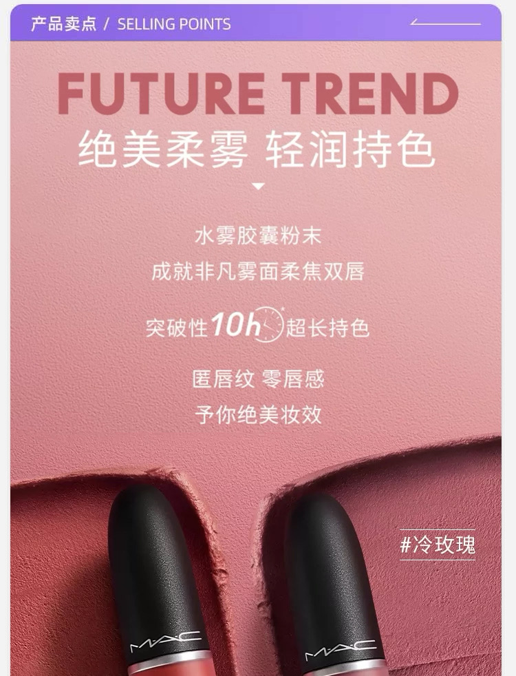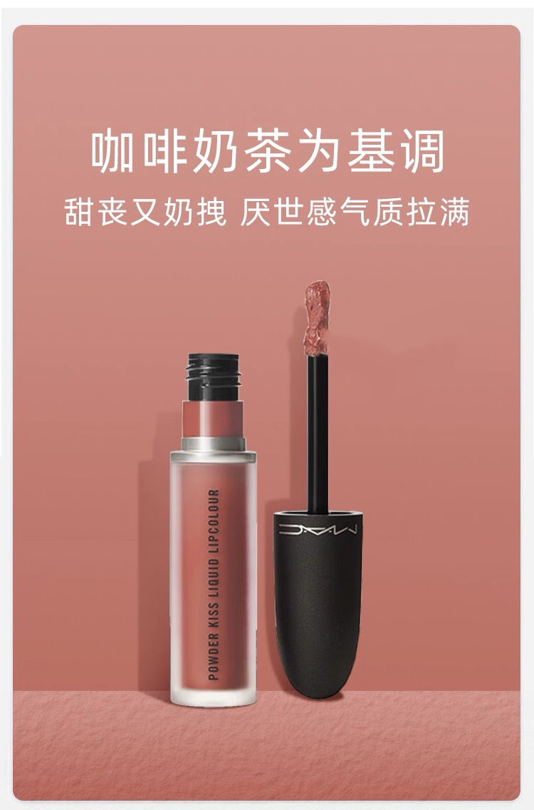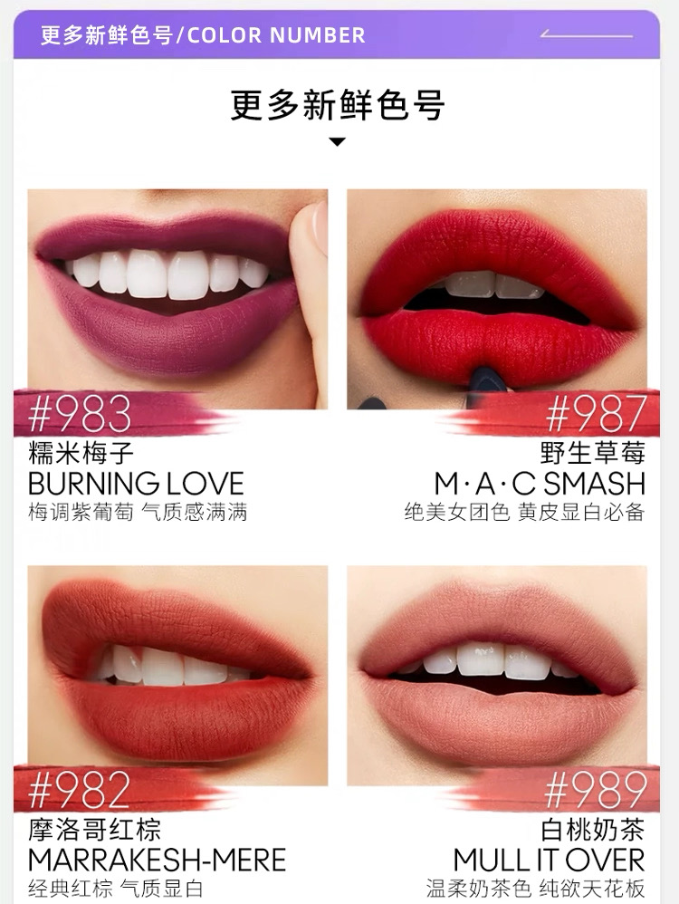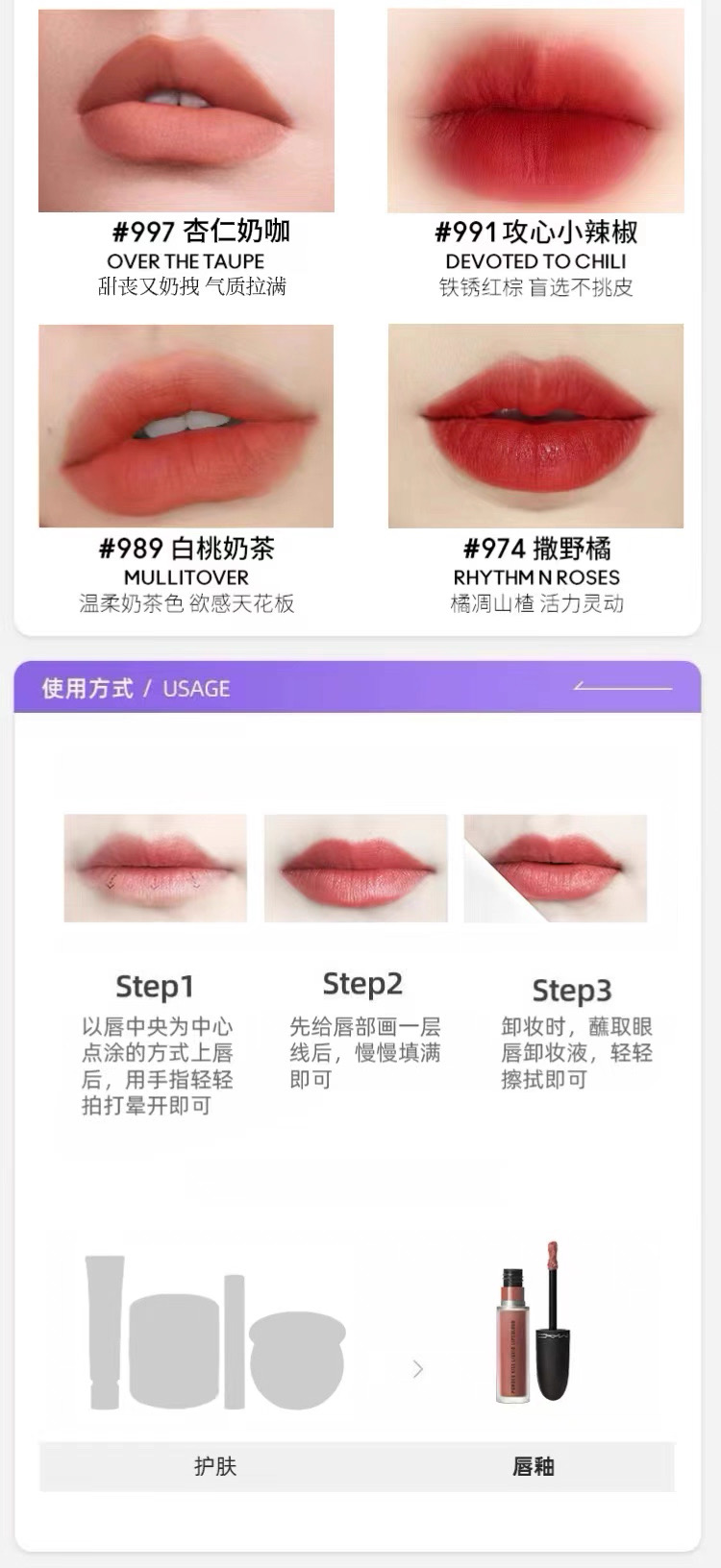 MAC魅可子弹头柔雾丝绒唇釉小样2.5ml 采用水雾胶囊粉末科技,打造轻盈柔雾妆效,持色长达10小时,匿唇纹零唇感