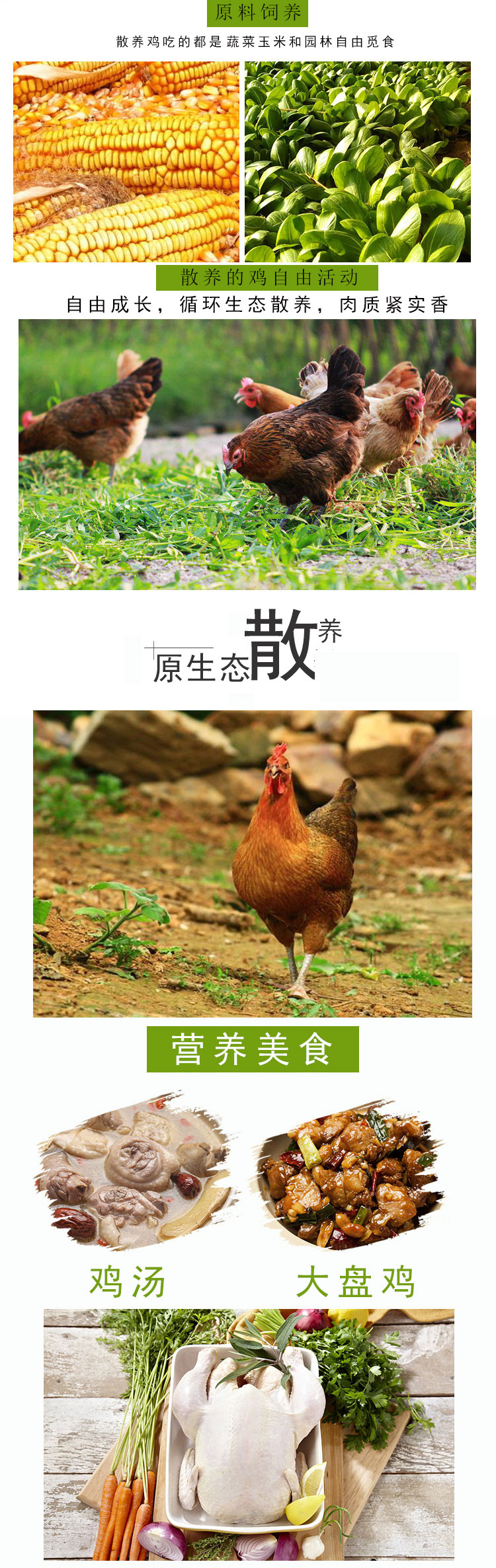 农场规模和养殖过程 农场不大,在山脚下,鸡主要以产蛋为主,1年以上的鸡,由于产蛋率下降,会自然淘汰成散养柴鸡进行售卖,总共鸡的养殖容量在2000只左右(鸡苗交替时节一般会在3000-4000只)。 养殖过程中,不使用外面售卖的成品添加剂饲料,完全是村里收购来的玉米,豆子,经过碾压、磨碎后给鸡食用,夏天由于山间有青草虫子,鸡的食物来源较多,冬季我们会给鸡增加胡萝卜、白菜等蔬菜。 山是一对老夫妇承包的,他们两人终年在山上,不会使用任何防疫措施(比如给鸡扎针之类的),完全按照土办法进行养鸡。所以,安全方面,敬请放心。 母鸡品相说明母鸡大部分有乌鸡血统,大部分是下绿壳蛋(少量粉壳蛋),市面上比较少见,难以作假。因此,鸡屠宰后,大腿和翅膀部分会发黑,有的鸡身体也会是黑皮,只是因为有乌鸡血统的原因,不是病态,如果您非常介意,请慎拍。 由于担心鸡会坏掉,一般会采用冷冻方式进行配送(尤其夏季),因此,想要冷鲜鸡的朋友,请一定提前沟通,仅限冬季可以提供冷鲜配送方式。 鸡是采用家庭屠宰模式,不是大规模屠宰场的那种,不会采用沥青进行脱毛处理,可以放心食用,外包装是简单的真空塑料包装。不是豪华礼盒模式。想买绿壳鸡蛋的朋友,请点这里 绿壳鸡蛋链接:关于配送问题,请关注由于没有使用任何激素,鸡完全按照自由的方式产蛋,因此,在冬季和夏季产蛋量会下降,届时,我们会尽量少杀鸡,在优先配给会员的情况下,不能保证您拍的鸡随时都能配送到,所以拍鸡时,如果方便,请与客服沟通,以确保不耽误您食用! 配送时间安排: 1、周一中午之前拍下的订单,我们会安排周二当天送达; 2、周四中午12:00之前拍下的订单,我们会安排周五当天送达。 彩虹雨的配送人员,大部分是自己开车配送,不是普通的圆通、申通快递,因此,请您尽量保证家里留人,手机开机,以免因为您这一家影响到其他家的配送,也非常感谢您的合作!!农场照片 照片是冬季照的,山上略显萧瑟,但这就是鸡的自然生长环境,农场这一对老夫妇,是住在简易房子里面,冬天比较冷,但鸡和鸡蛋确实是原始的味道,也希望在大家的鼎力支持下,他们的鸡场会越办越好