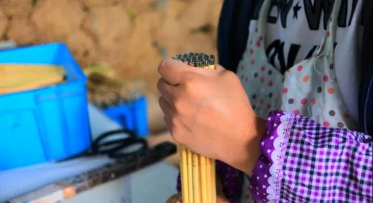 挑选已经脱脂和锯好的筷坯,经历磨头、砂光、烙花、抛光、打孔、上头、检验等步骤,一双天竺筷才得以诞生。“匠人给予生命,文人给予灵魂。”这一双天竺筷,在孩子们的手中已经被赋予生命和灵魂。