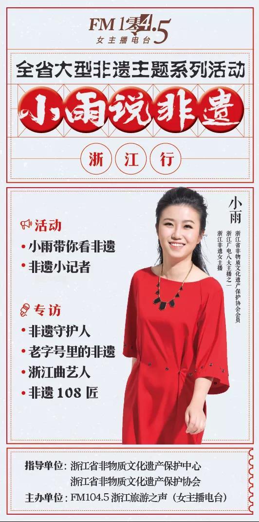 我国的非物质文化遗产种类非常丰富,它们是地域历史和文化传承的重要见证和载体。但是,多数非遗项目都面临着后继乏人的窘境。为了守护文化国宝,让中国传统文化得以发扬光大,FM104.5知名女主播小雨,开设了《小雨说非遗》栏目,采访和调查了浙江省内一大批的非遗项目。